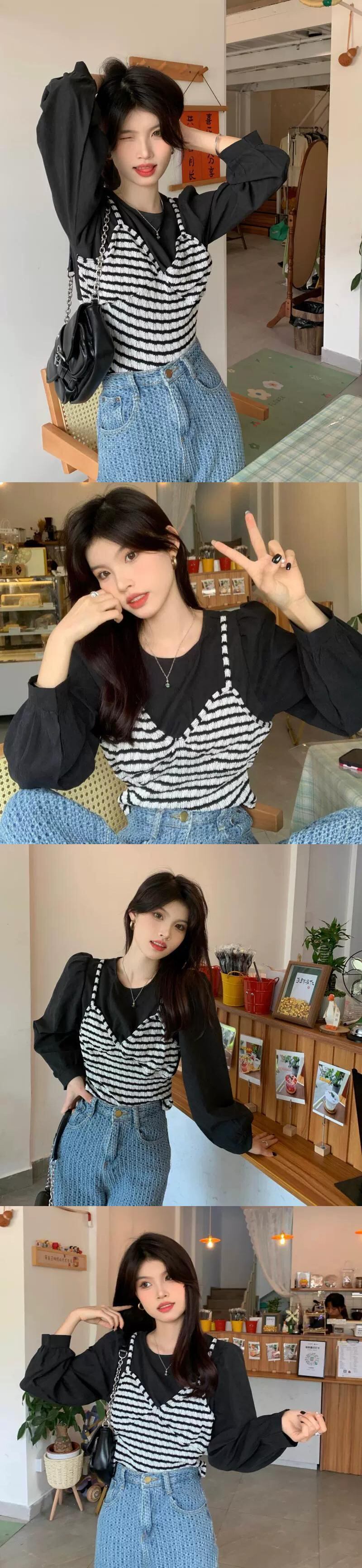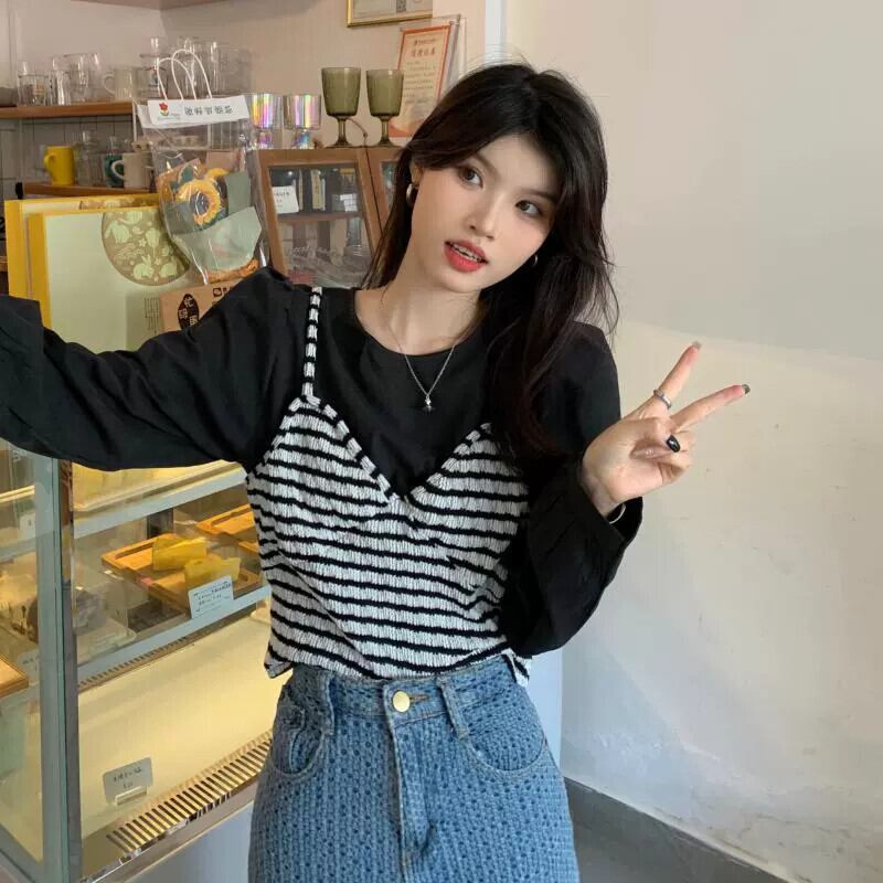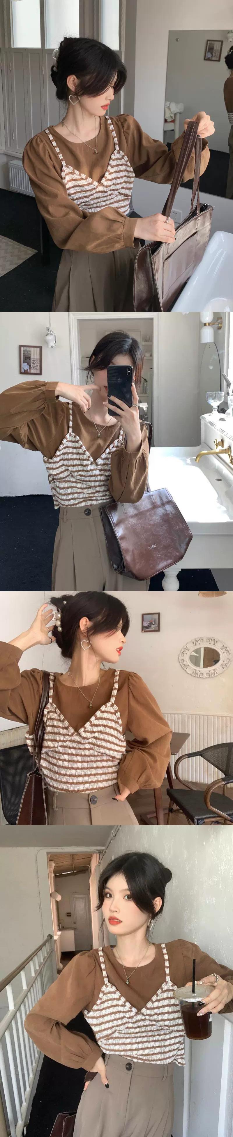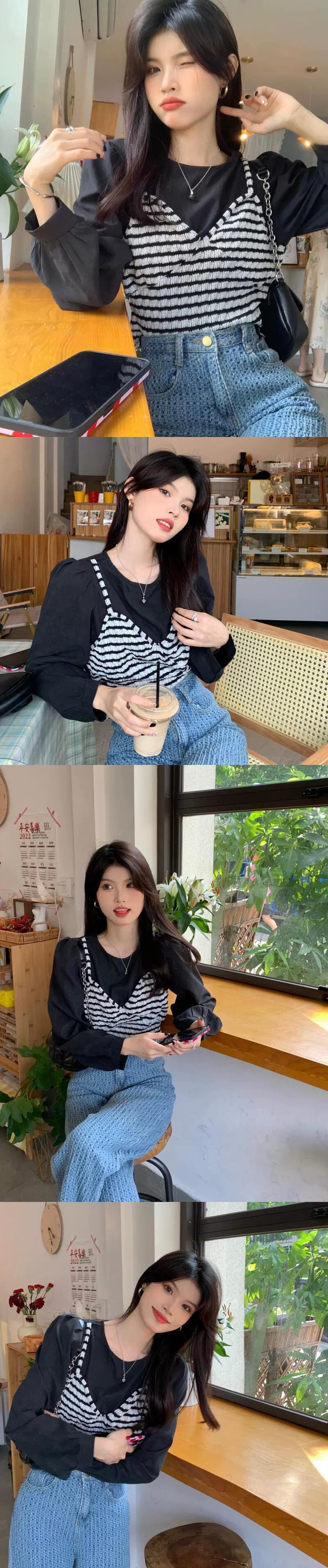 パフスリーブフェイクツーピースショートトップ婦人服デザインセンスニッチ2023秋新作小さい長袖シャツ ロング オータム 秋物 8571668323388014