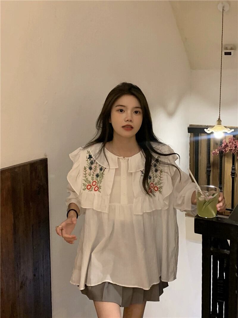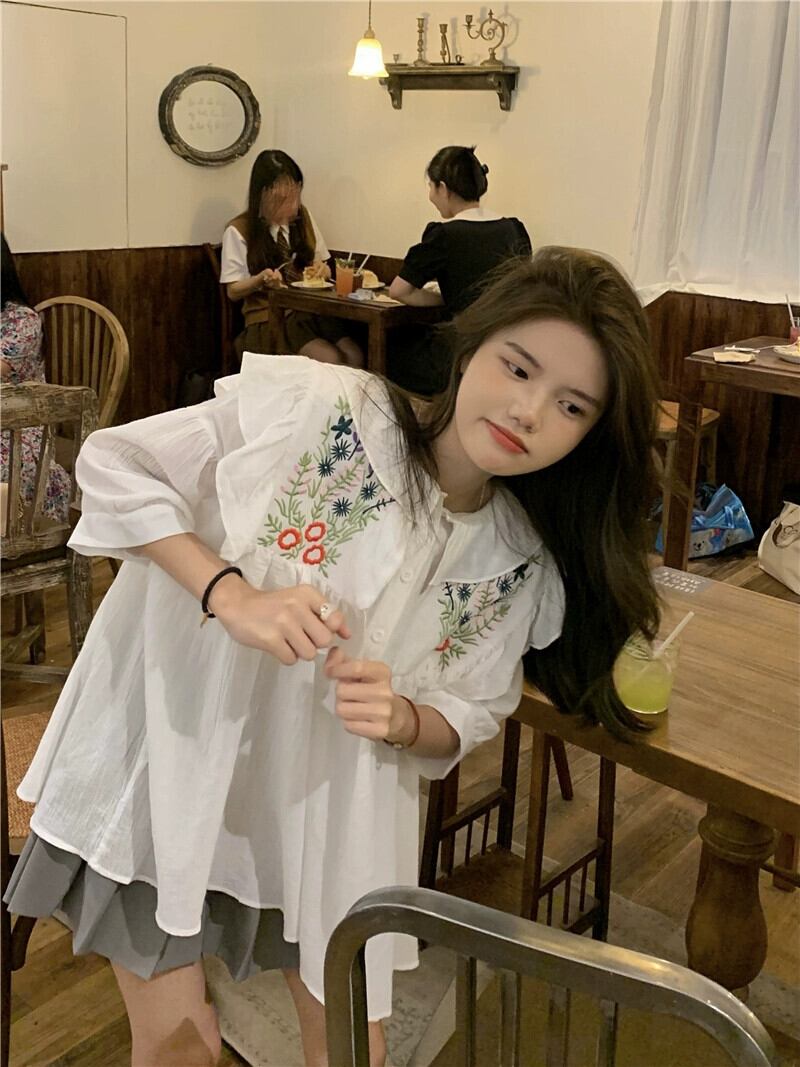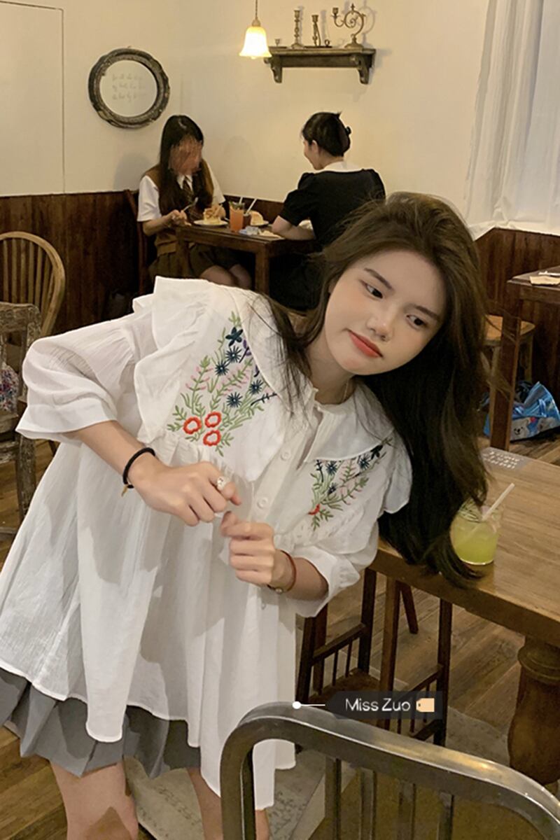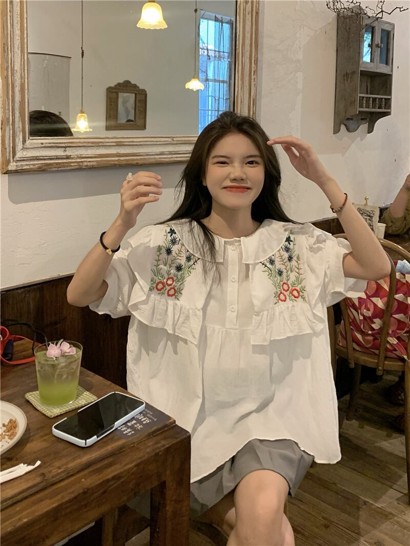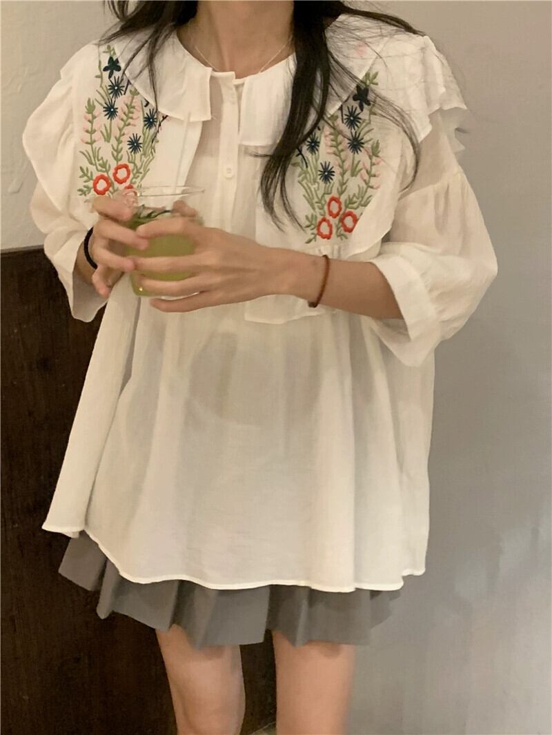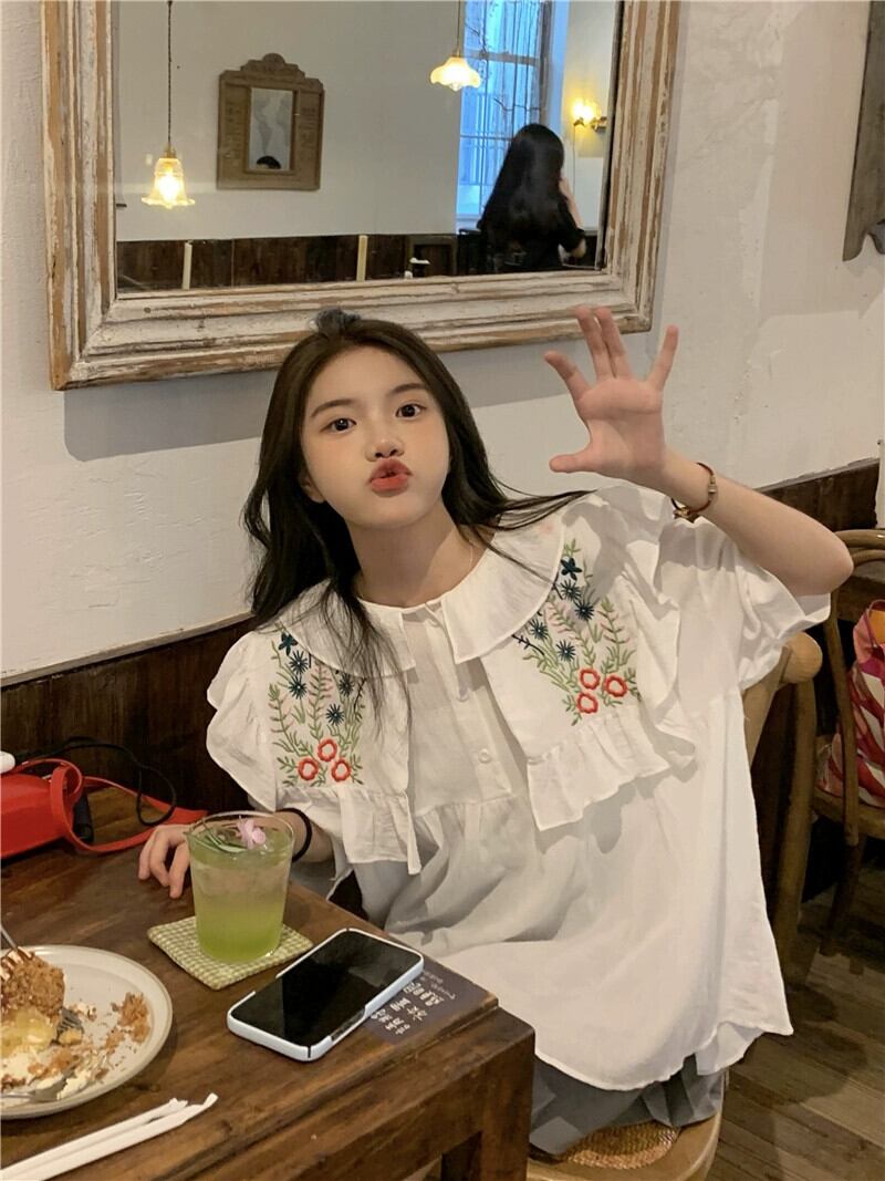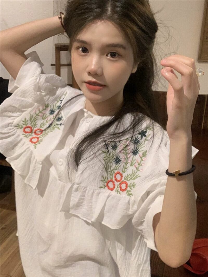 重工業刺繍ネイビーカラートップ女性の夏の感覚小さな小さな新鮮な甘い森コットンリネン半袖シャツ レッド 大人ガーリー スウィート キュート カジュアル サマー 夏物 8571650475739716