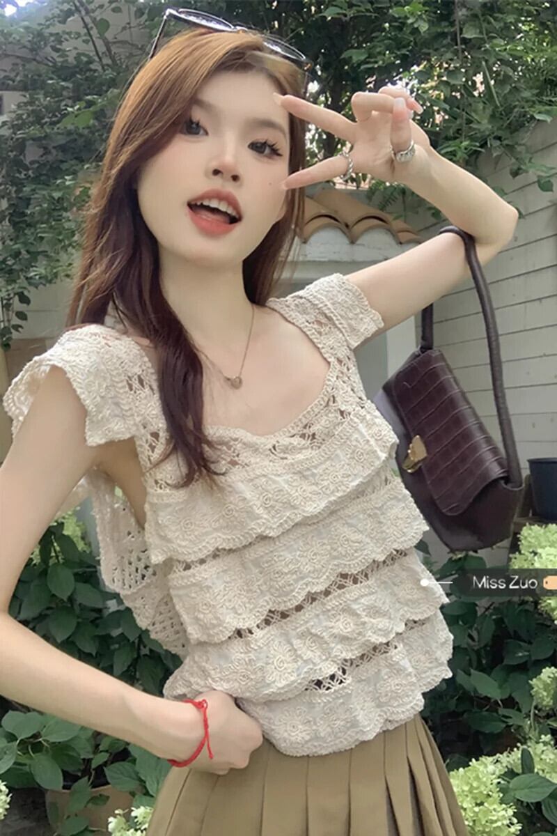 アプリコットレース中空ベストレディースアウター夏インナーフレンチスタイルの美しいデザインセンスニッチショートノースリーブトップス 半袖 ハーフスリーブ サマー 夏物 8571660906426429