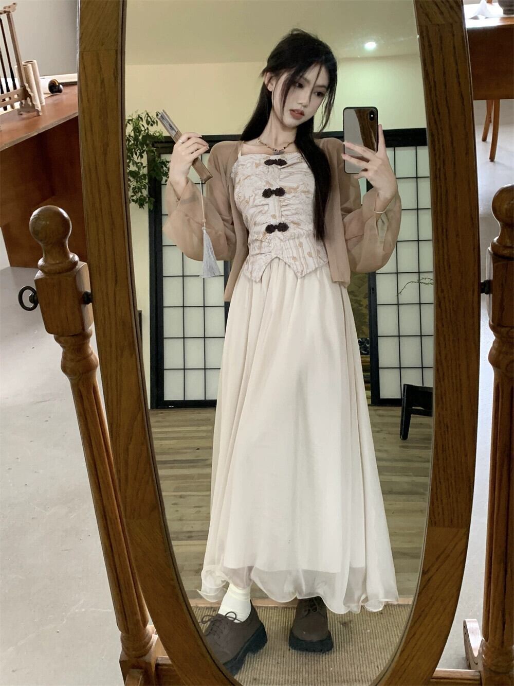 色:コーヒー色のカーディガン,アプリコットスカート,バックルスリング