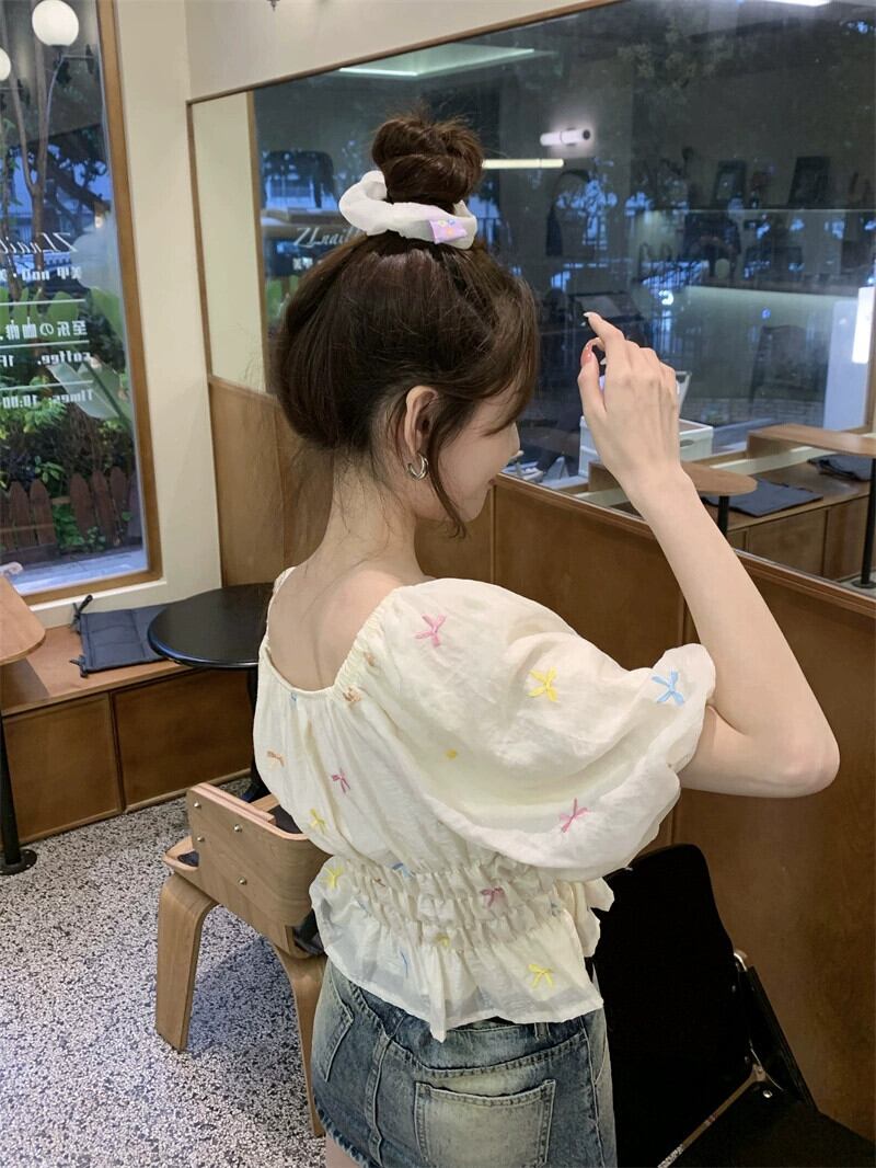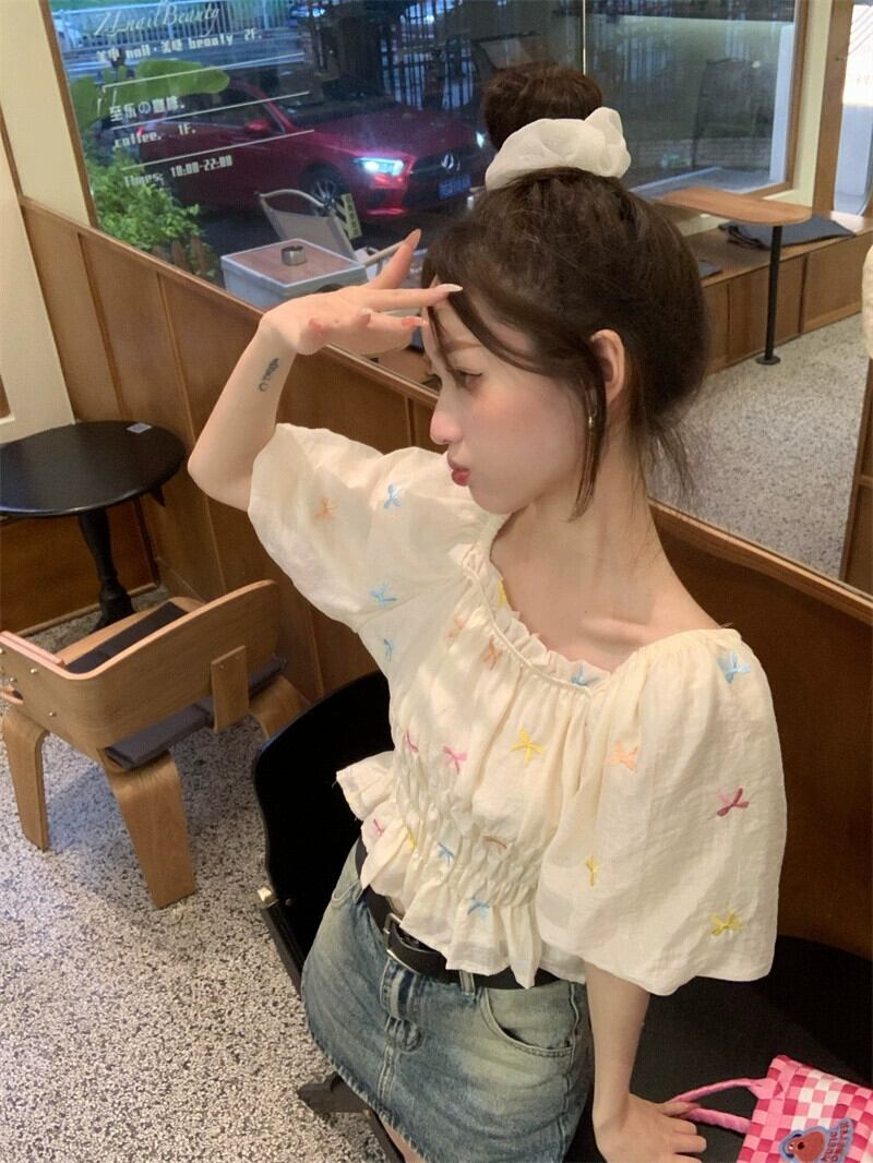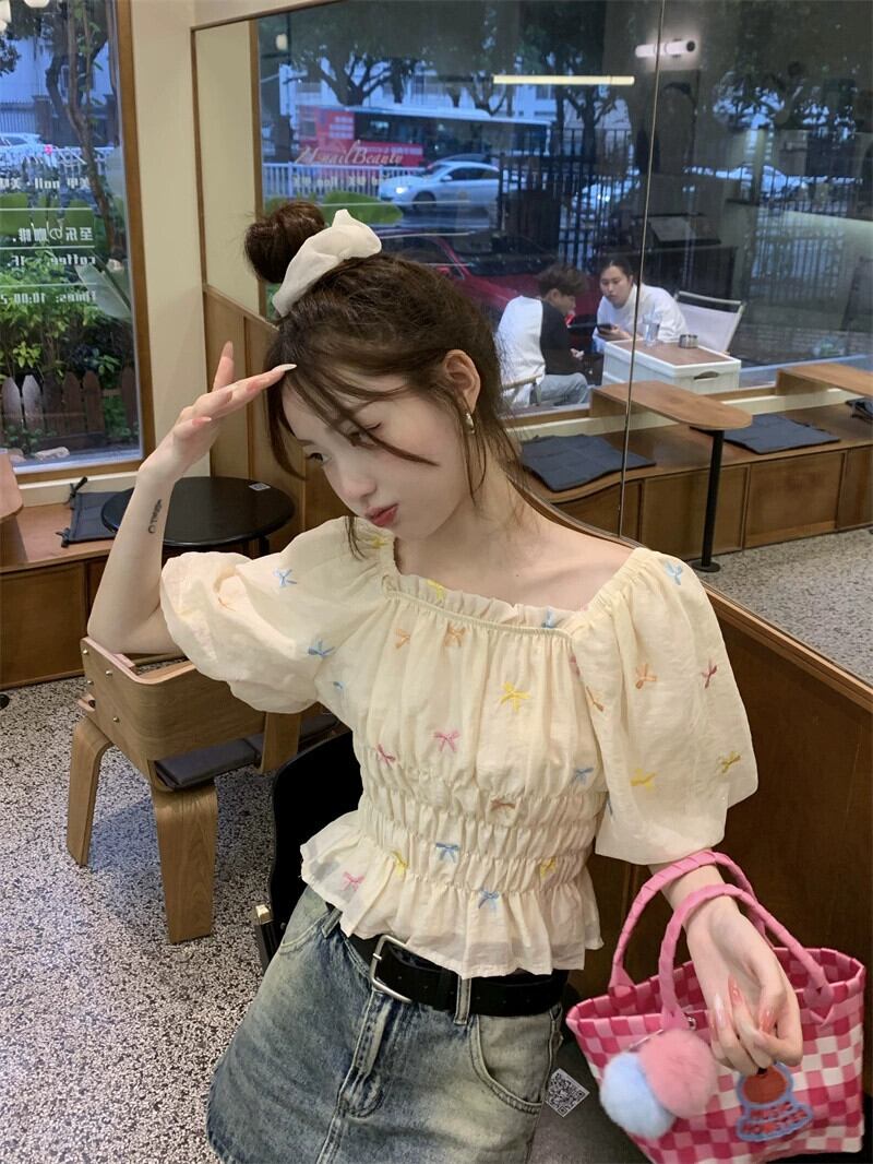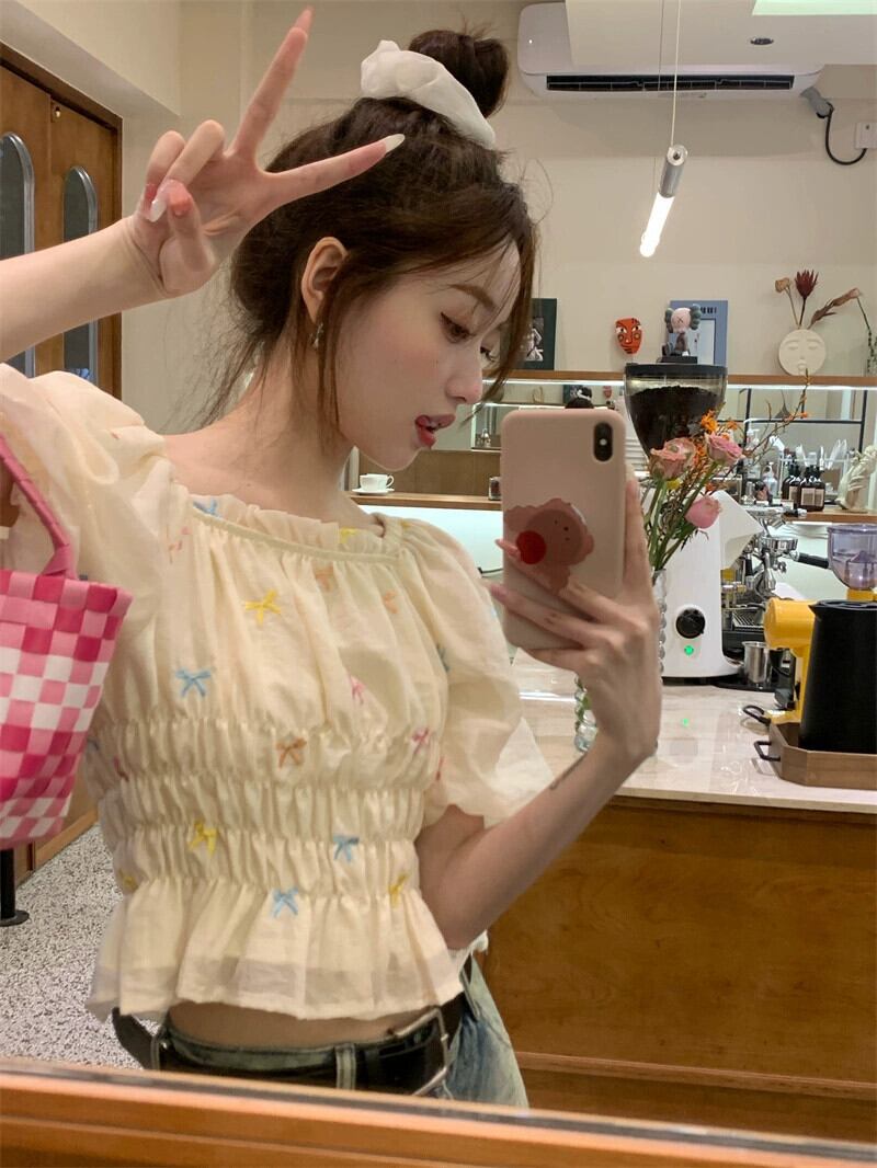 パフスリーブウエストショートトップスレディース夏デザインセンスニッチ甘くて美しいリボン半袖シフォンシャツ 大人ガーリー スウィート キュート カジュアル サマー 夏物 8571678403791488
