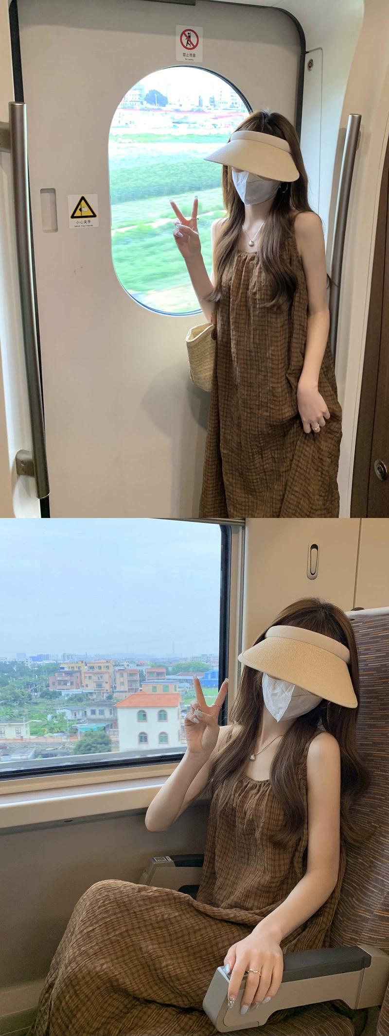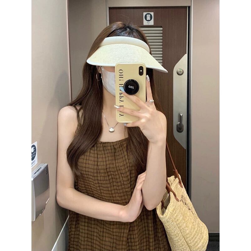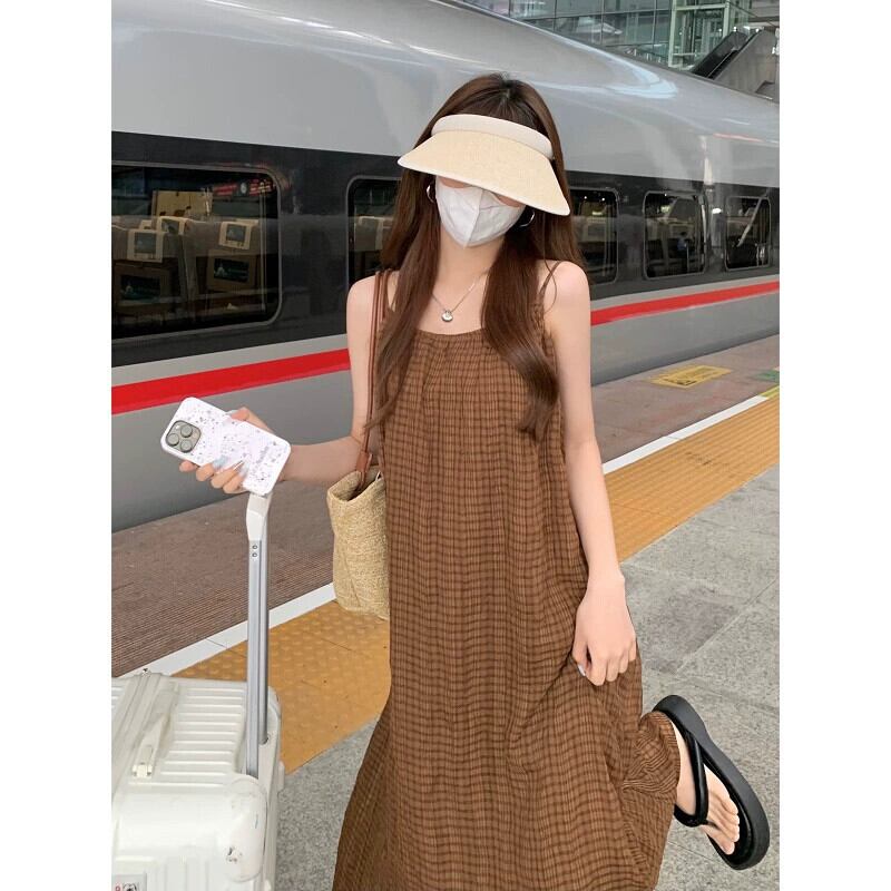 コーヒー色のチェック柄サスペンダードレス女性の夏 2023 新しい穏やかなスタイルのレトロな洋ナシ形の図休日ロングスカート サマー 夏物 8571683423540757