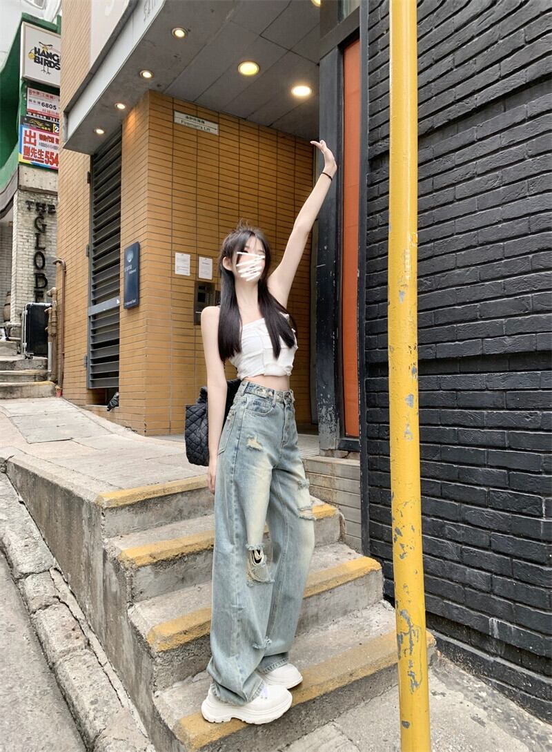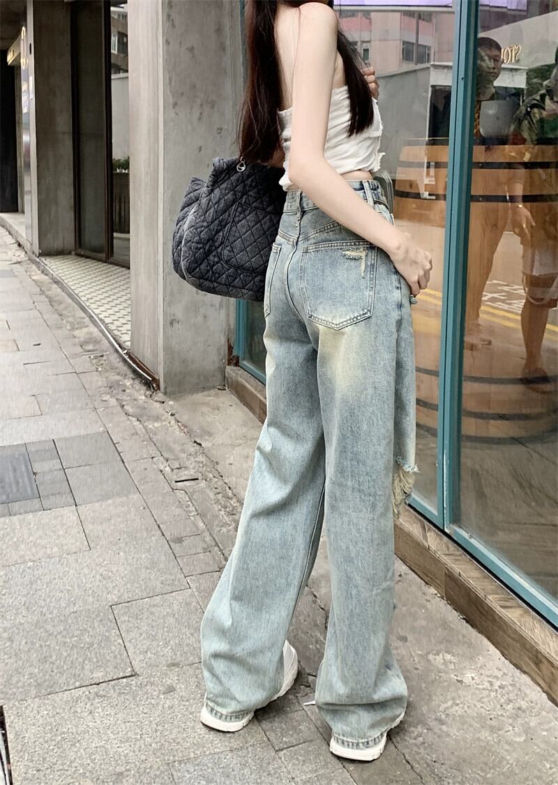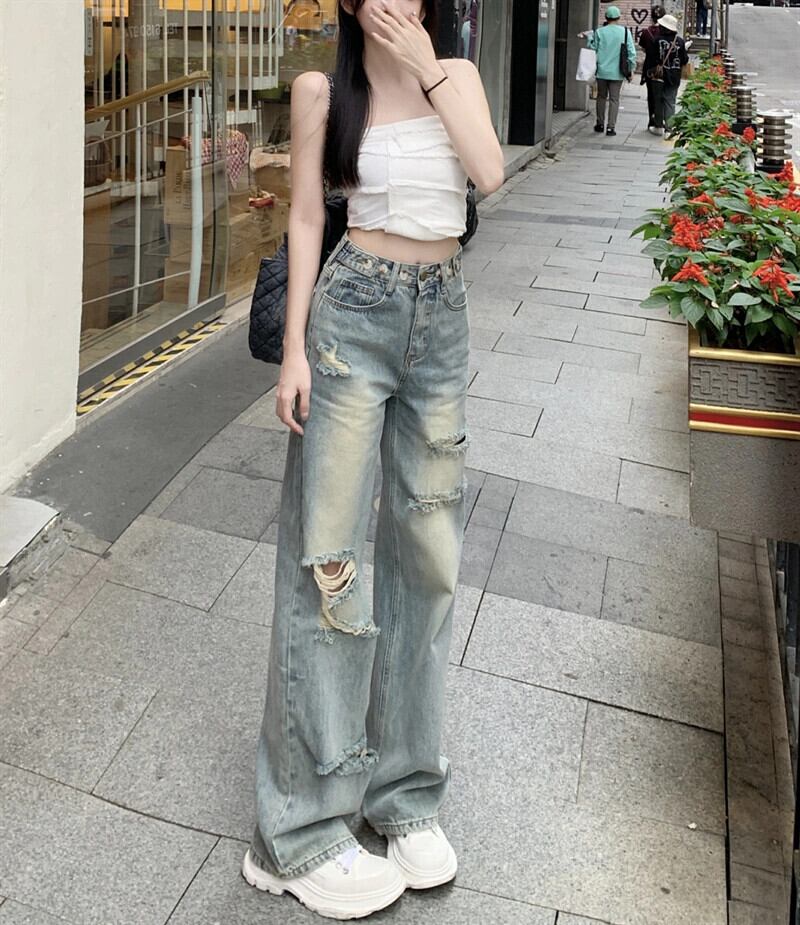 リップドジーンズ レディース ルーズストレート 夏 デザインセンス ニッチ アメリカン レトロ ハイウエスト フロアモップ ワイドレッグ ロングパンツ ハイウェスト サマー 夏物 ワイドパンツ 857165270588621