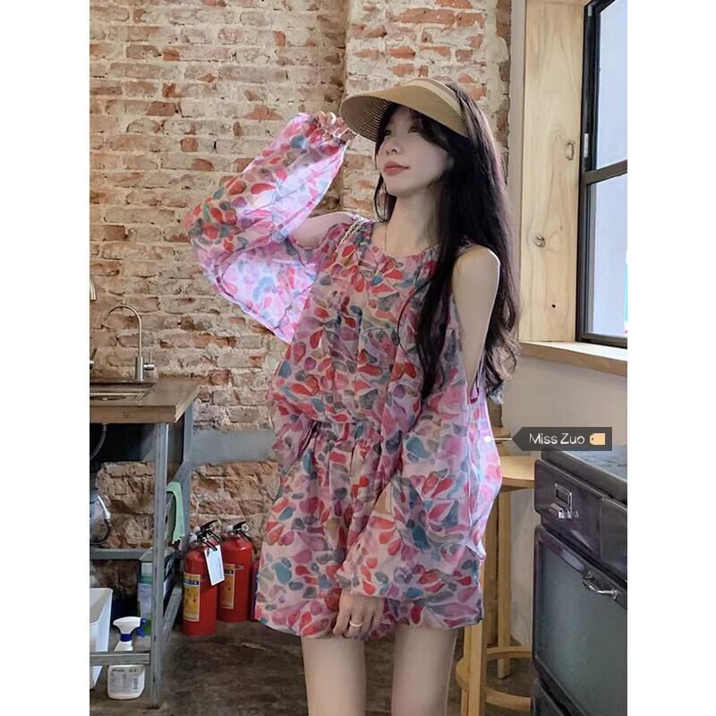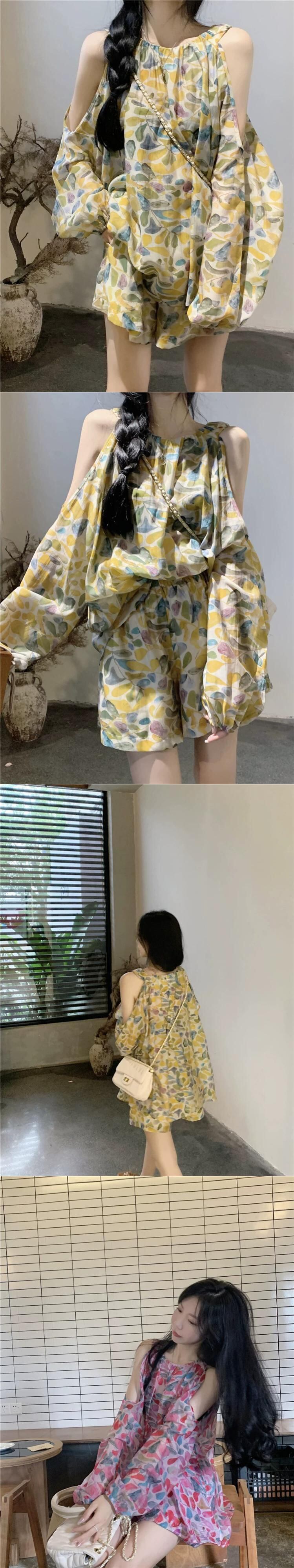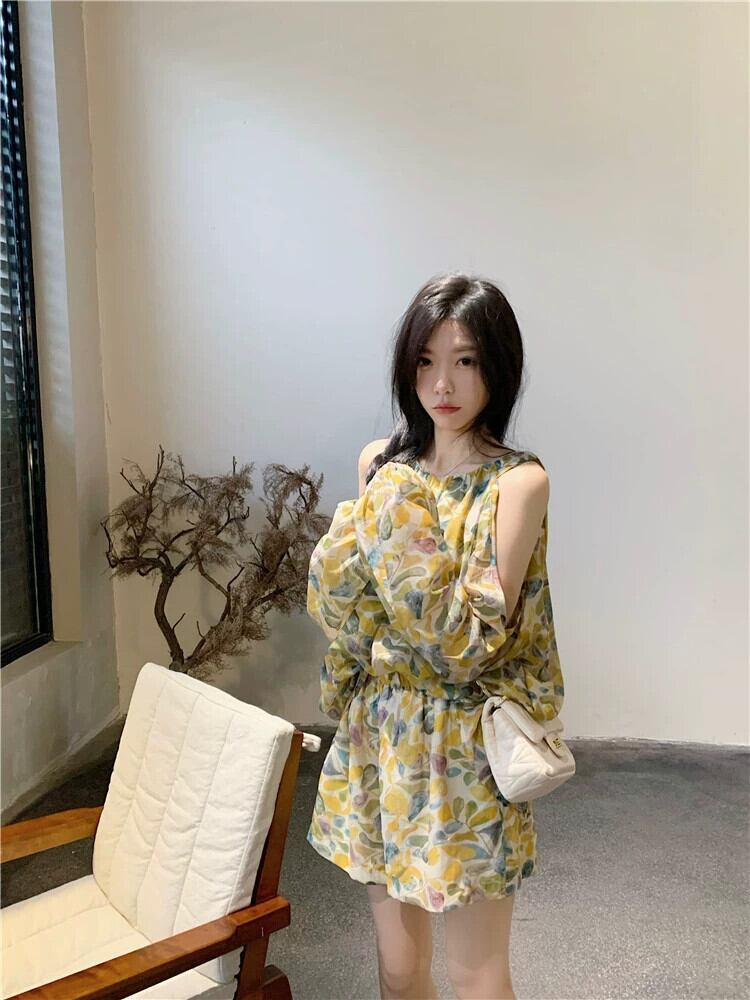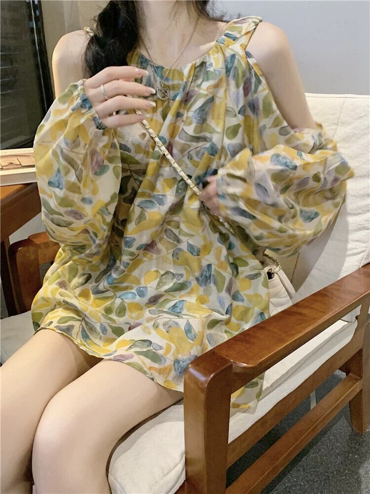 ホリデースタイルのオフショルダートップ女性の2023年夏新作フレンチスタイルの優しいシックな美しい長袖花柄シャツスーツ ロング サマー 夏物 857166244013142