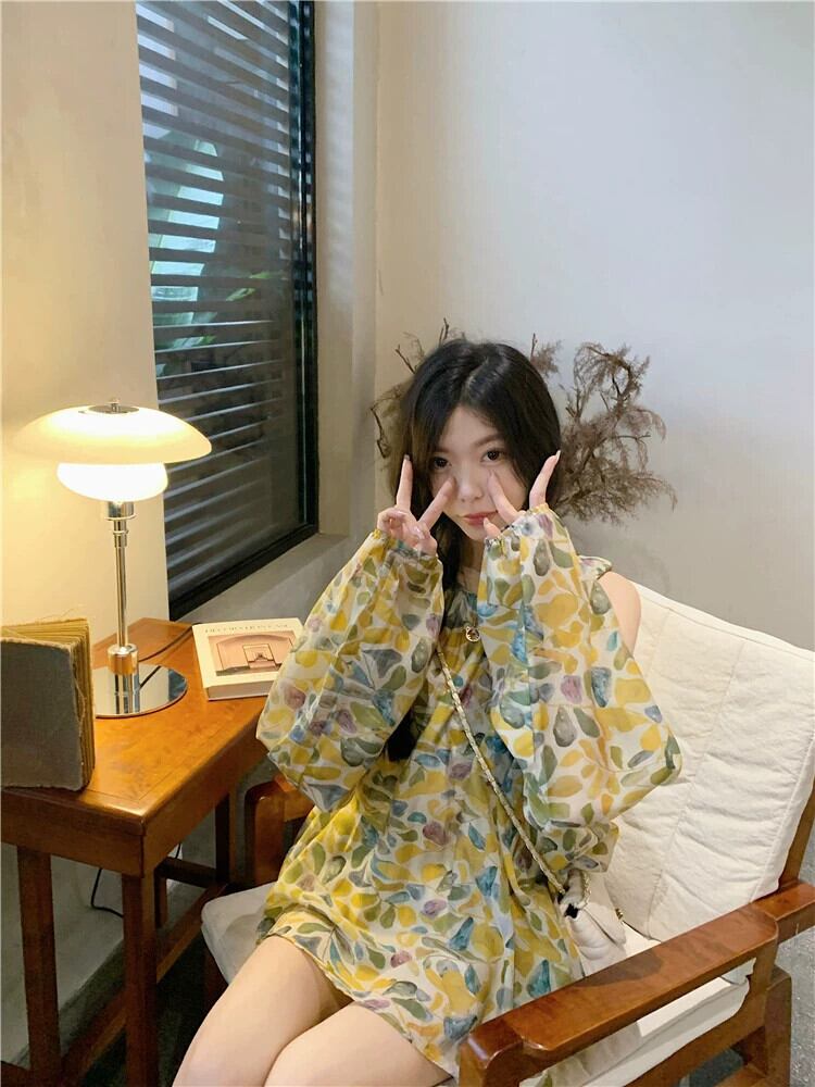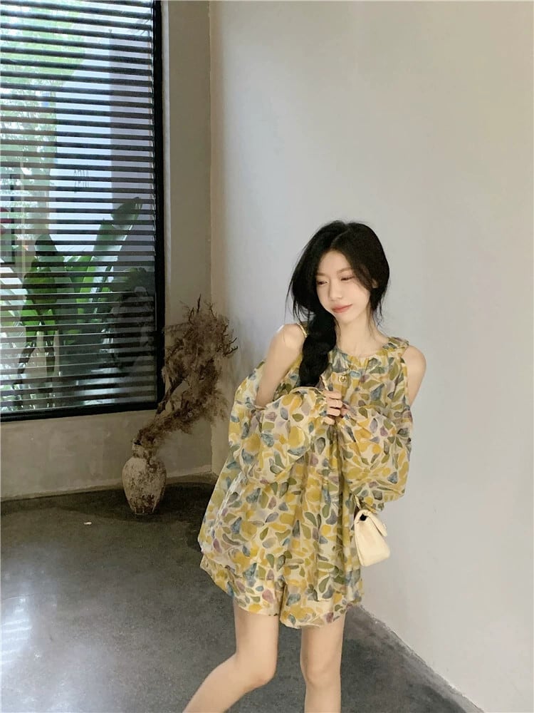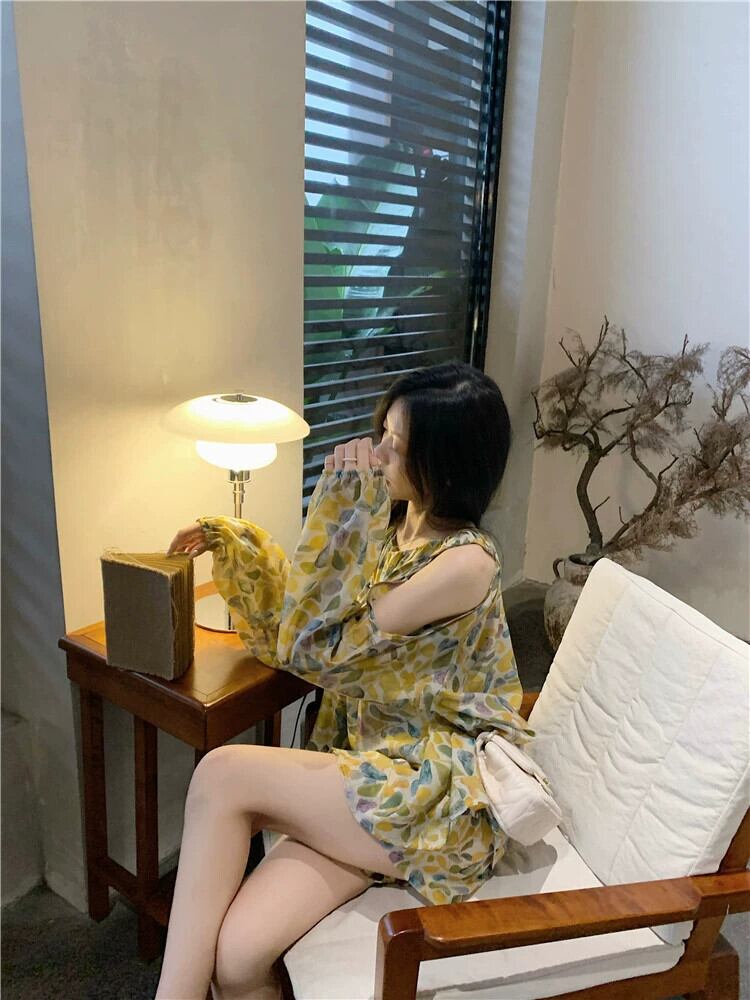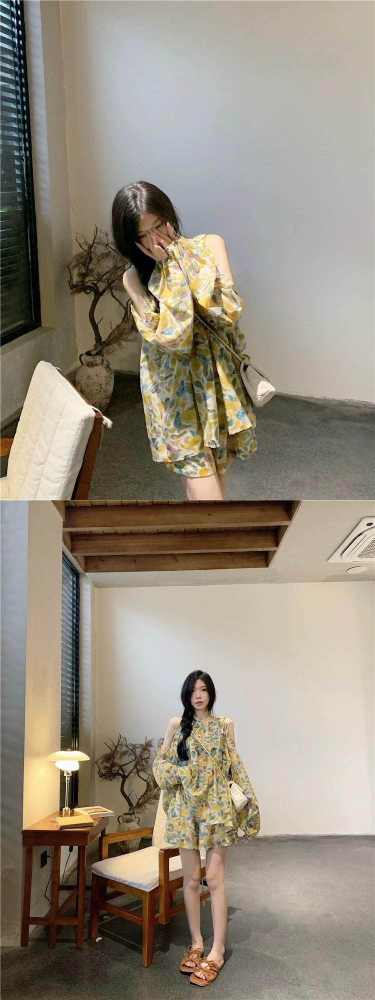 ホリデースタイルのオフショルダートップ女性の2023年夏新作フレンチスタイルの優しいシックな美しい長袖花柄シャツスーツ ロング サマー 夏物 857166244013142