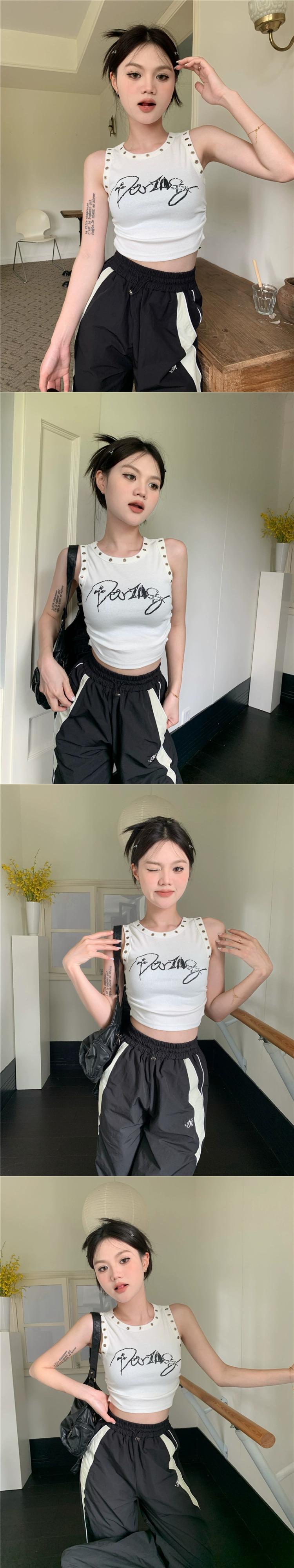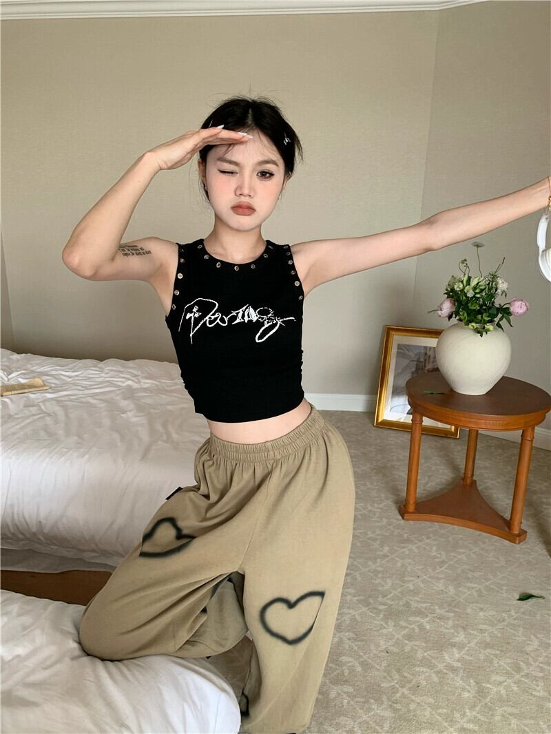 黒プリントベスト女性の上着ジャケット夏アメリカンレトロ甘いクールセクシーなノースリーブ Tシャツ小さなチョッキ ブラック 大人ガーリー スウィート キュート カジュアル サマー 夏物 8571660938418989