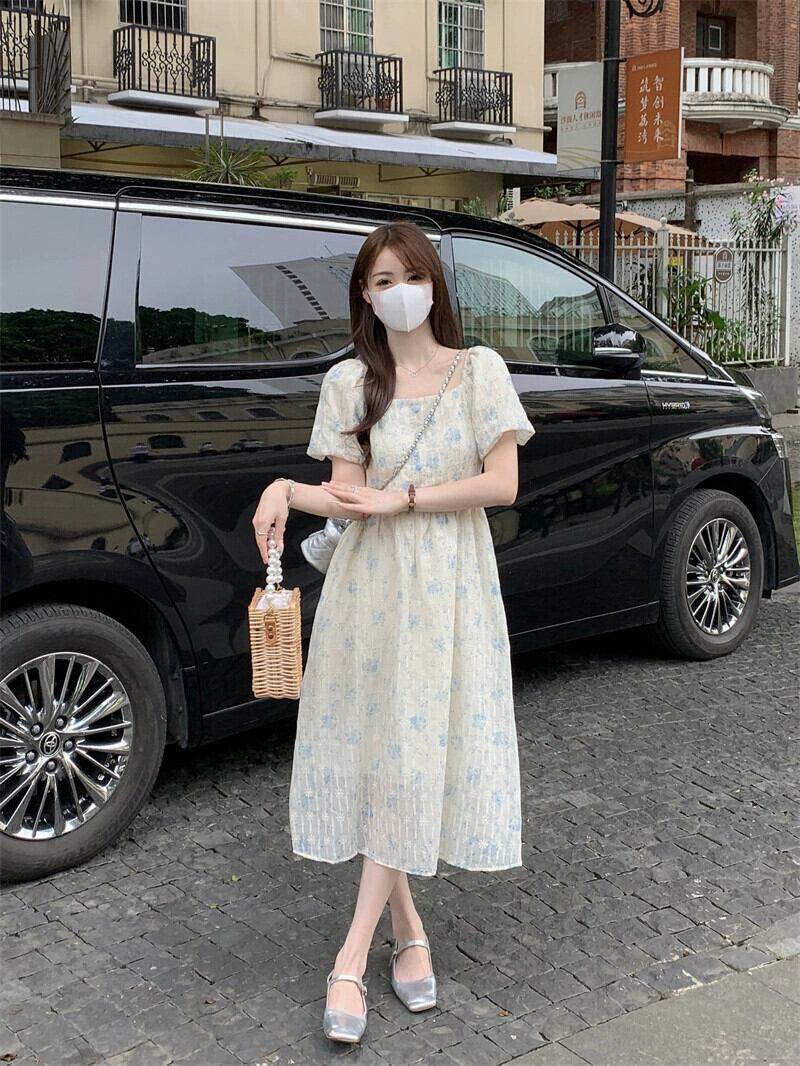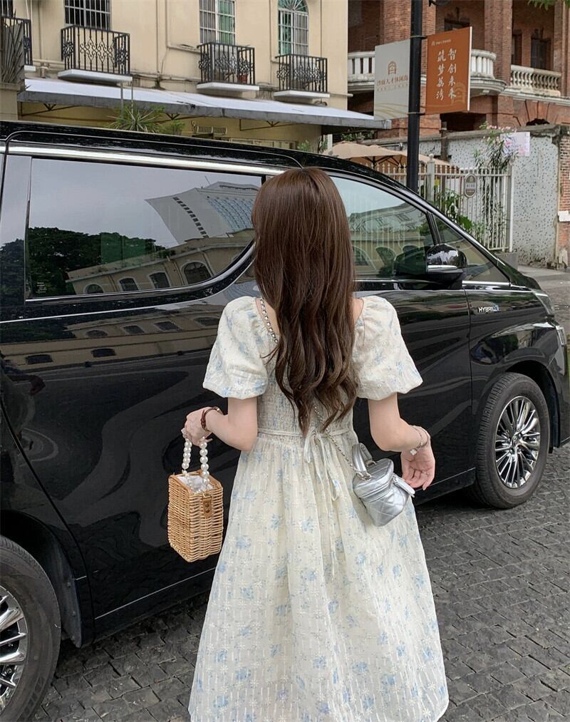 ブルー花柄パフスリーブドレスの女性の夏 2023 フレンチ優しいスタイルの気質ウエストスリムスカート サマー 夏物 8571691485840038