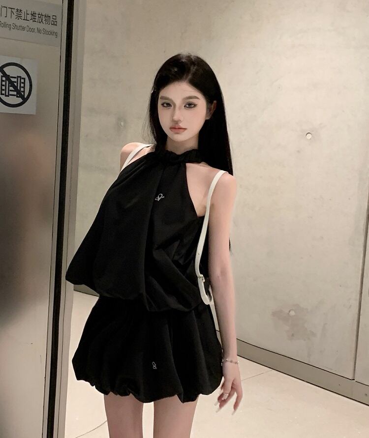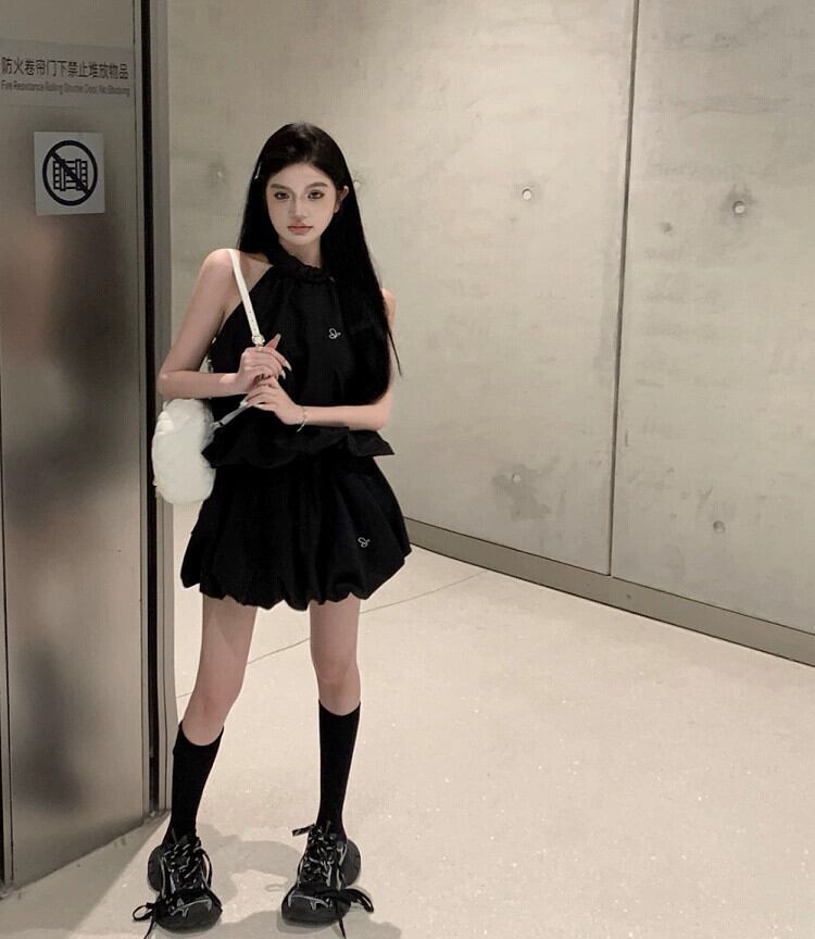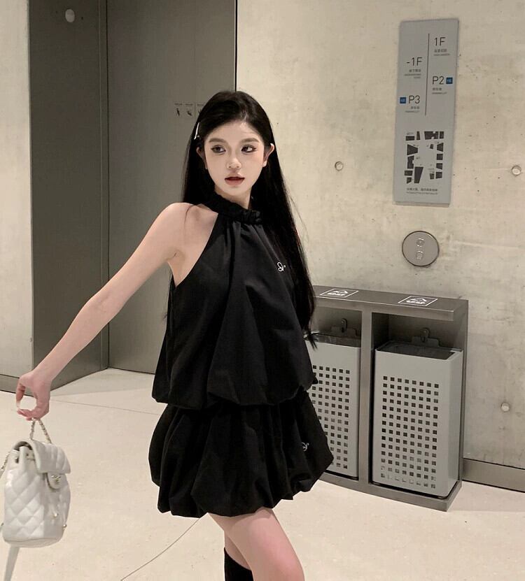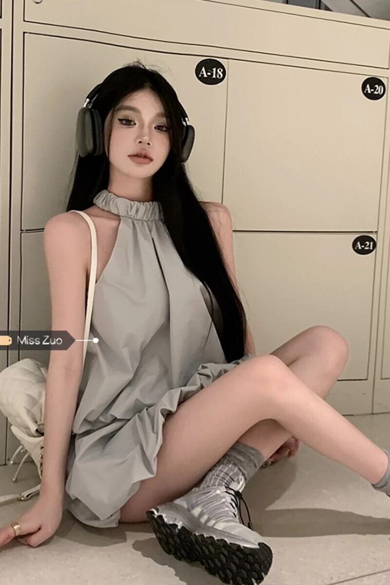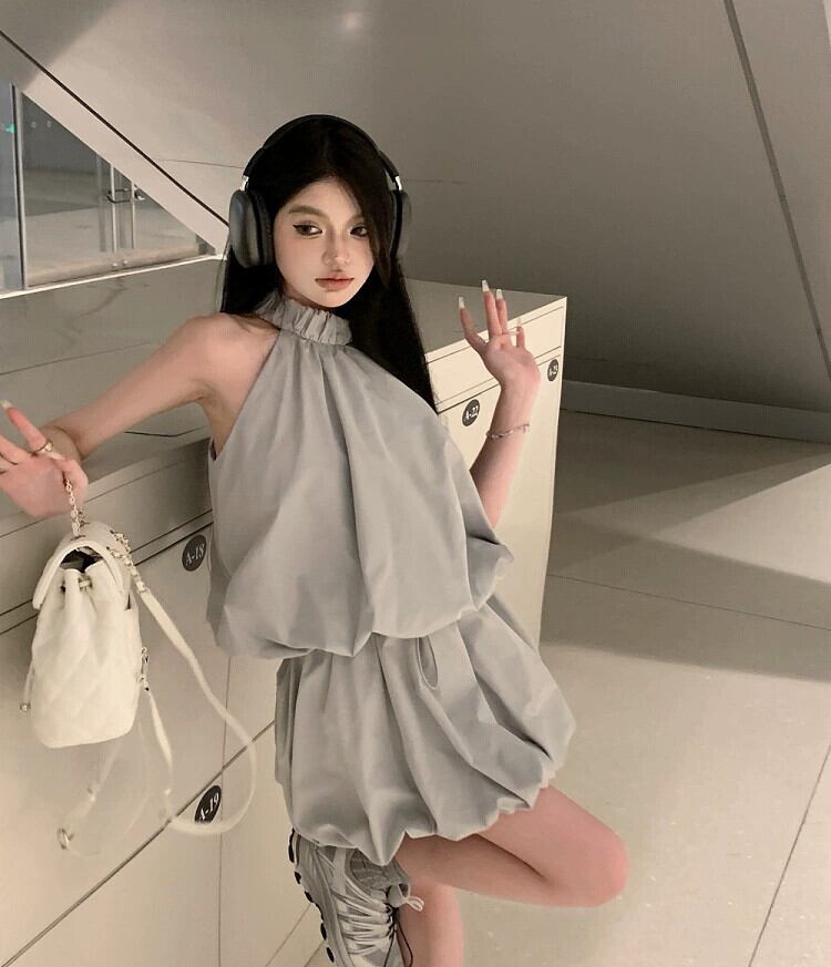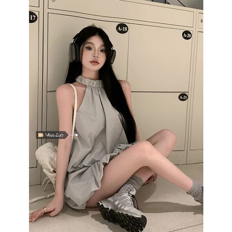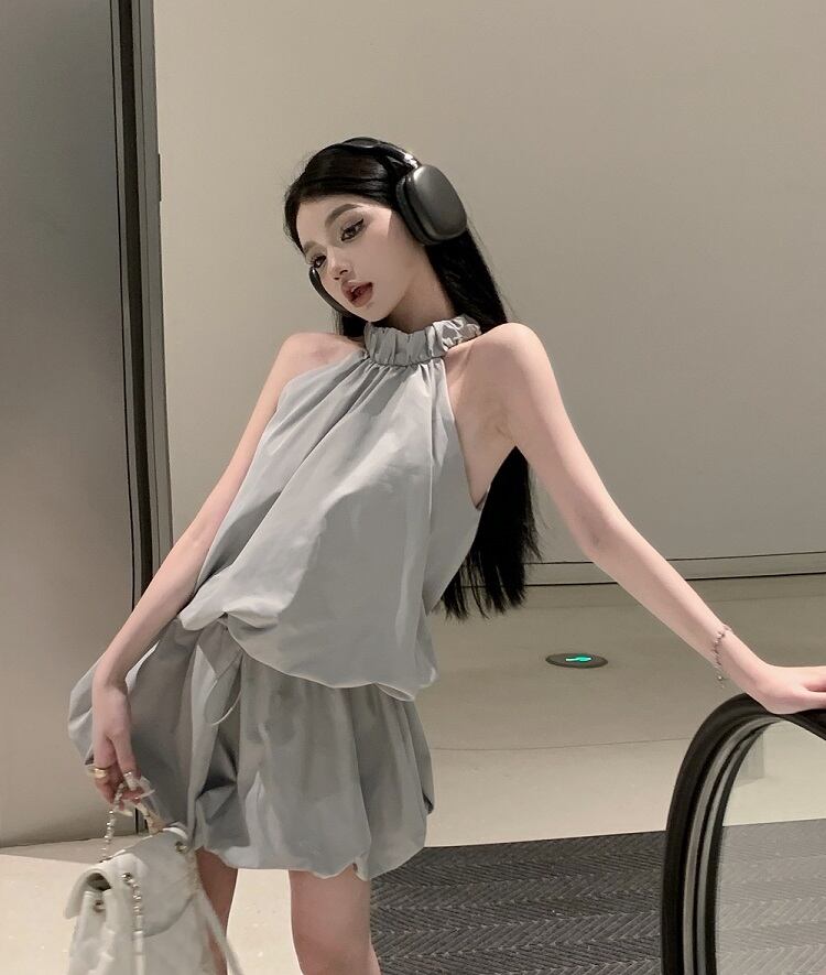 グレーの吊りネックベストレディースアウター夏デザインセンスニッチスイートクールセクシーバドトップツーピーススーツ 大人ガーリー スウィート キュート カジュアル サマー 夏物 8571642118766958