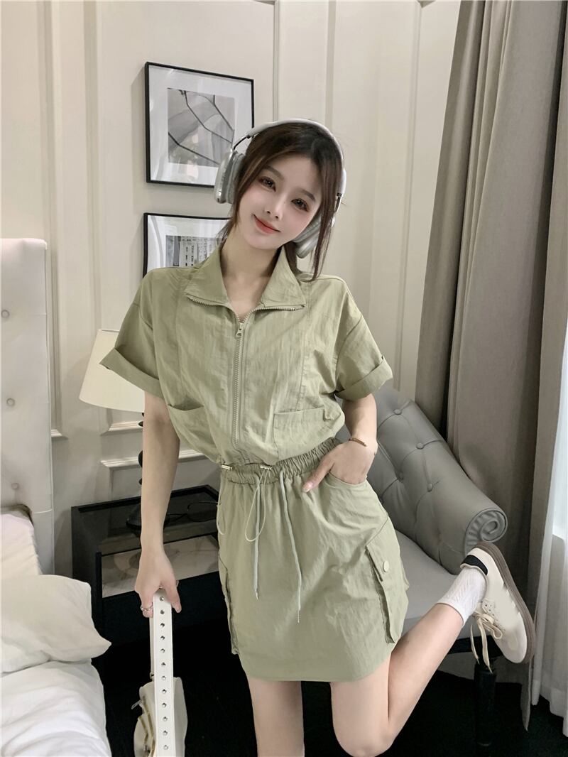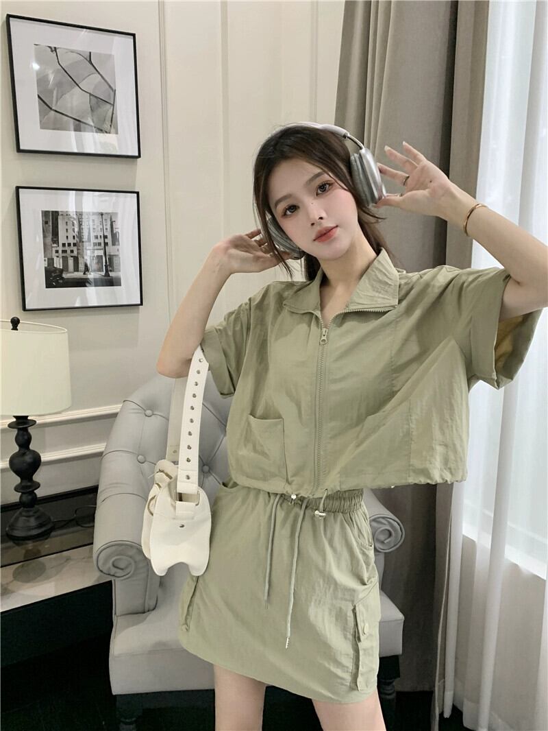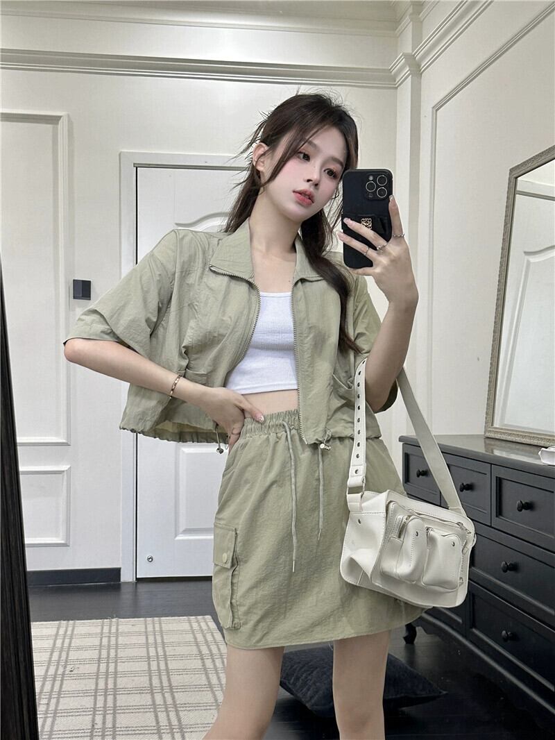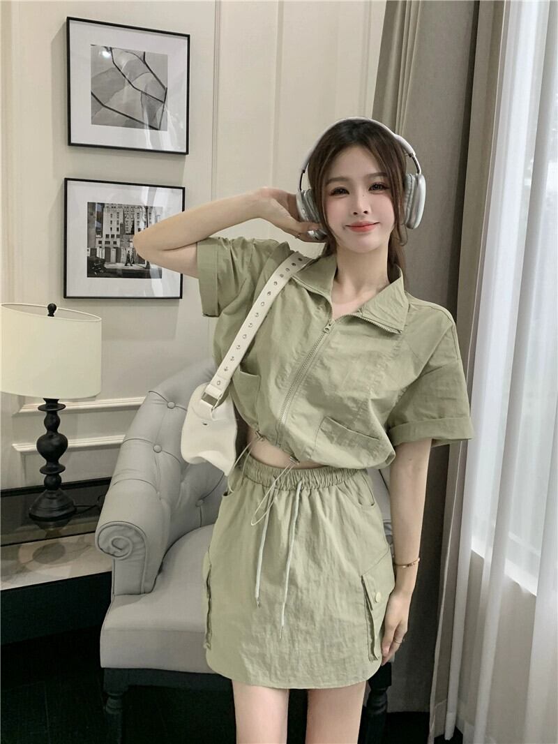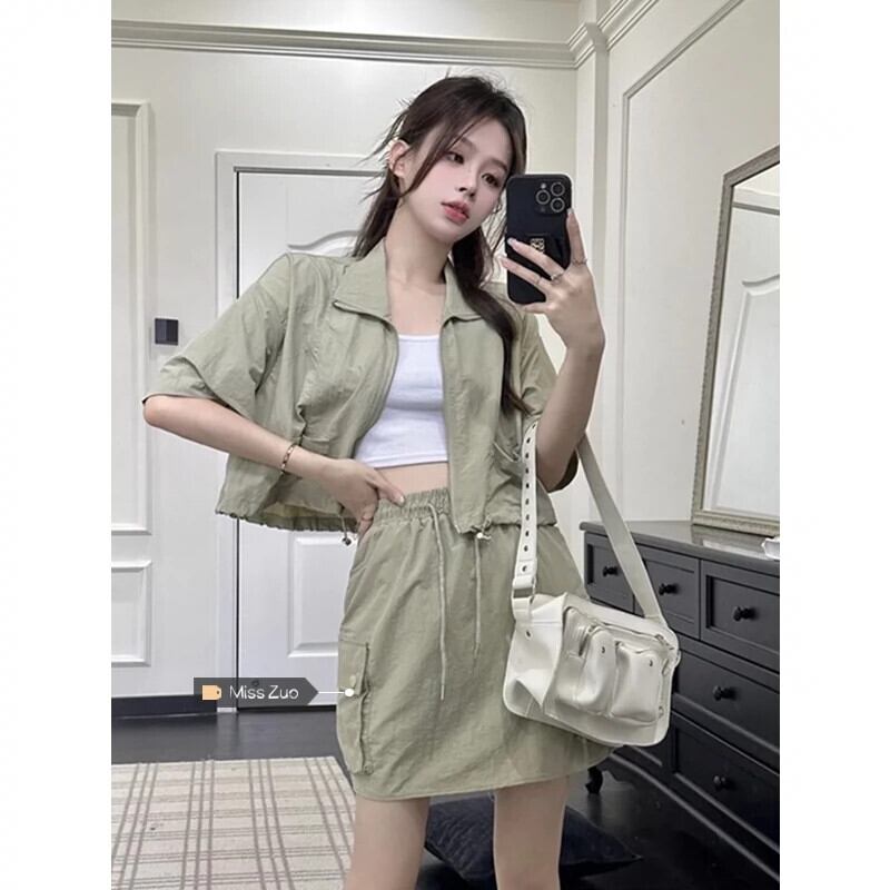 カーキカジュアルシャツジャケットレディース2023夏新デザインセンスニッチ気質ショートトップ2点セット サマー 夏物 8571645494347852