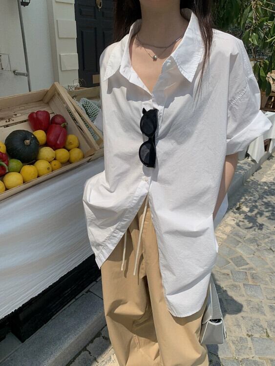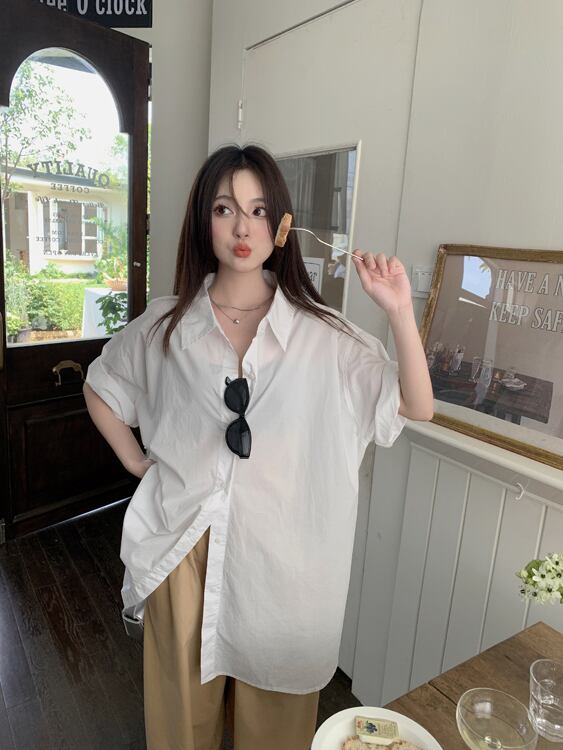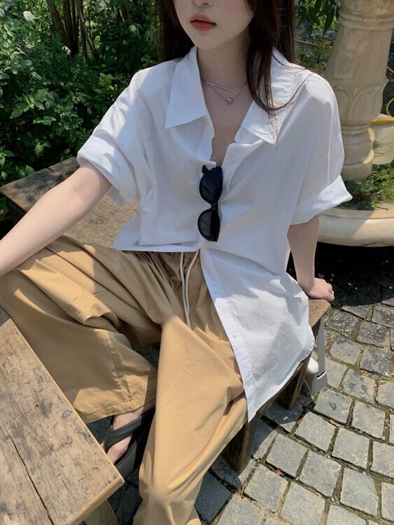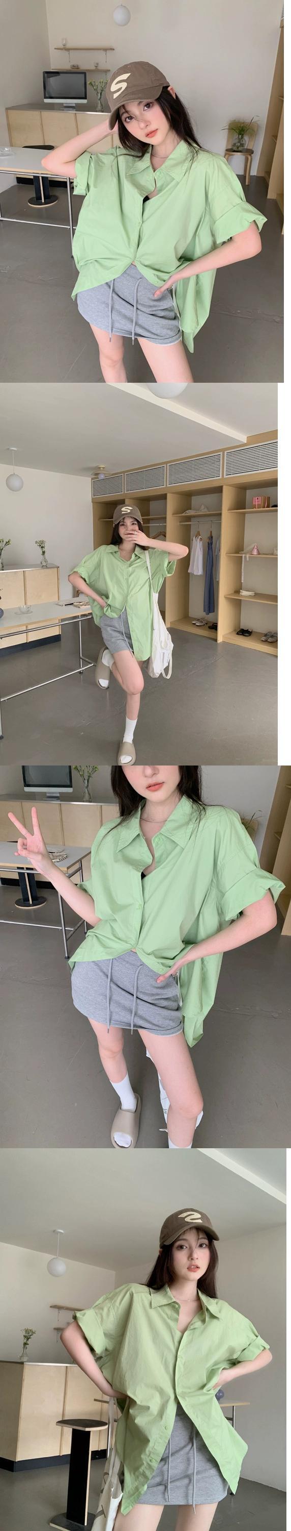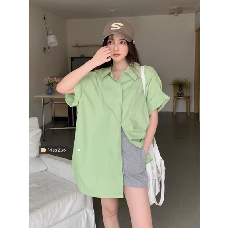 グリーン半袖シャツ女性の夏ミッドレングスポロカラーシャツ 2023 新しい緩い怠惰な風カジュアルトップ サマー 夏物 8571629708941947