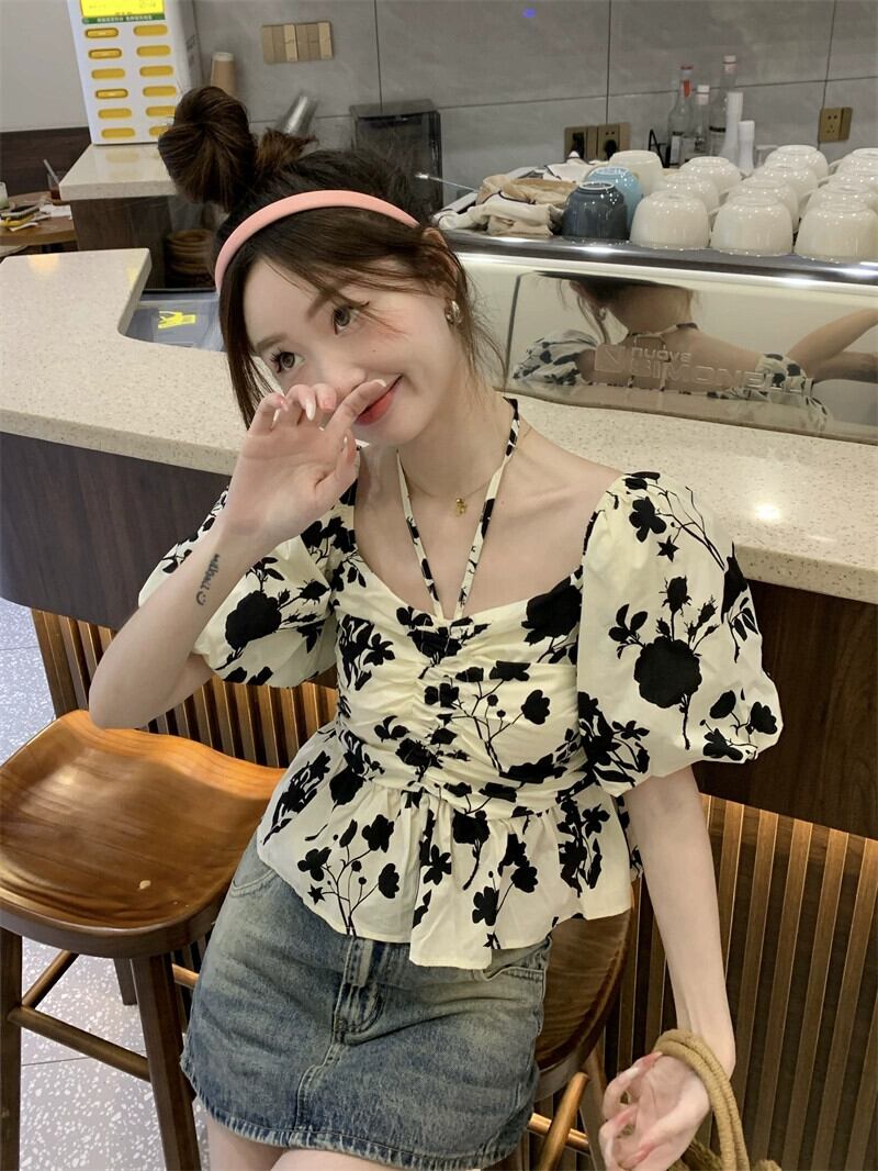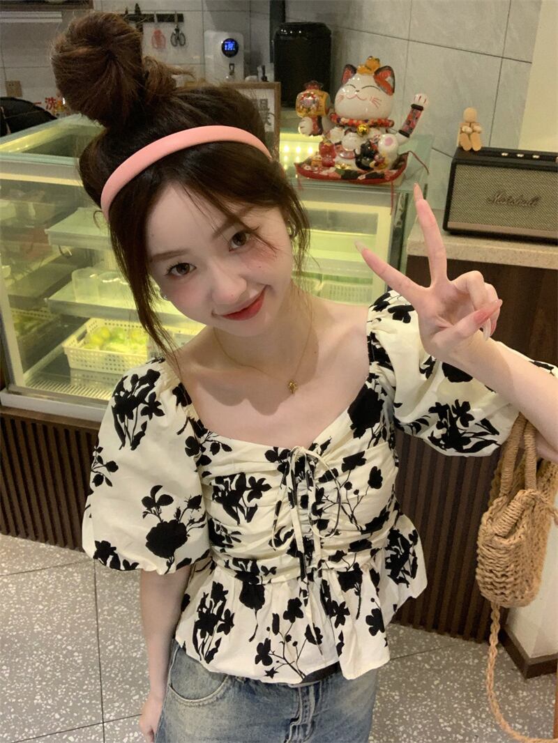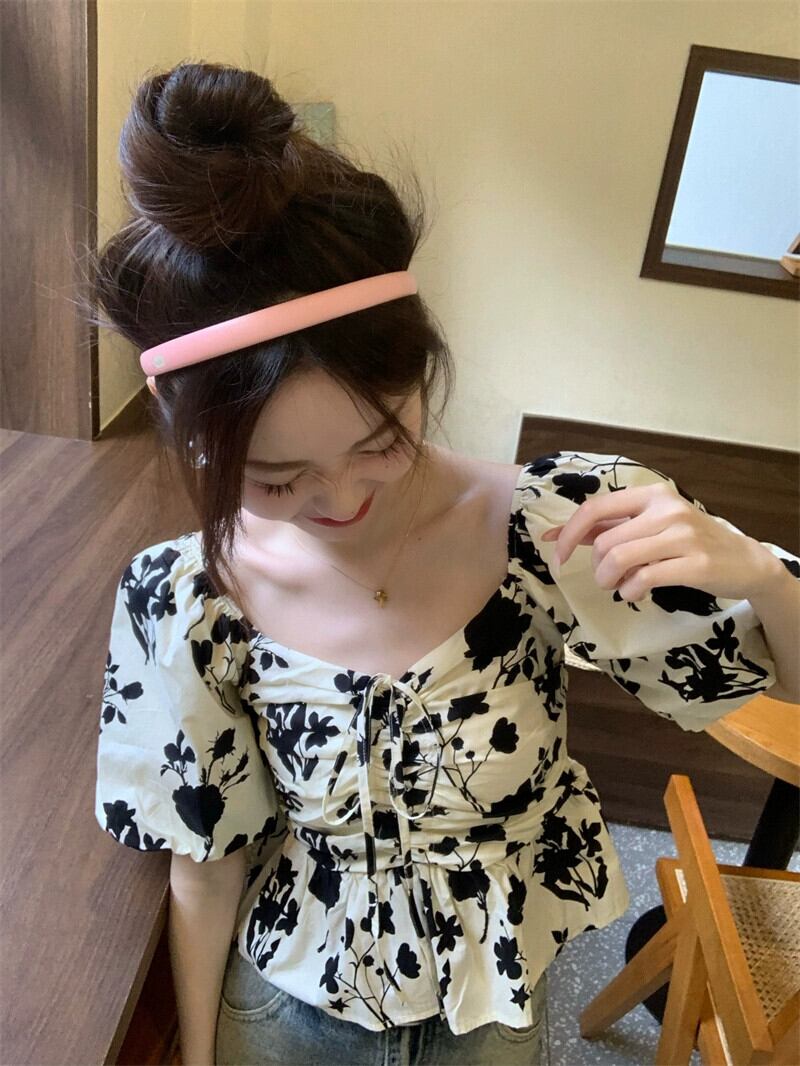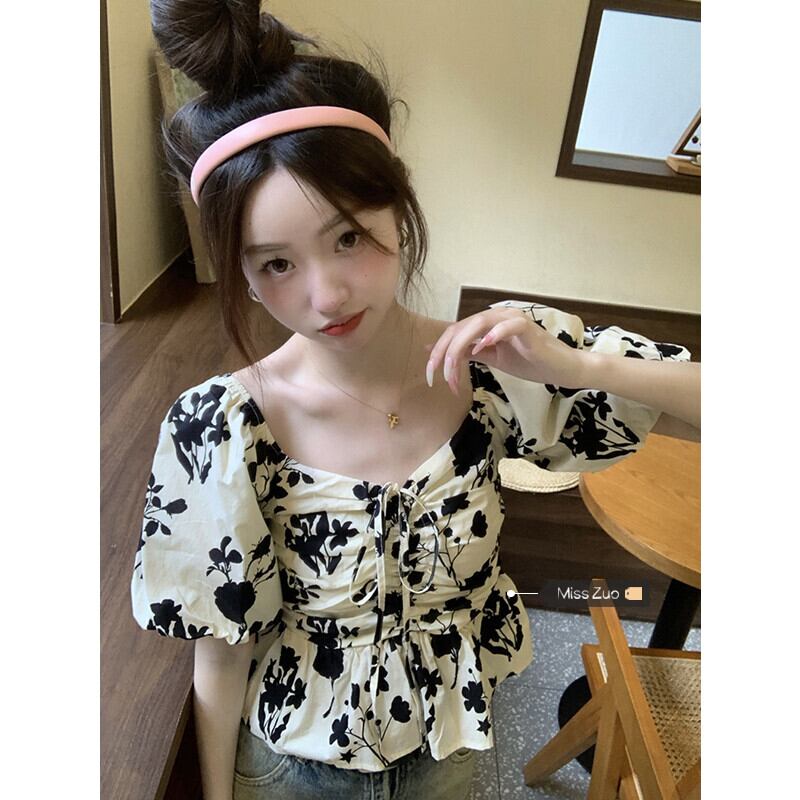 アプリコット半袖シャツレディース2023夏新デザインセンスニッチレトロスクエアカラーパフスリーブショートトップ サマー 夏物 スクウェア 8571681652416375