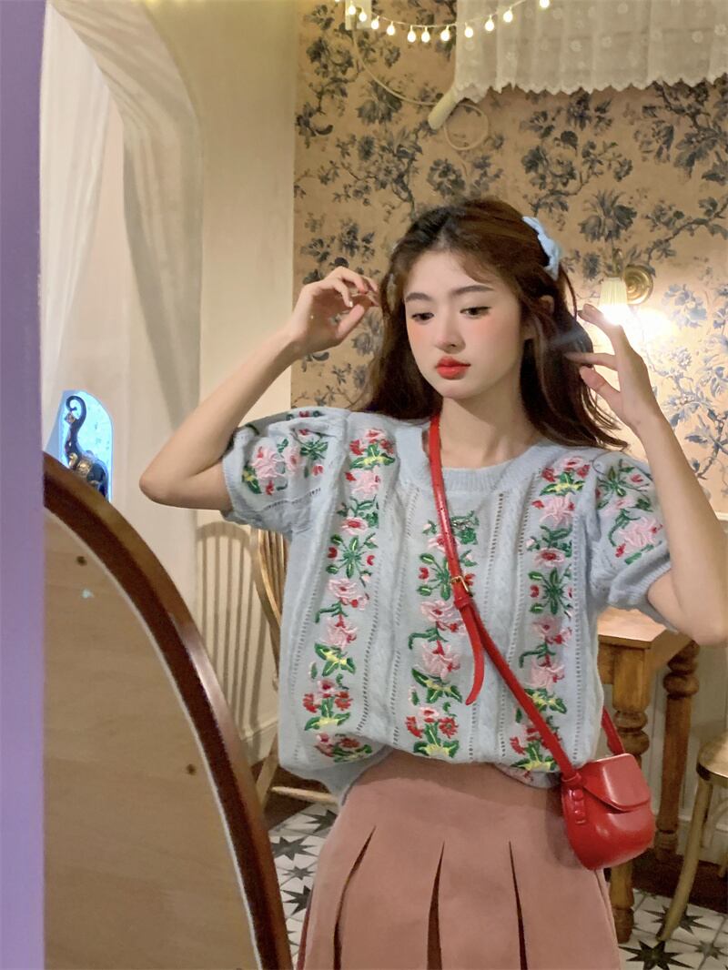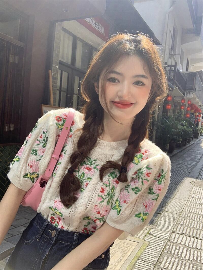 重工業刺繍中空トップレディース夏デザインセンスニッチミルクフフ甘くて優しいバブル半袖セーター 大人ガーリー スウィート キュート カジュアル サマー 夏物 8571657237703648
