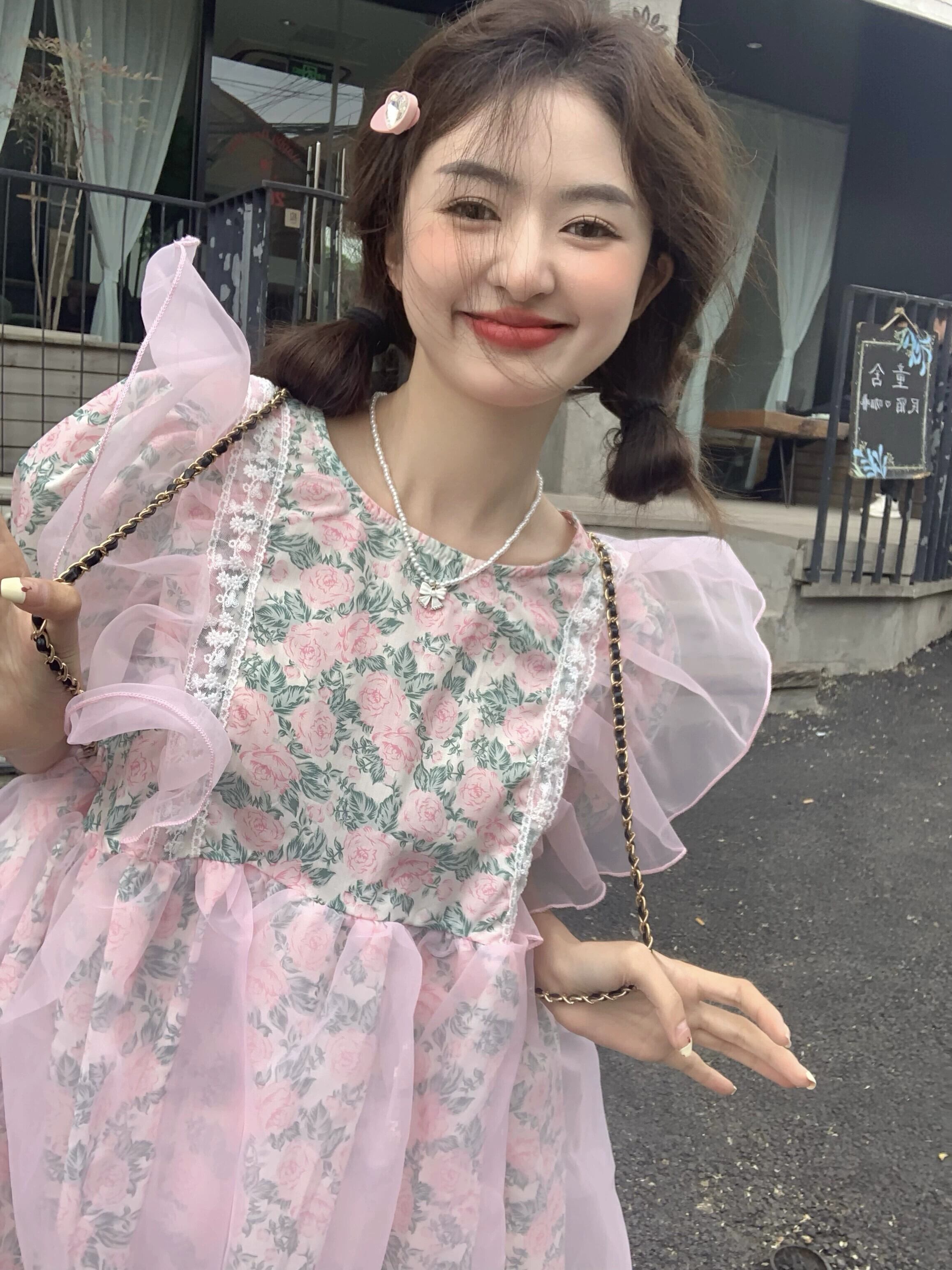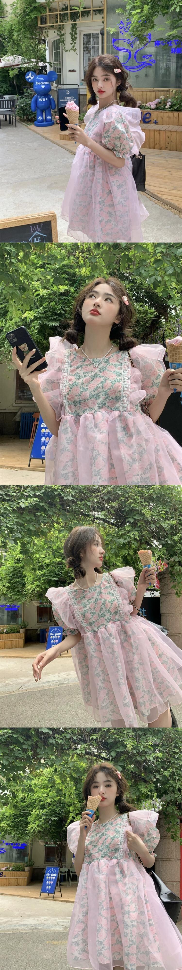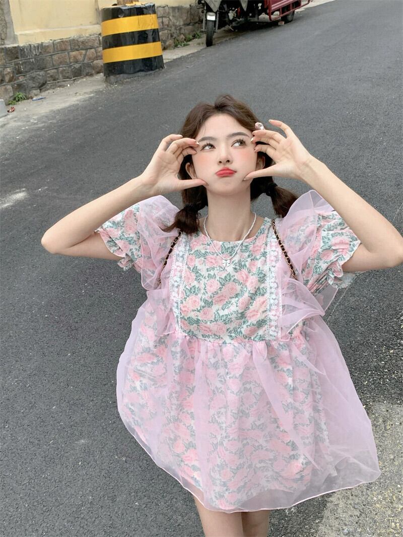 ステッチメッシュ花柄ワンピースレディース夏デザインミルク感が甘くて年齢を軽減する小さめのゆるふわスカート 大人ガーリー スウィート キュート カジュアル ふわふわ サマー 夏物 8571662200048527