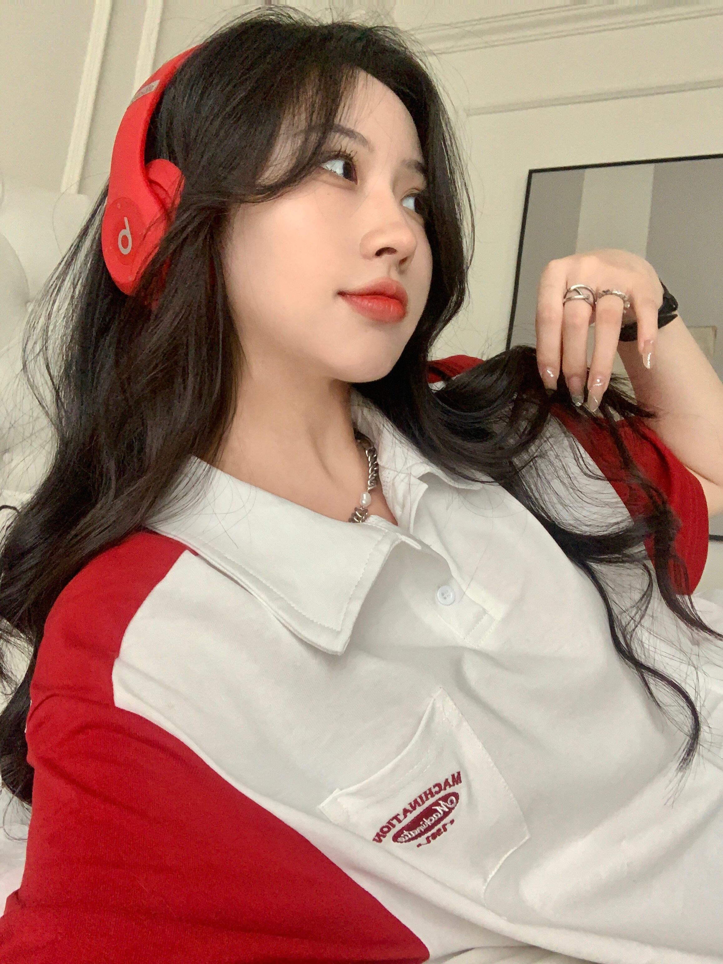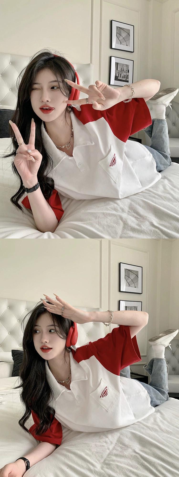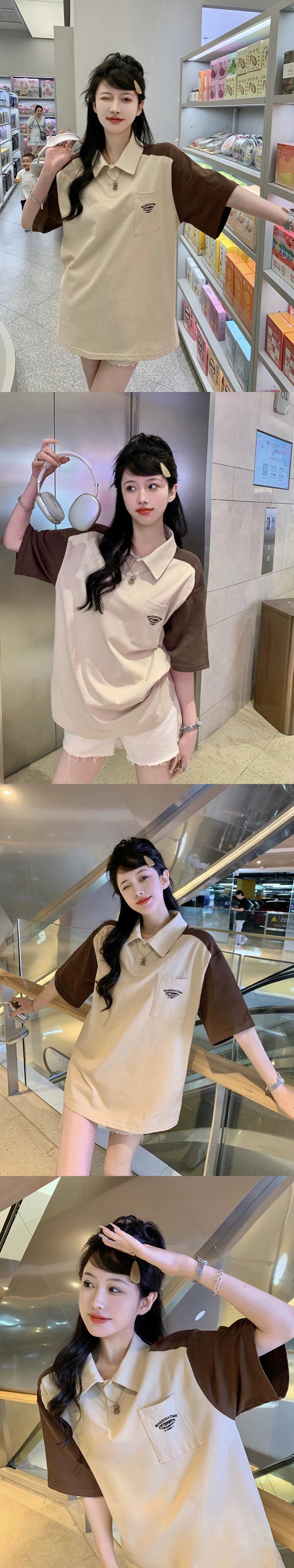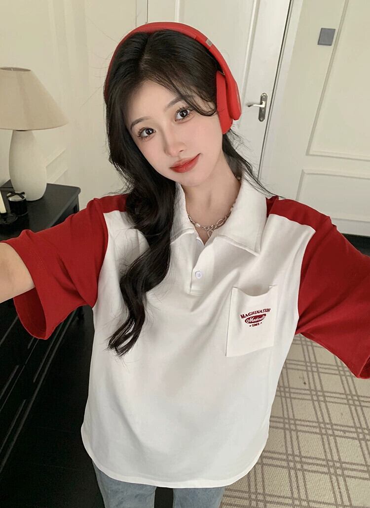 カラーブロッキングラグランショルダー半袖 Tシャツレディース夏の新しいアメリカンレトロカレッジスタイルルーズ学生ポロ襟服 サマー 夏物 8571626124317649