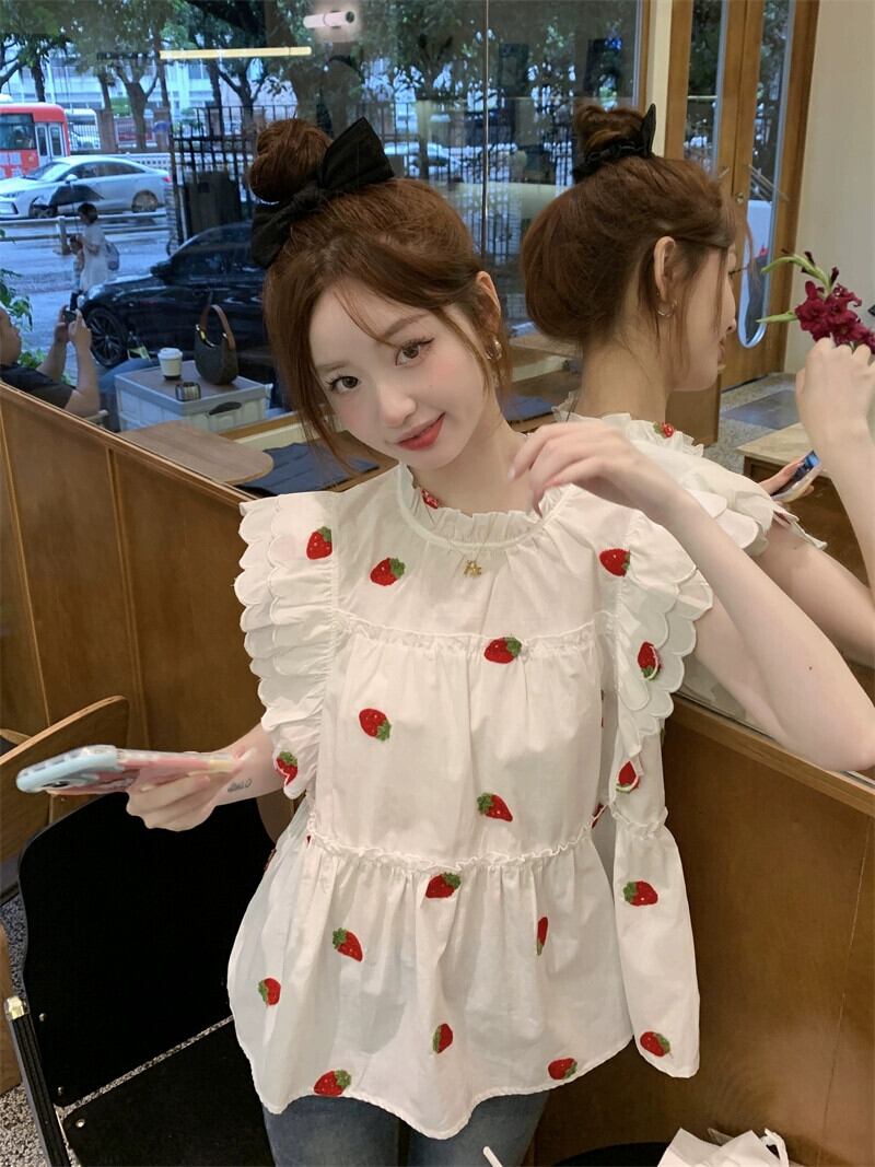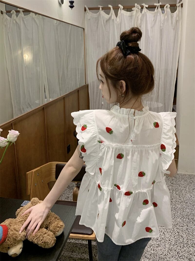 小さなフライングスリーブドールシャツレディース夏フレンチスイートカバーベリー美しい重いイチゴ刺繍白シャツ ホワイト 大人ガーリー スウィート キュート カジュアル サマー 夏物 8571640694981502