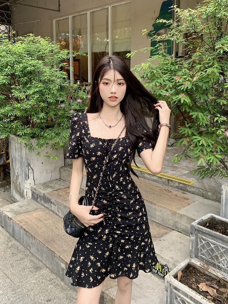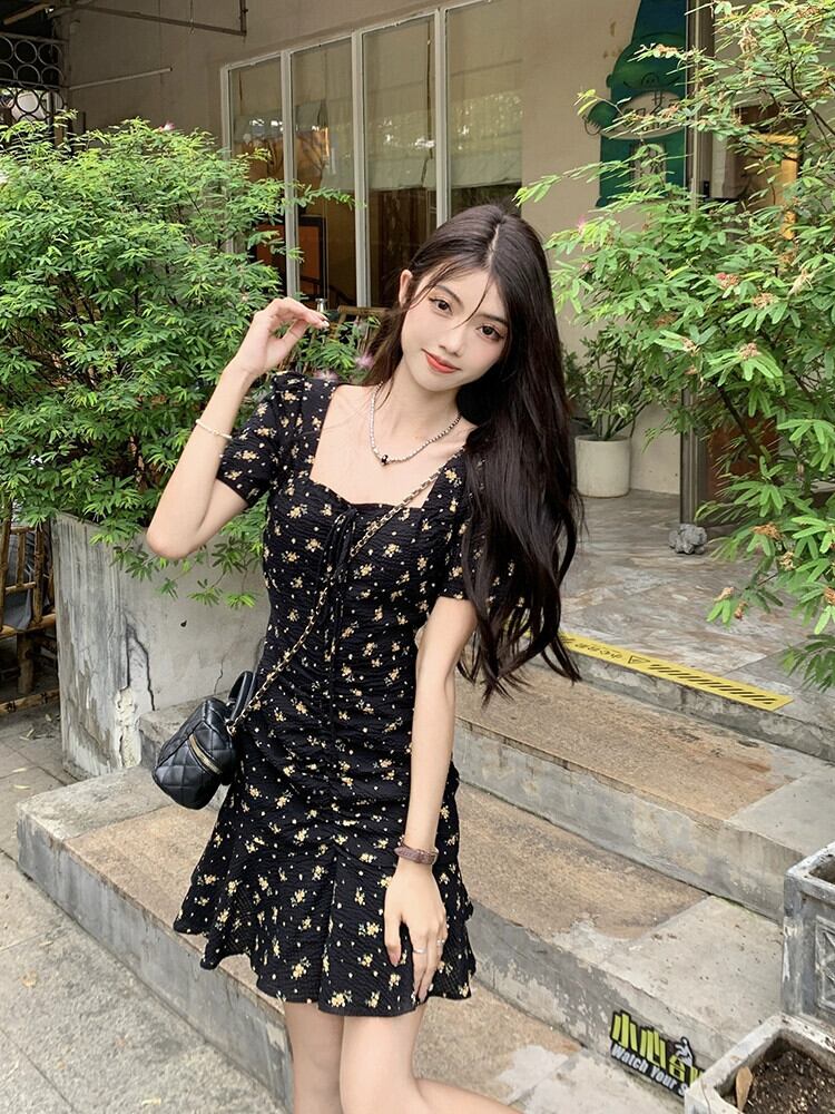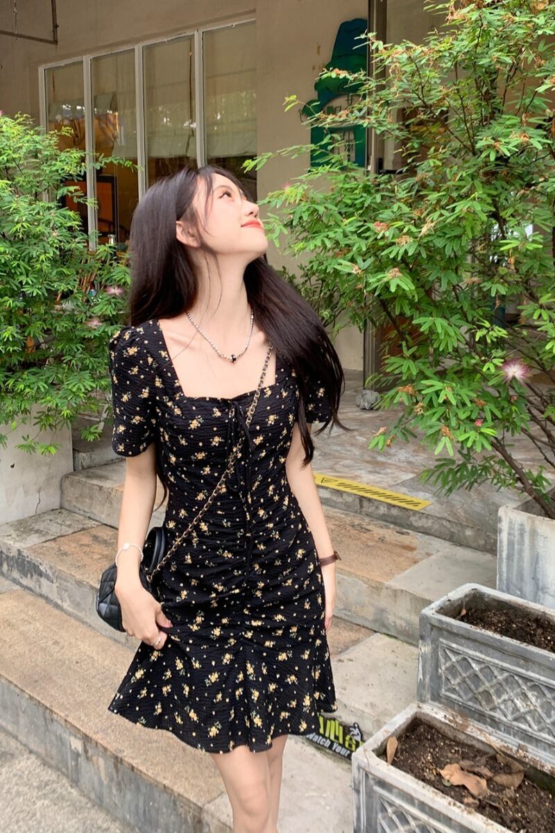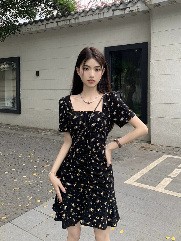 大きいサイズの花柄ドレス女性の夏 2023 新しいデザインセンスニッチレトロ気質パフスリーブ黒スカート ブラック 大きめサイズ サマー 夏物 8571647590630492
