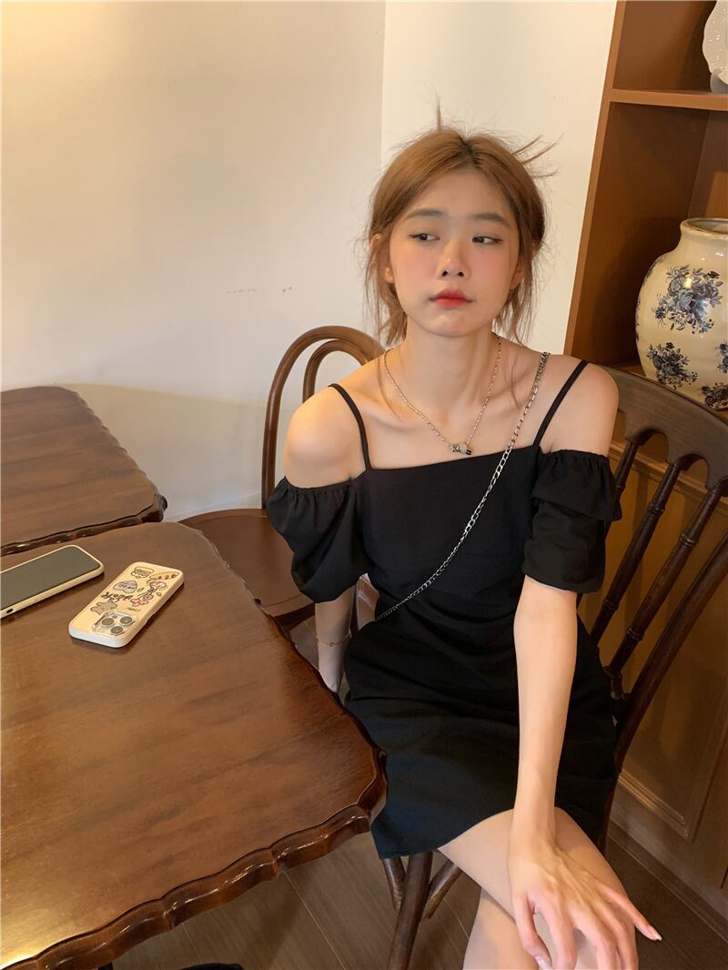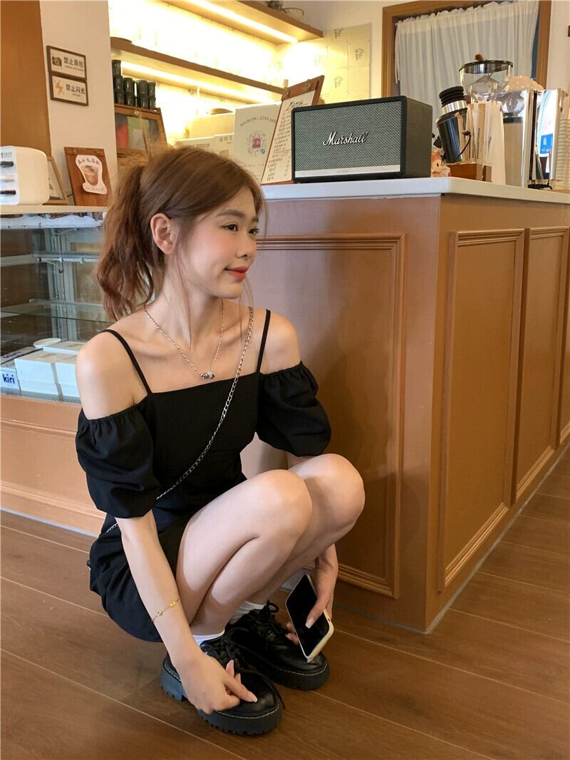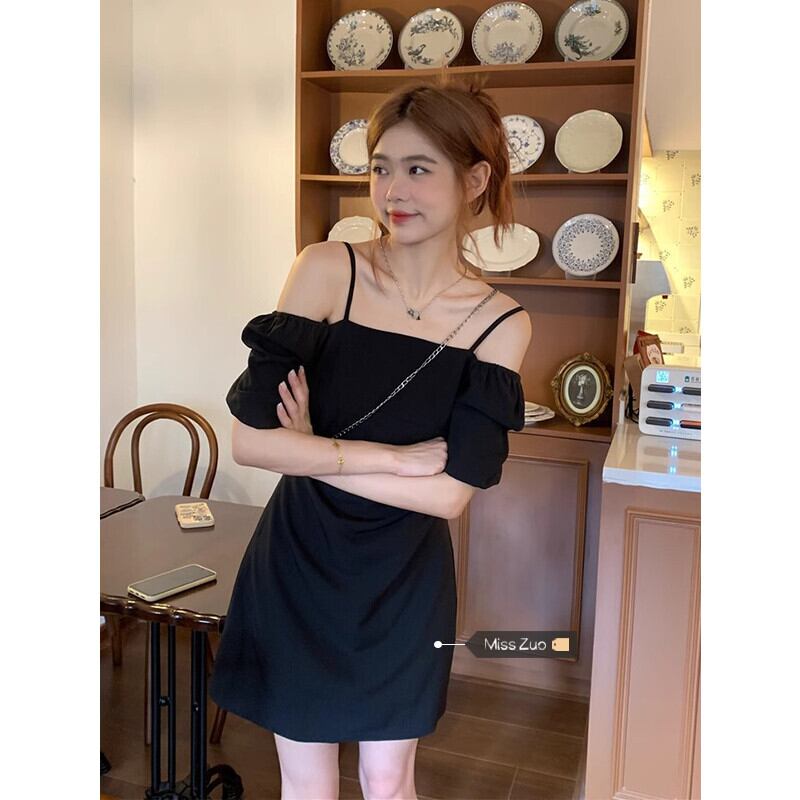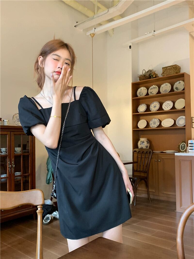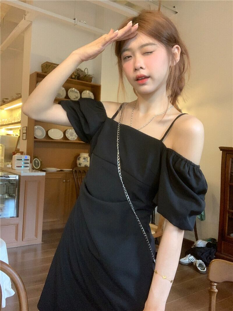 ワンショルダーツーウェアドレスの女性の夏の2023新しいフレンチスタイルの小さな黒のウエストスリミングショートスカート ブラック サマー 夏物 8571624360889824