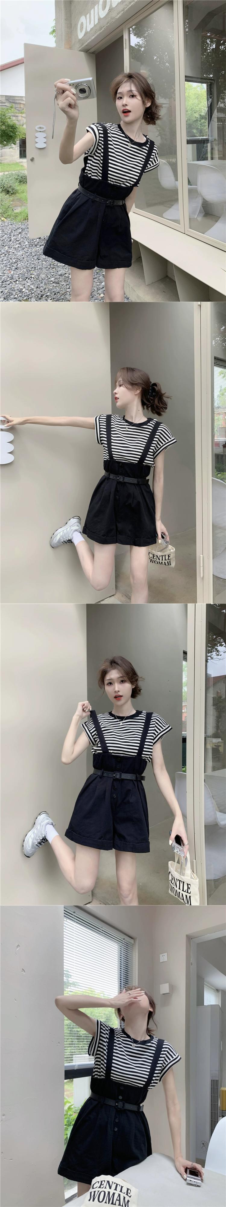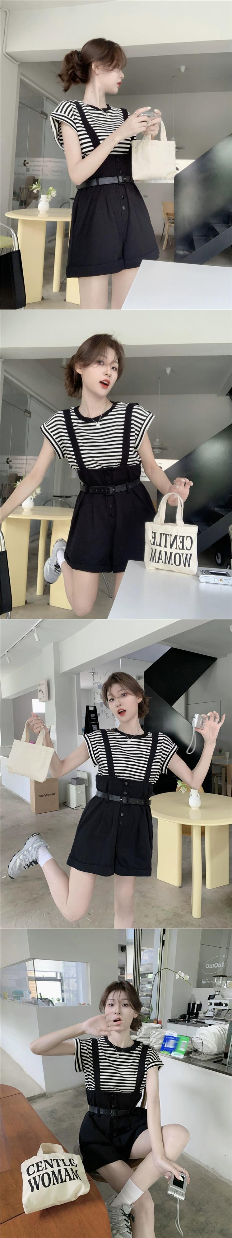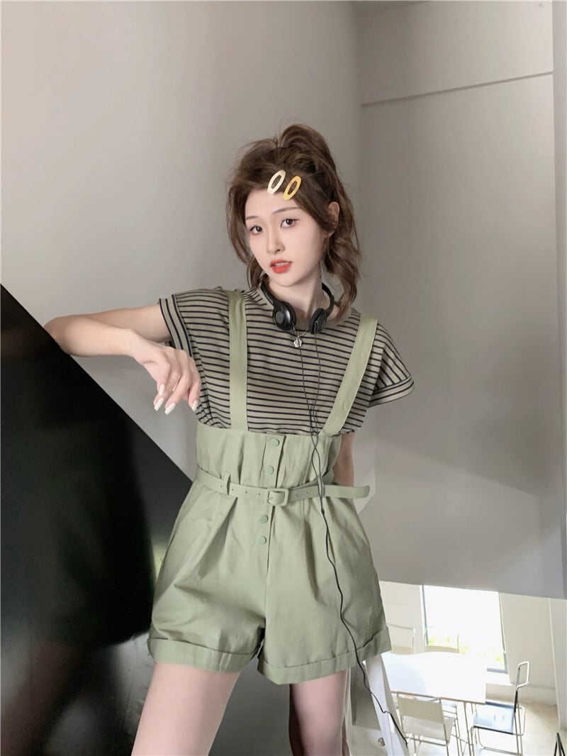 色:グリーンストライプトップ,ブラックとホワイトのストライプトップ,緑のオーバーオール,黒いオーバーオール