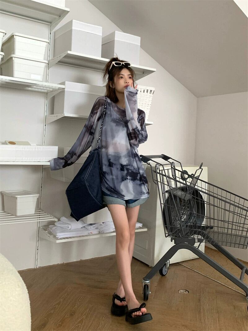 絞り染めメッシュ日焼け止めブラウス女性の夏薄い長袖 Tシャツ 2023 新しい緩い怠惰な風服 ロング サマー 夏物 8571631641342205