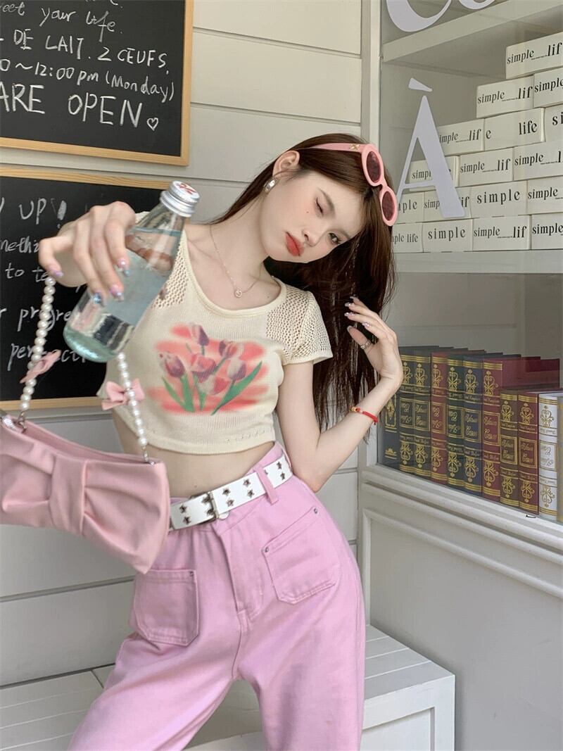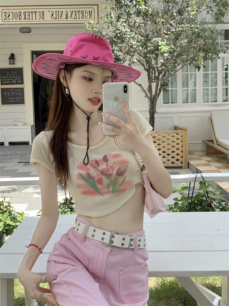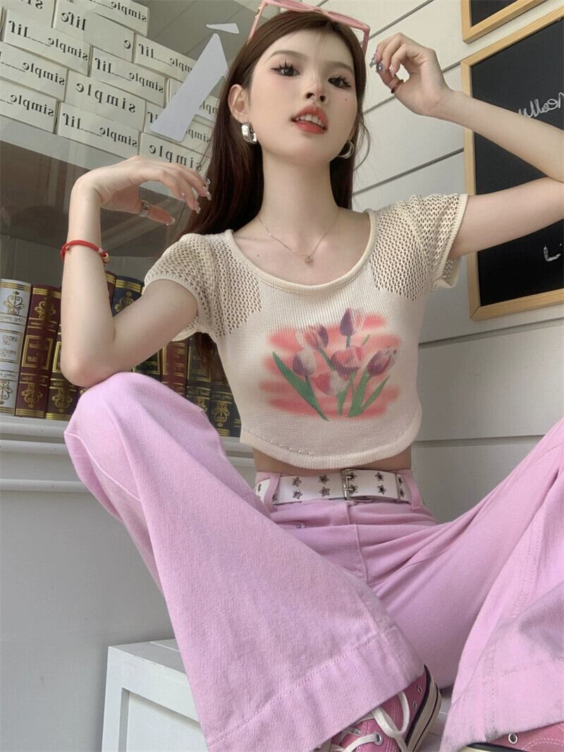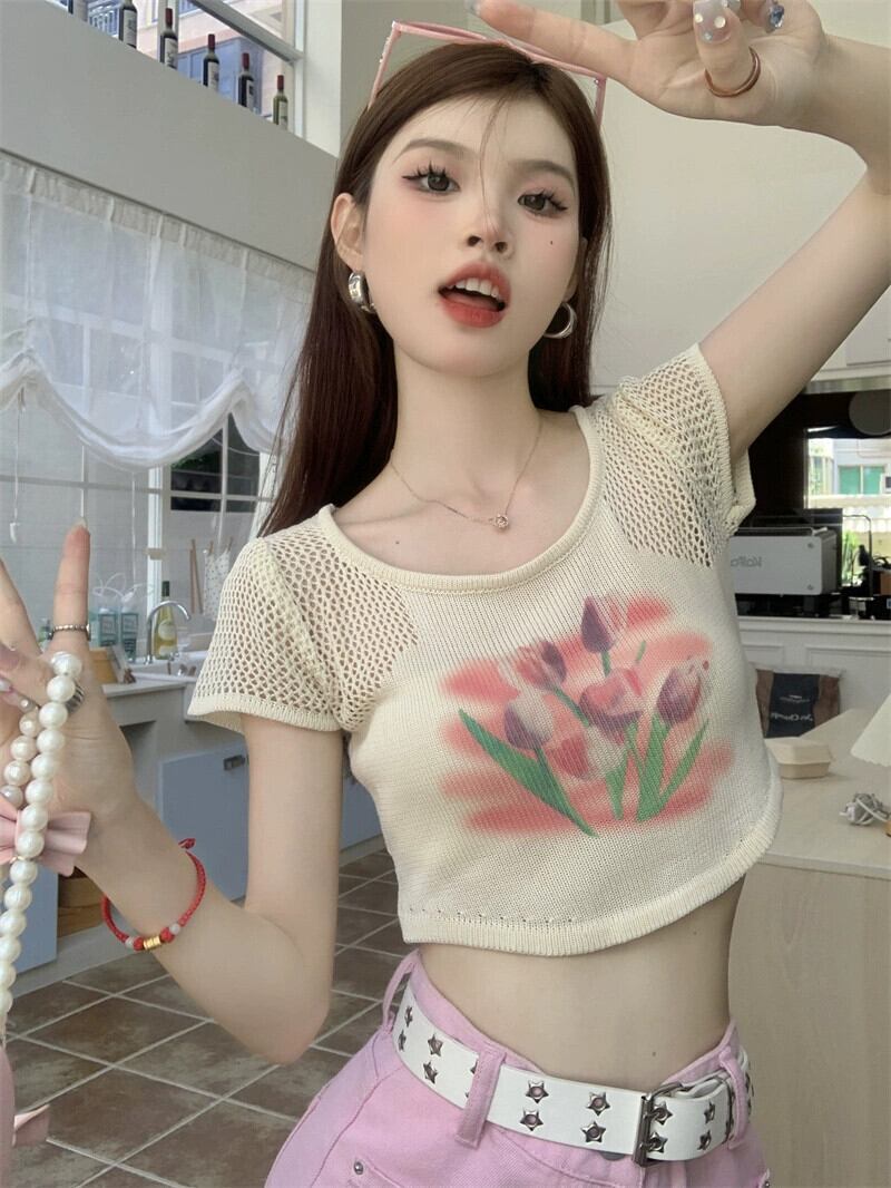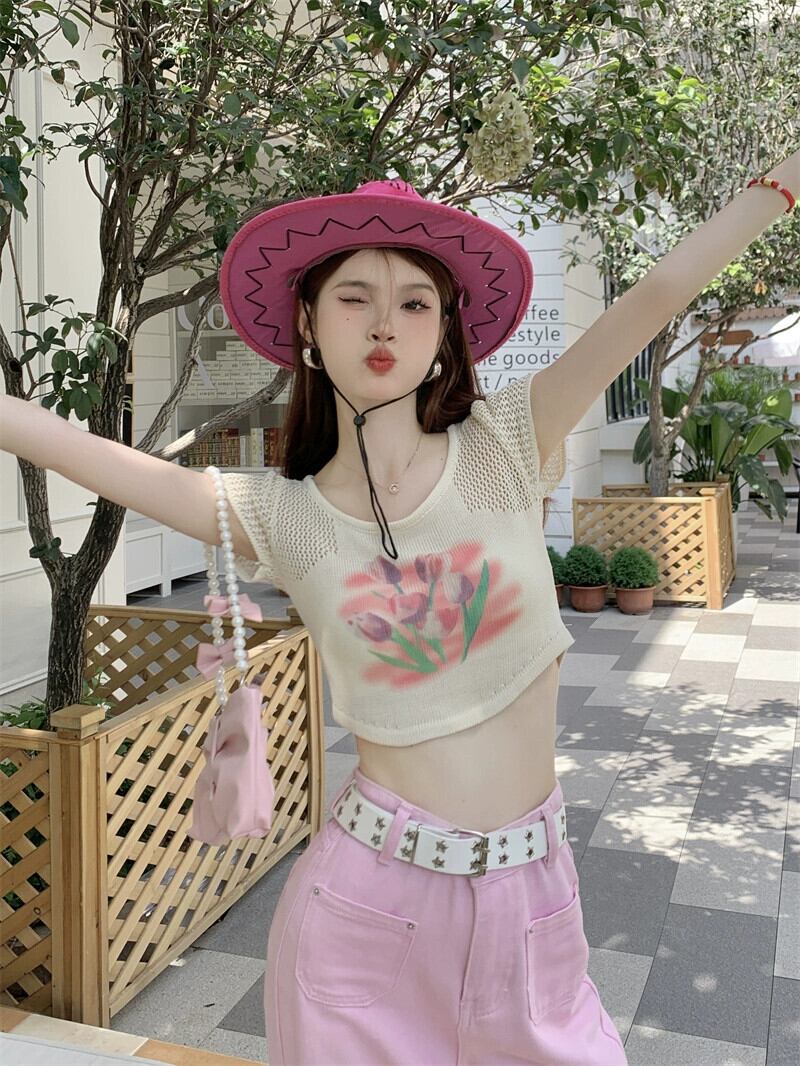 チューリップ半袖ニットセーター女性の夏のデザインセンスニッチ2023新しい純粋な欲望中空ショートトップ サマー 夏物 ピュア 8571633627242836