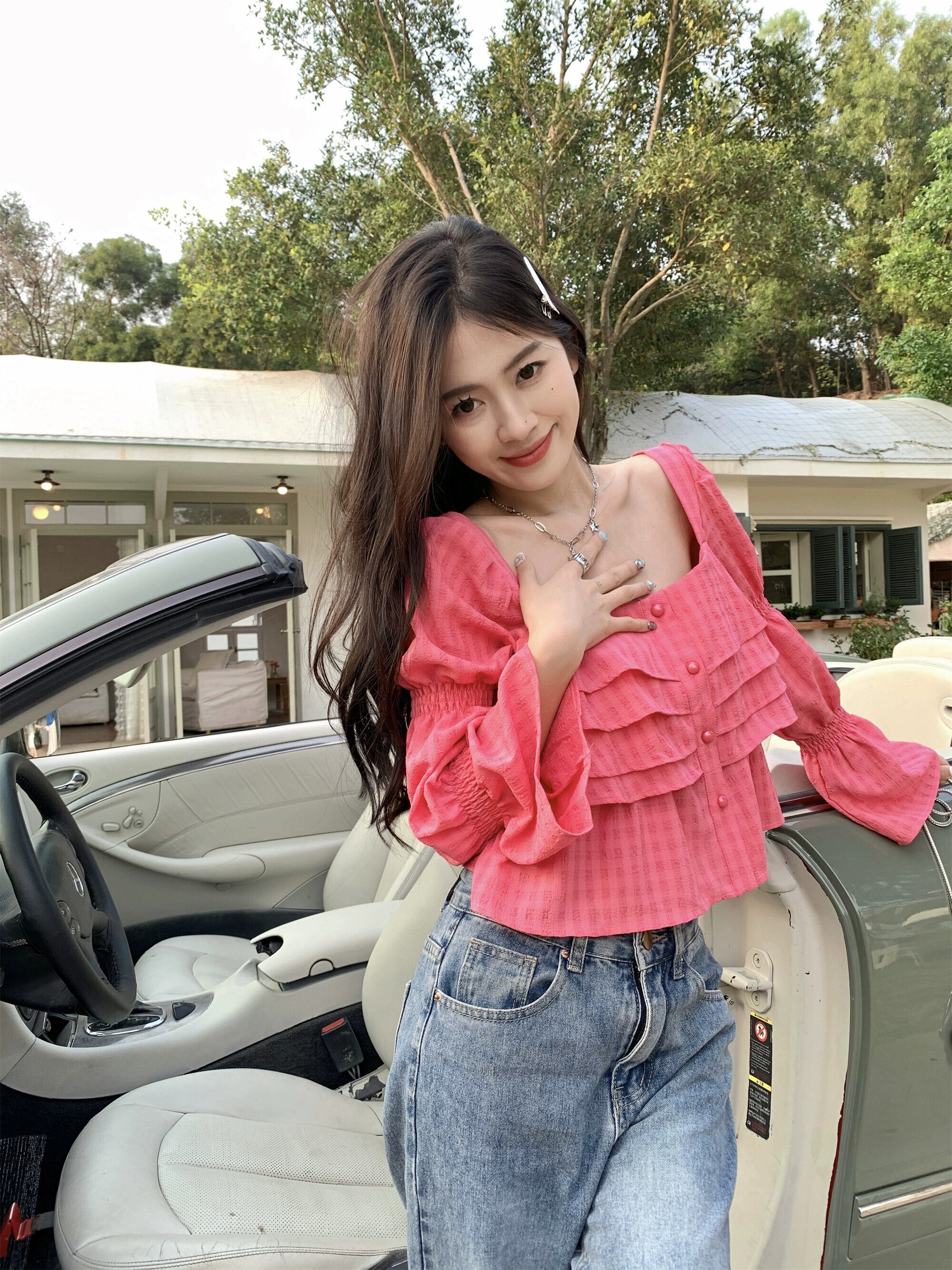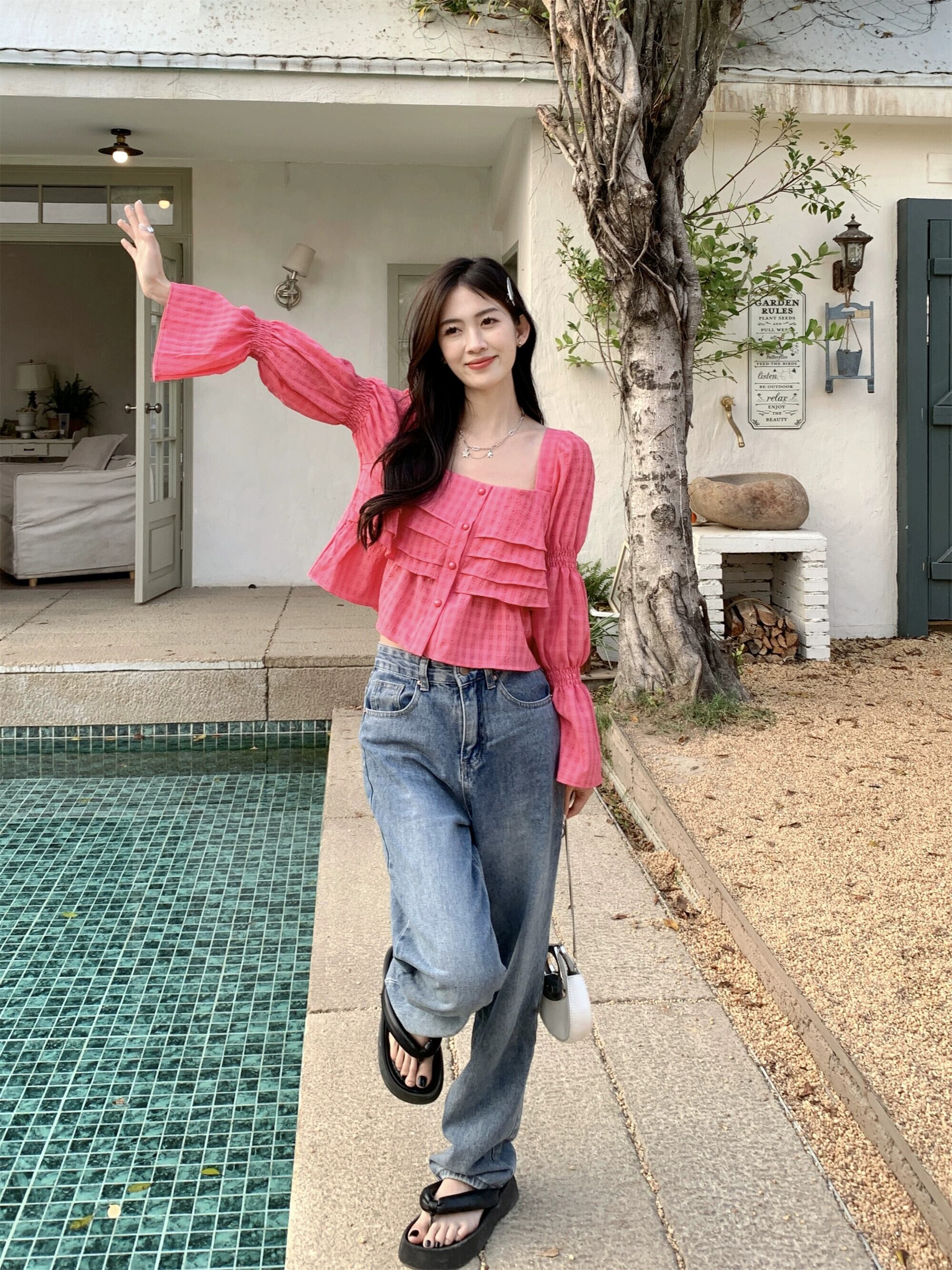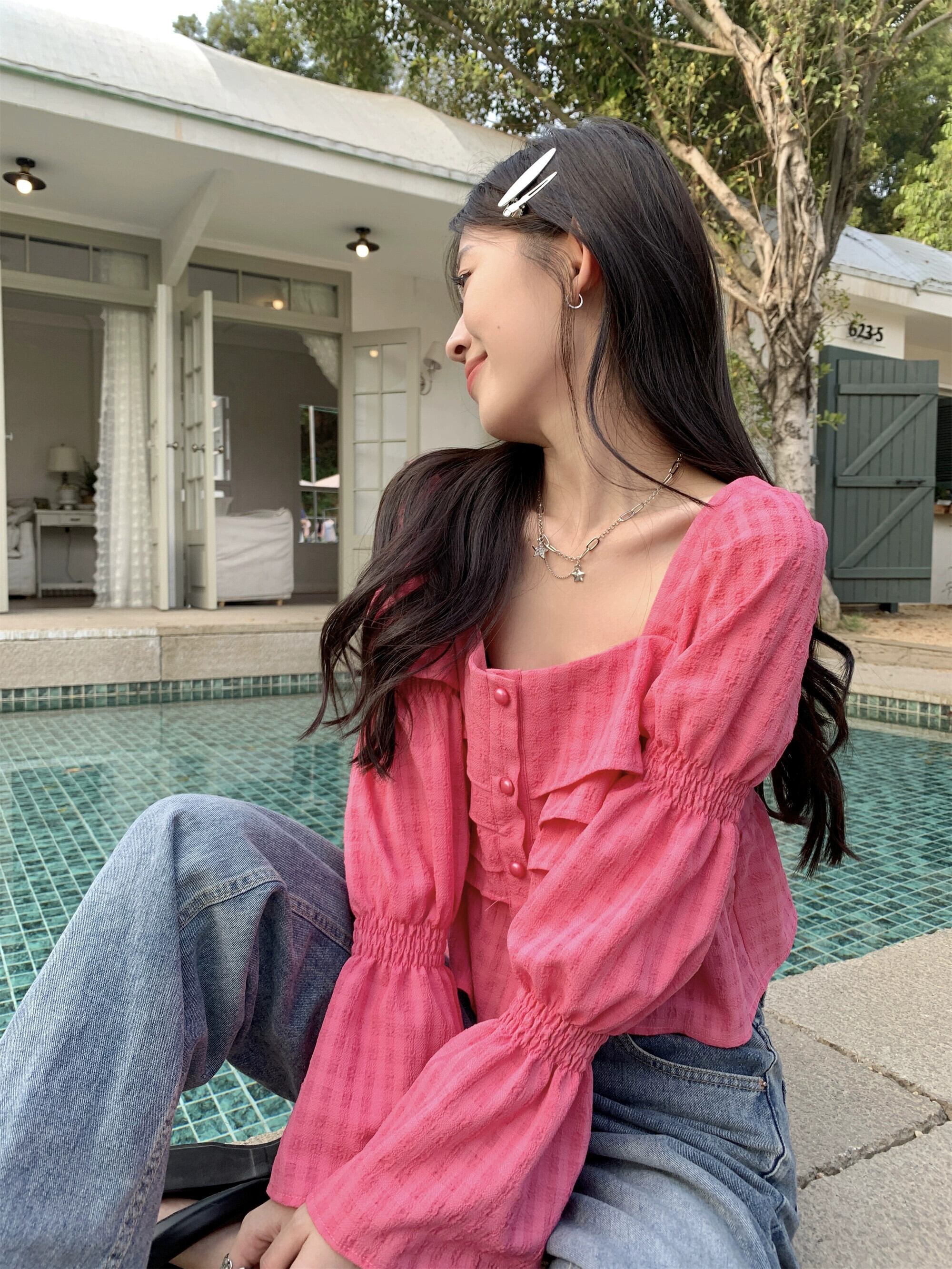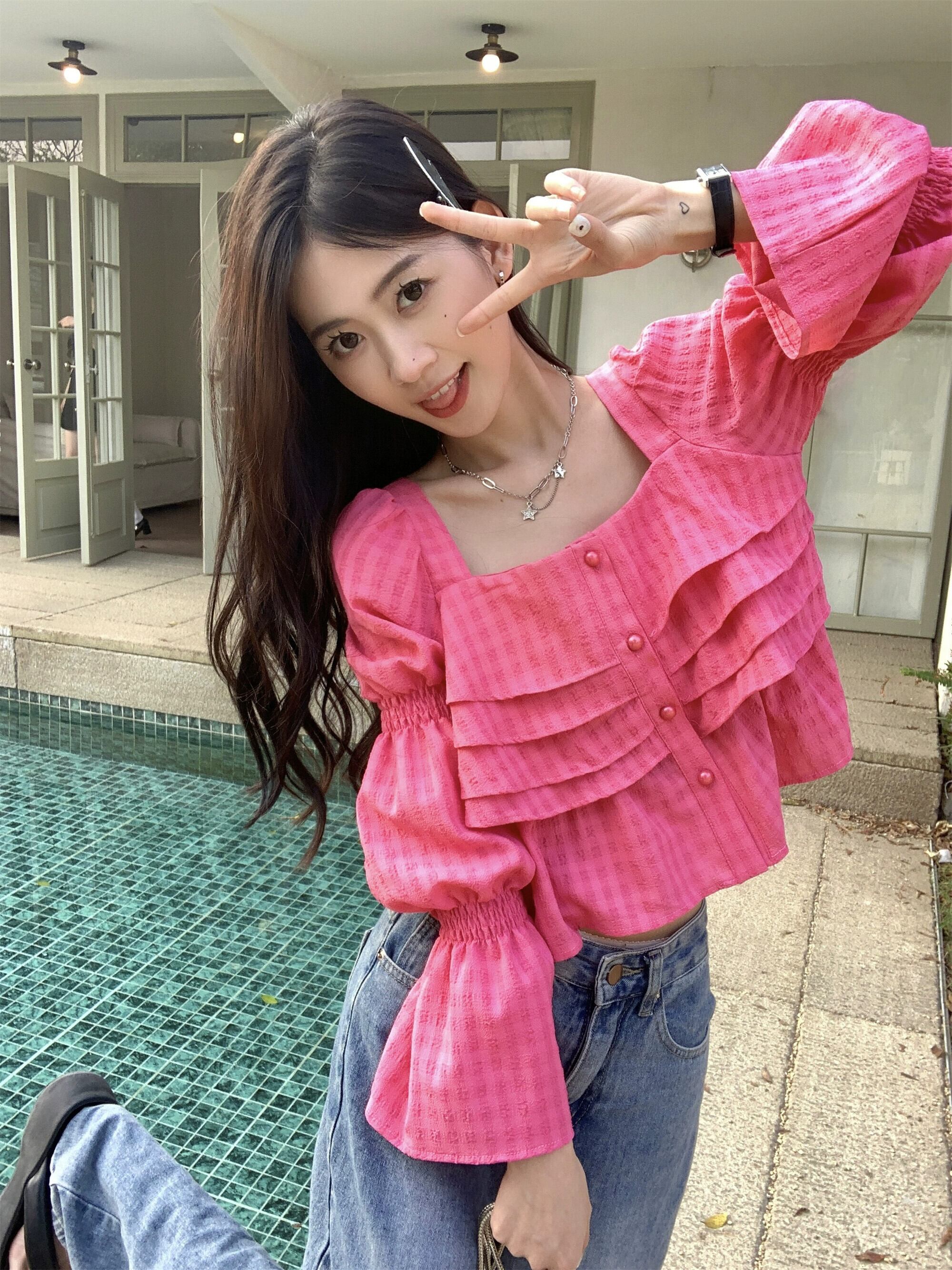 ローズレッドシフォンシャツレディース2023春新作デザインセンスニッチ気質甘いフレンチショートトップ 大人ガーリー スウィート キュート カジュアル スプリング 春物 8571630498631516
