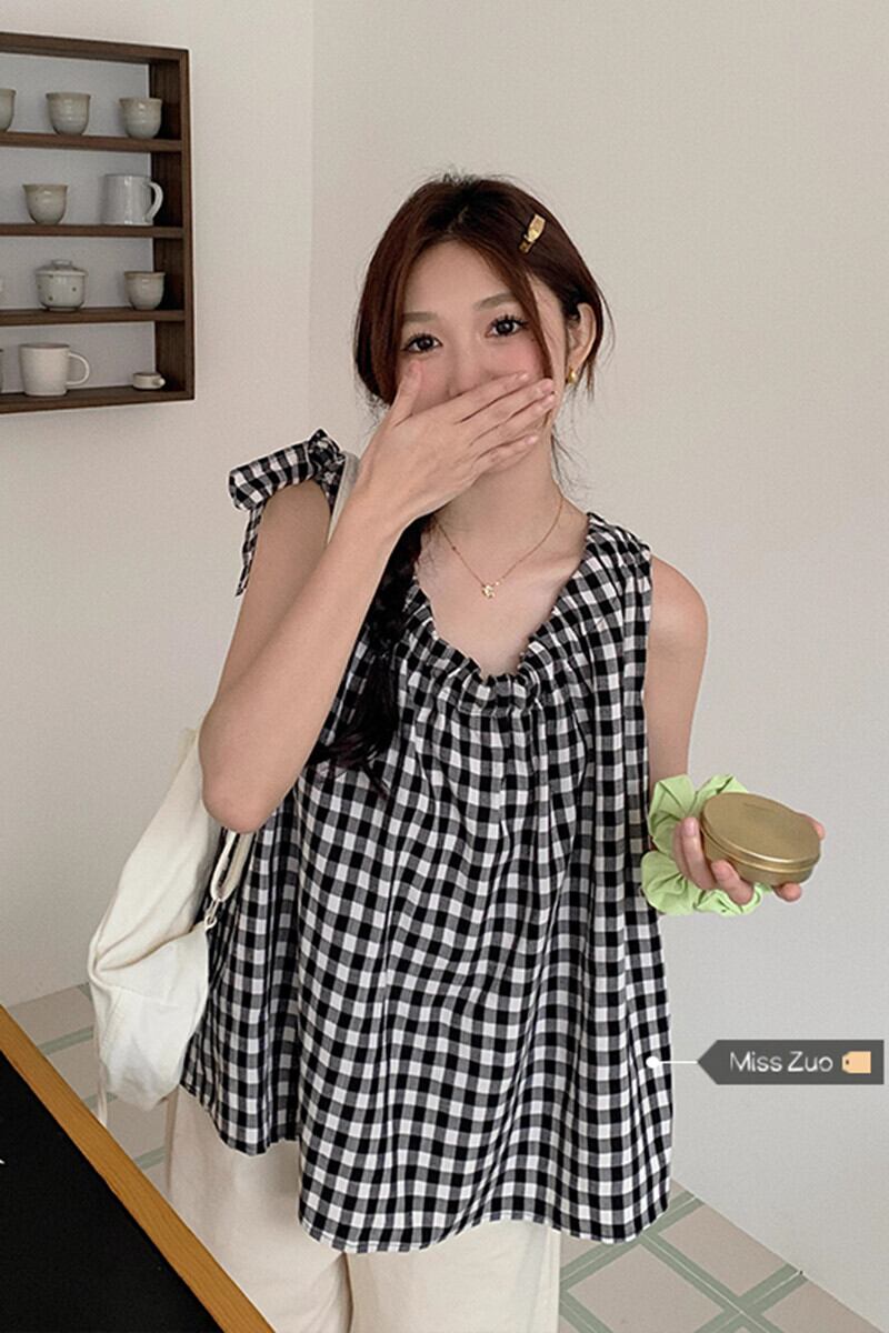 黒と白のチェック柄ベスト レディース アウター 夏インナー フレンチ レトロ デザイン センス ニッチ ネット レッド スタイル ノースリーブ トップ ホワイト ブラック サマー 夏物 8571634388687679