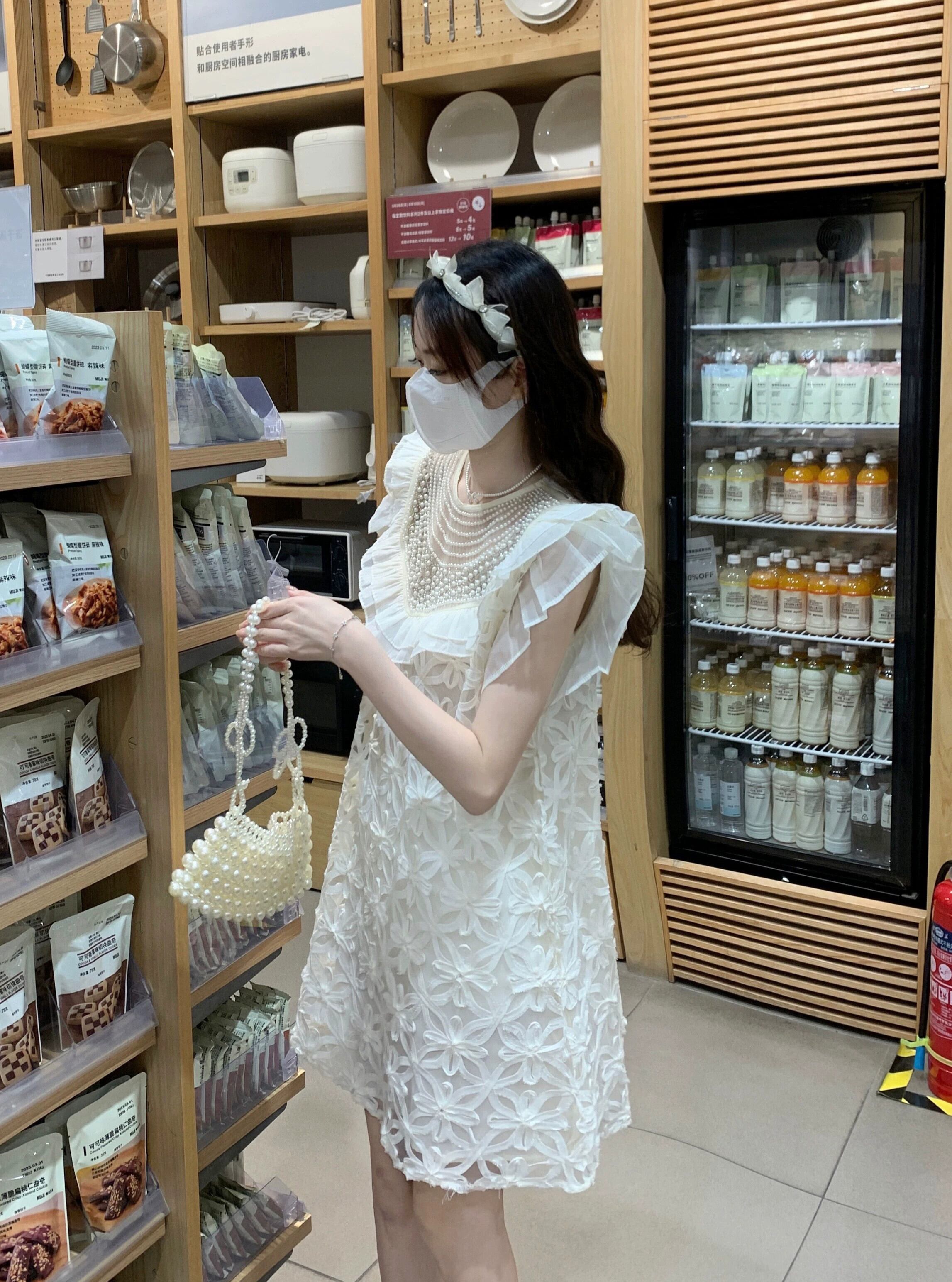 重工業ビーズレースドレス女性の夏 2023 新しいフレンチスタイル甘い初恋小さなフライングスリーブスカート 大人ガーリー スウィート キュート カジュアル サマー 夏物 8571673967631711