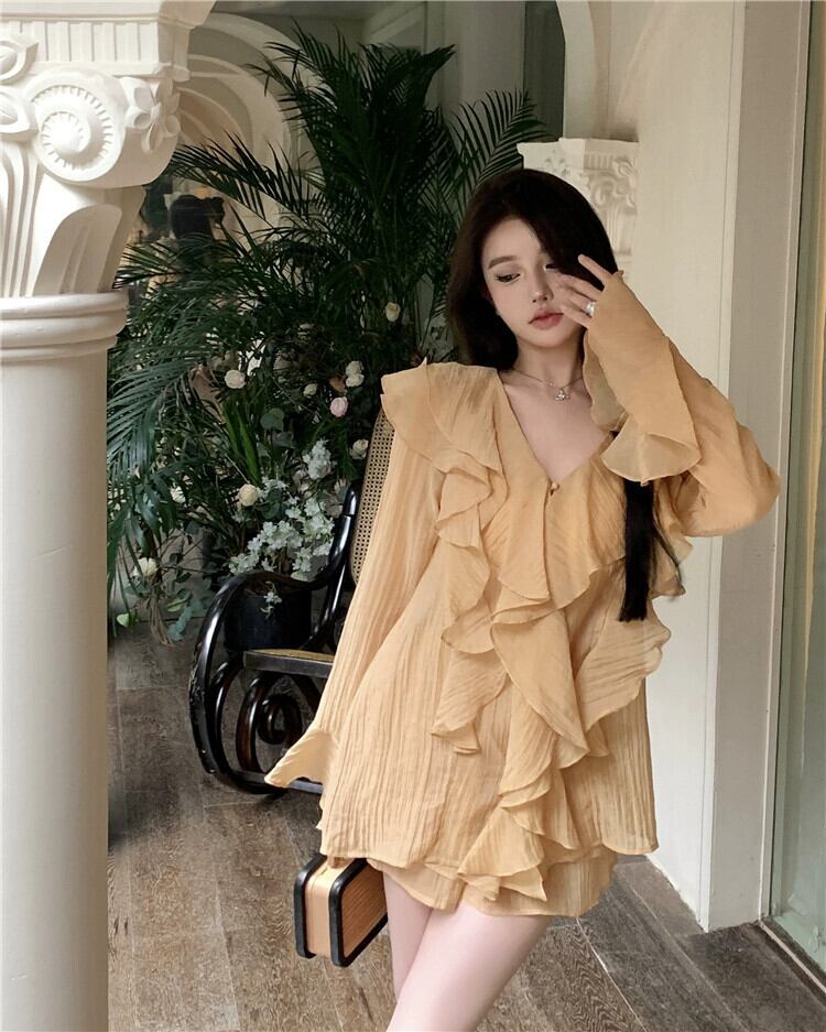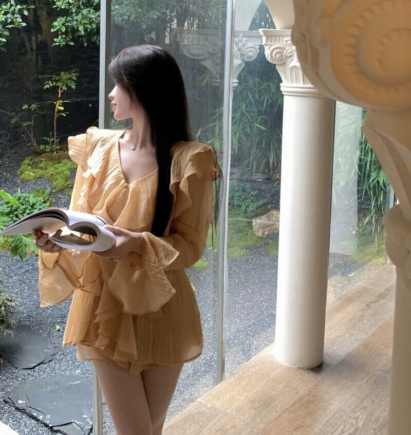 フリル V ネック トップ レディース 夏デザイン ニッチ フレンチ スタイル優しくて美しい超格好良い日焼け防止長袖シャツ ロング サマー 夏物 Vネック 857167995784961