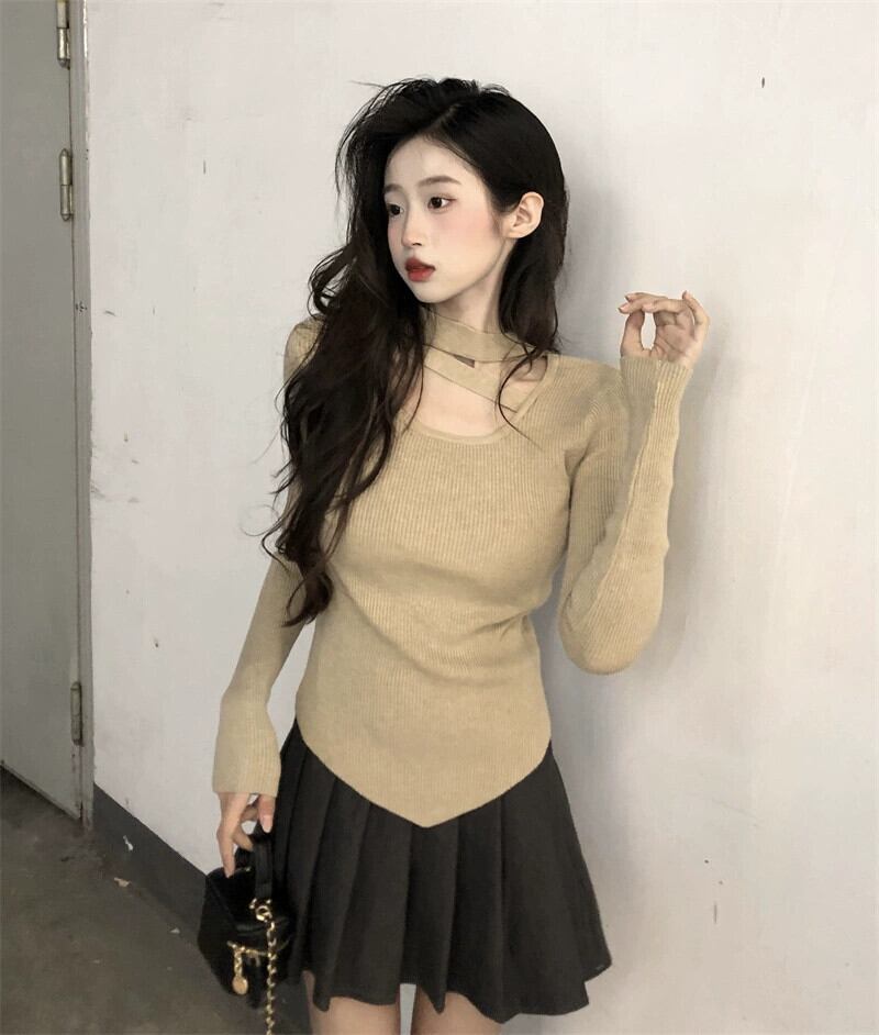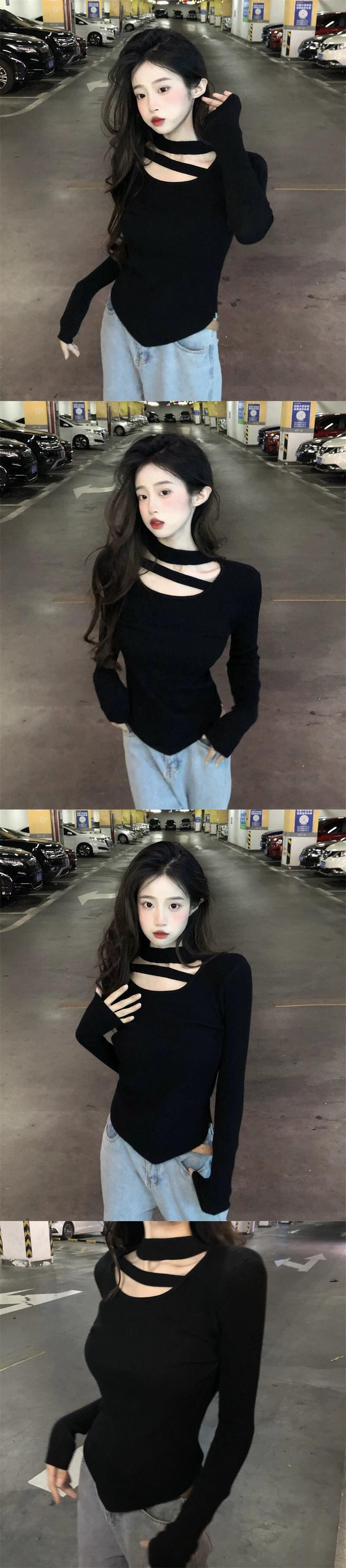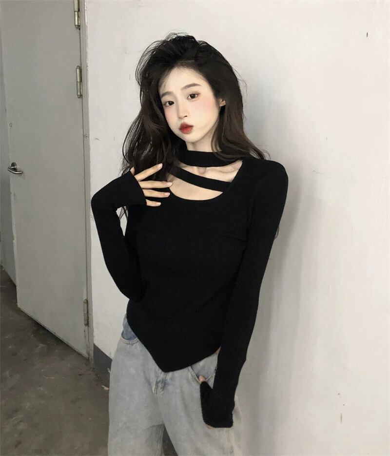 ボトリングシャツ女性春黒ニットセーター 2023 新デザインニッチシックな不規則なトップ ブラック スプリング 春物 8571683956277711