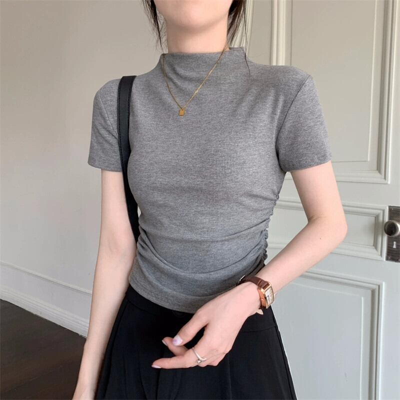 グレーハーフタートルネックスリムトップ女性ニッチ夏 2023 甘いホットガールフロントショルダー半袖 Tシャツ ショート ハーフスリーブ 大人ガーリー スウィート キュート カジュアル サマー 夏物 8571619102984543