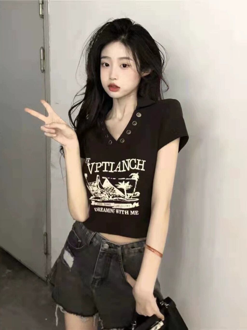黒右肩半袖 Tシャツ女性の夏 2023 新しいアメリカンレトロニッチスリム V ネックショートトップ ブラック サマー 夏物 Vネック 8571613328188054