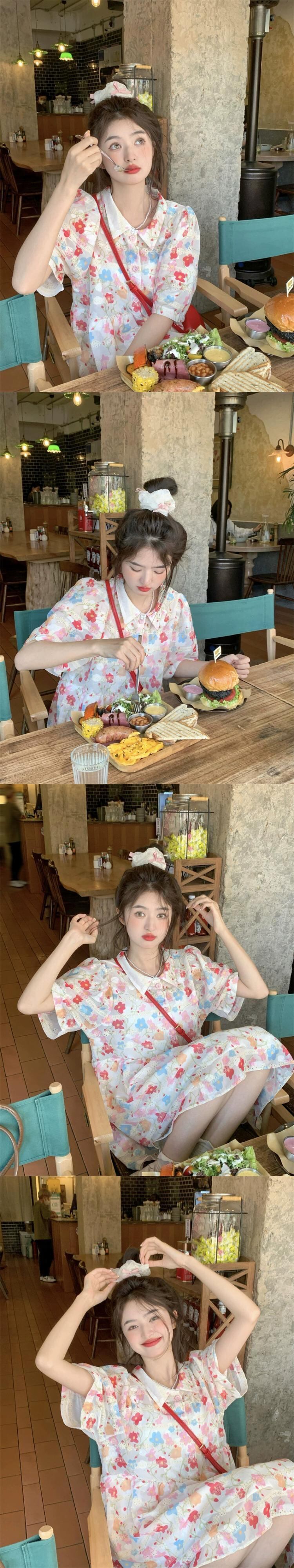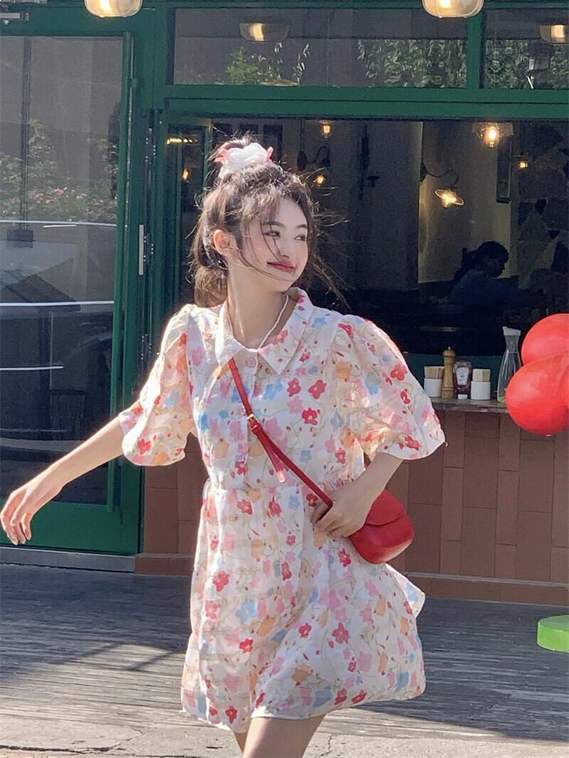 刺繍入り中空花柄ドレス女性夏甘くてかわいい胸スタイルドレスパフスリーブリトルピープル レッド 大人ガーリー スウィート キュート カジュアル サマー 夏物 8571685921100785