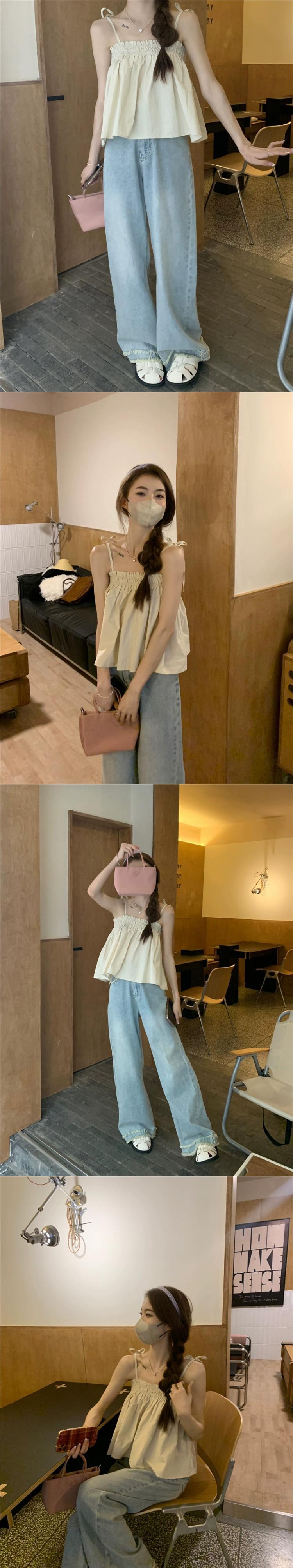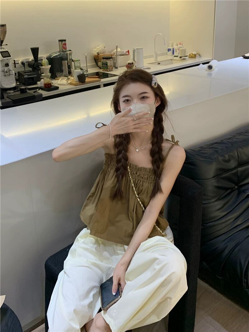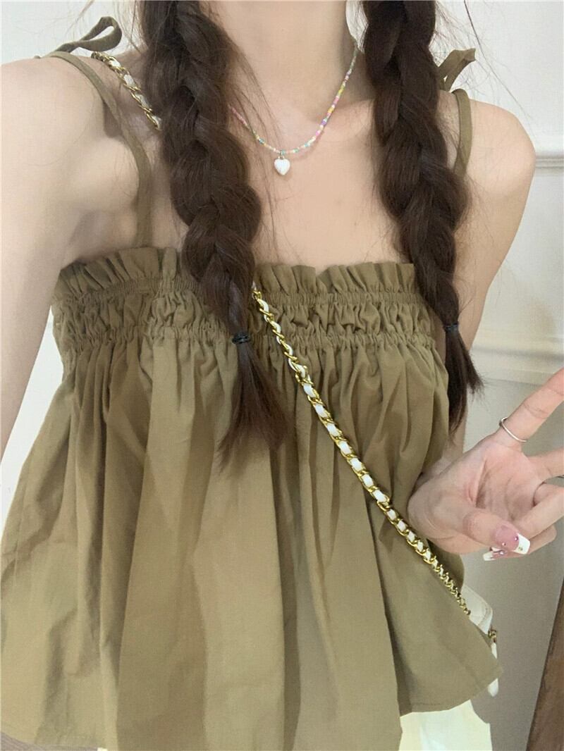 フレンチレトロシックで美しいノースリーブベビードールショートトップを合わせた、夏に外で着るブラウンキャミソールレディース サマー 夏物 8571611284138575