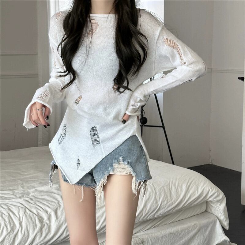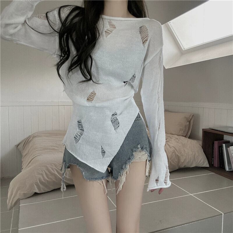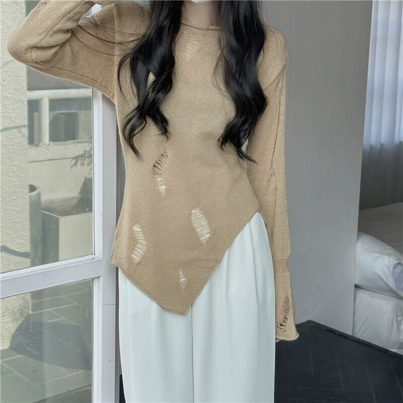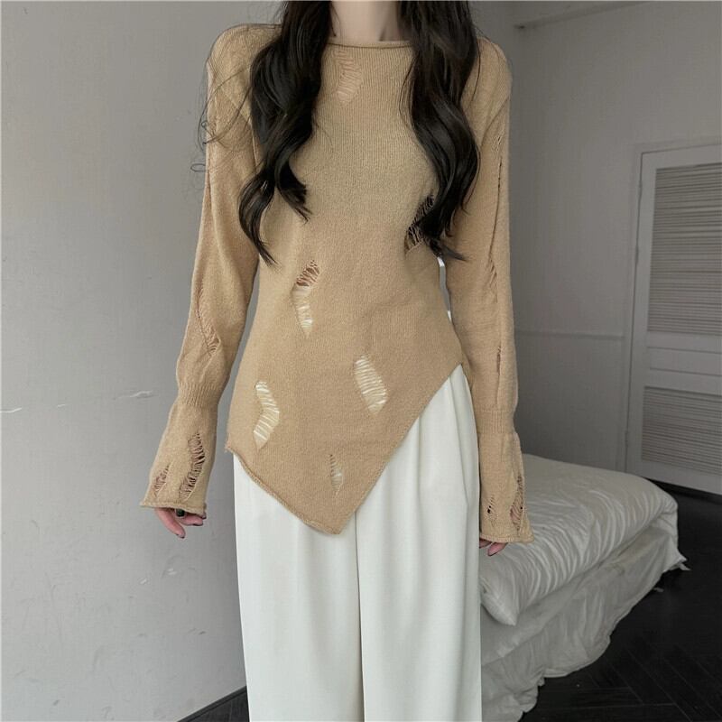 中空穴セーターレディースデザインニッチレイヤードブラウス2023初秋の新しい不規則なシックなトップ レッド オータム 秋物 8571663171257440