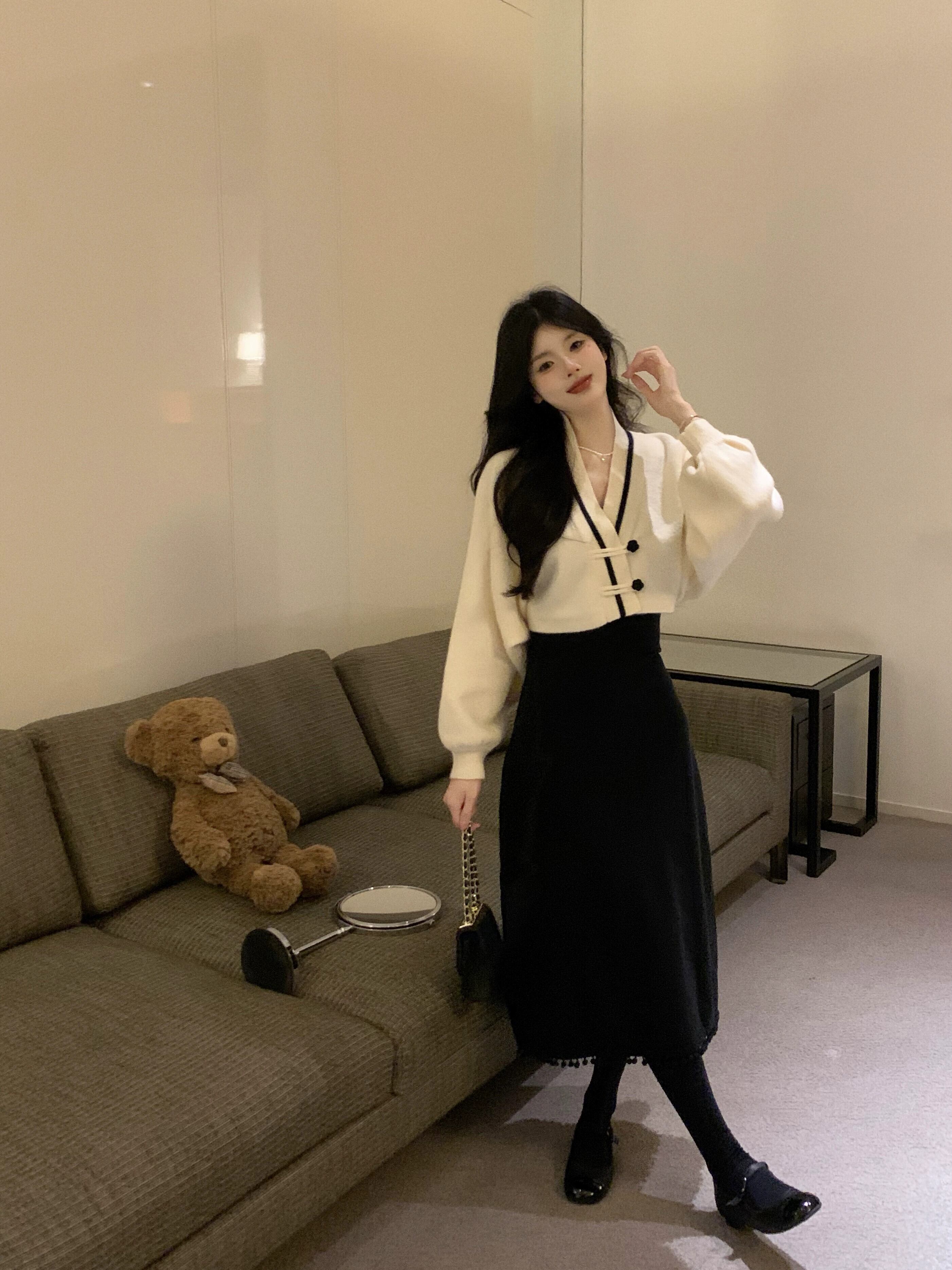色:アプリコットセーター,ブラックサスペンダースカート