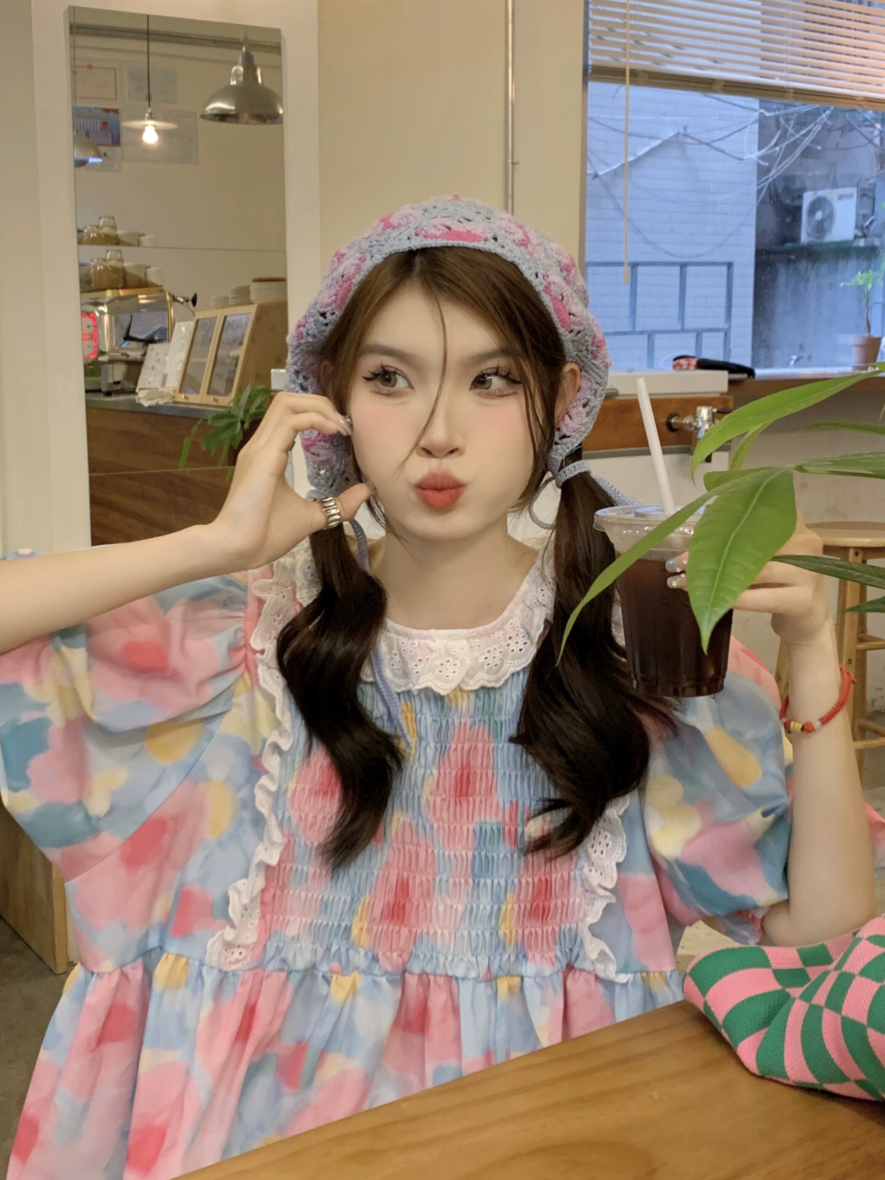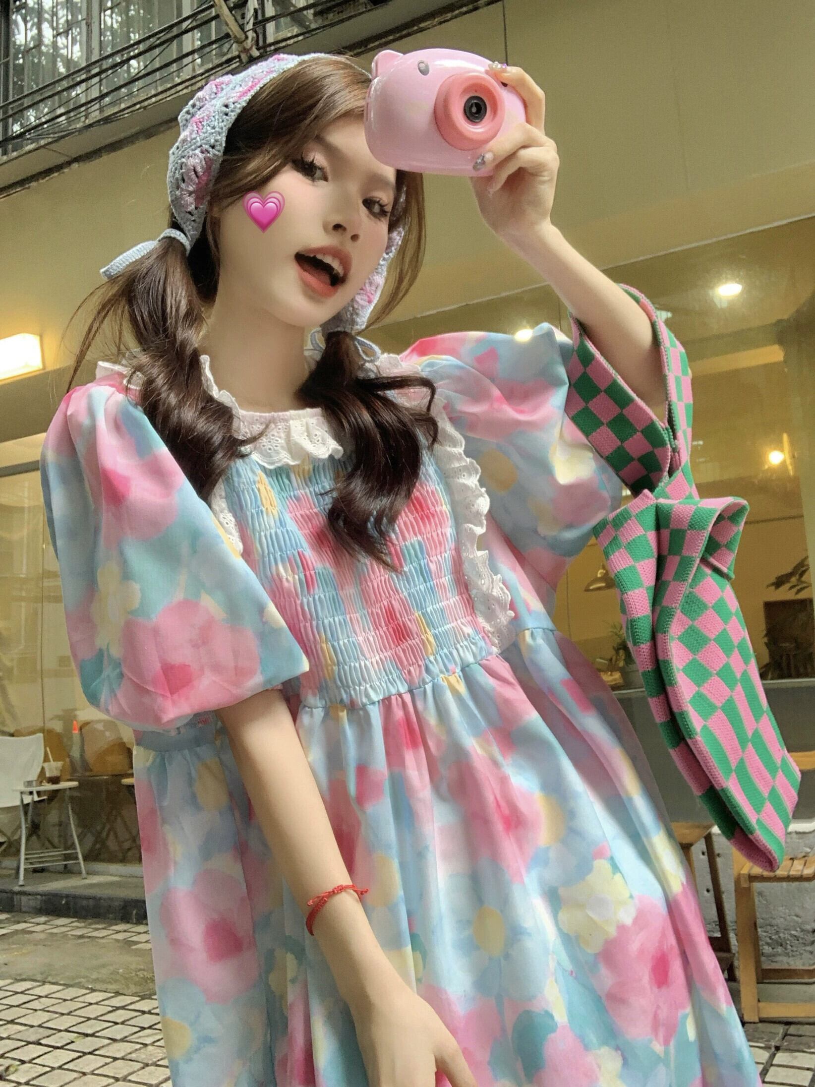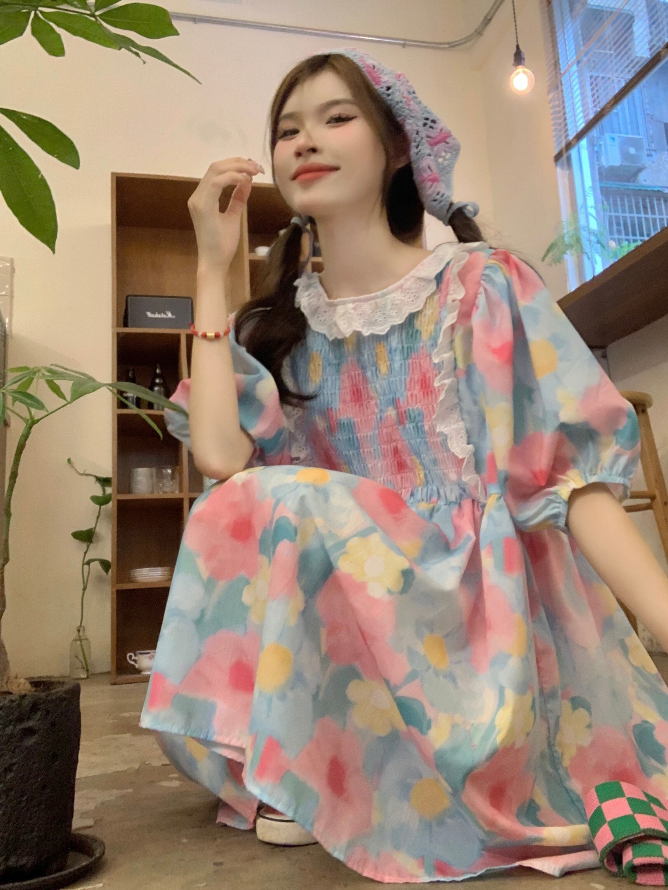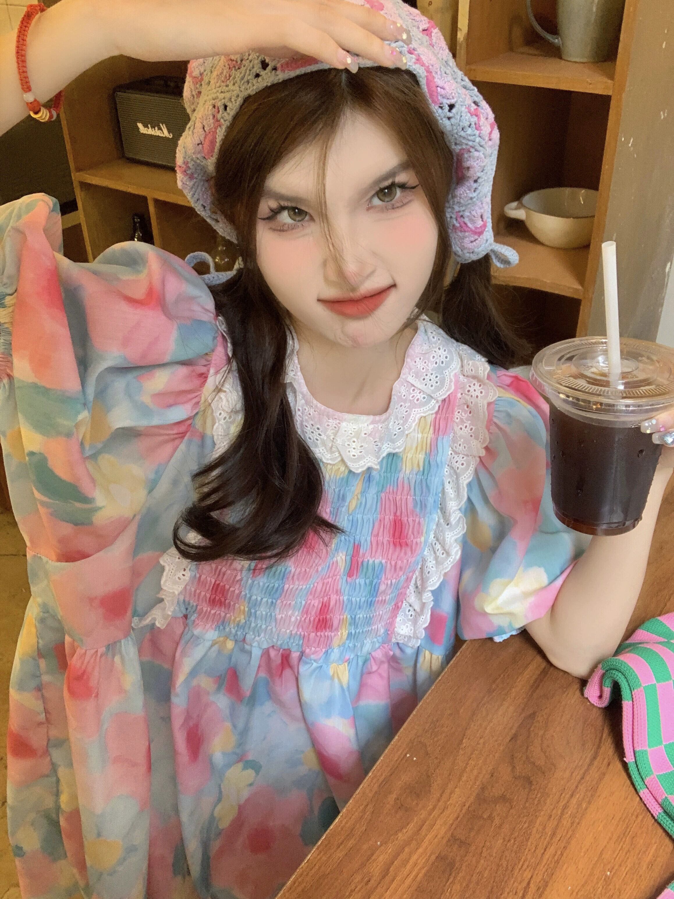 夏用の丈夫なレースの花柄ドレス女性、甘くて年齢を軽減する、小さなパフスリーブ、ゆったりとしたドールスカート 大人ガーリー スウィート キュート カジュアル サマー 夏物 8571626953118352