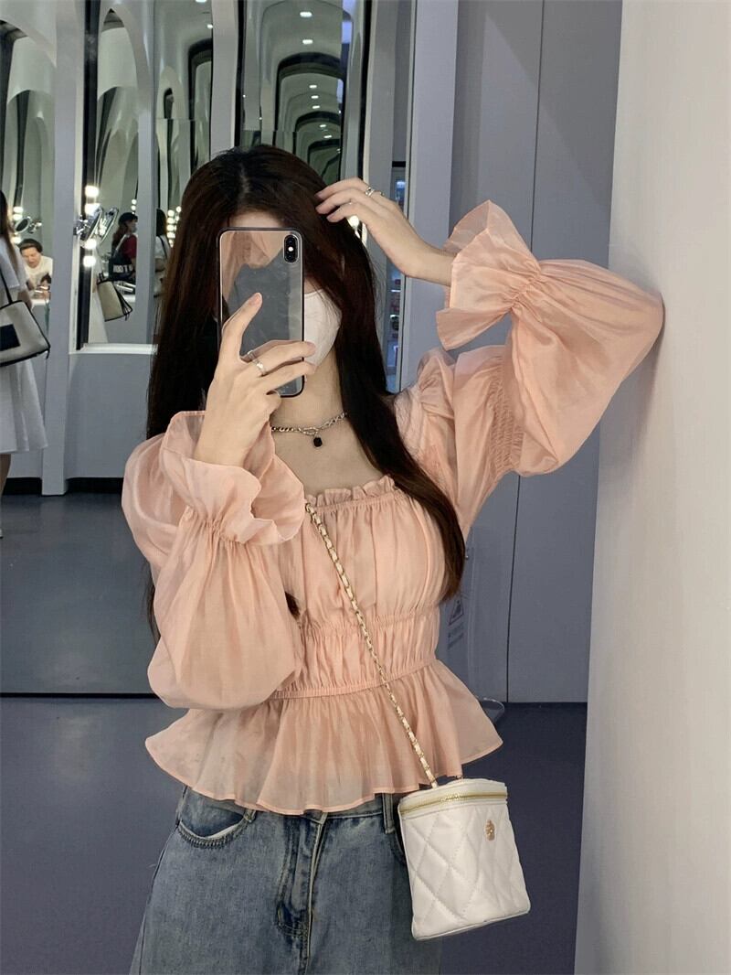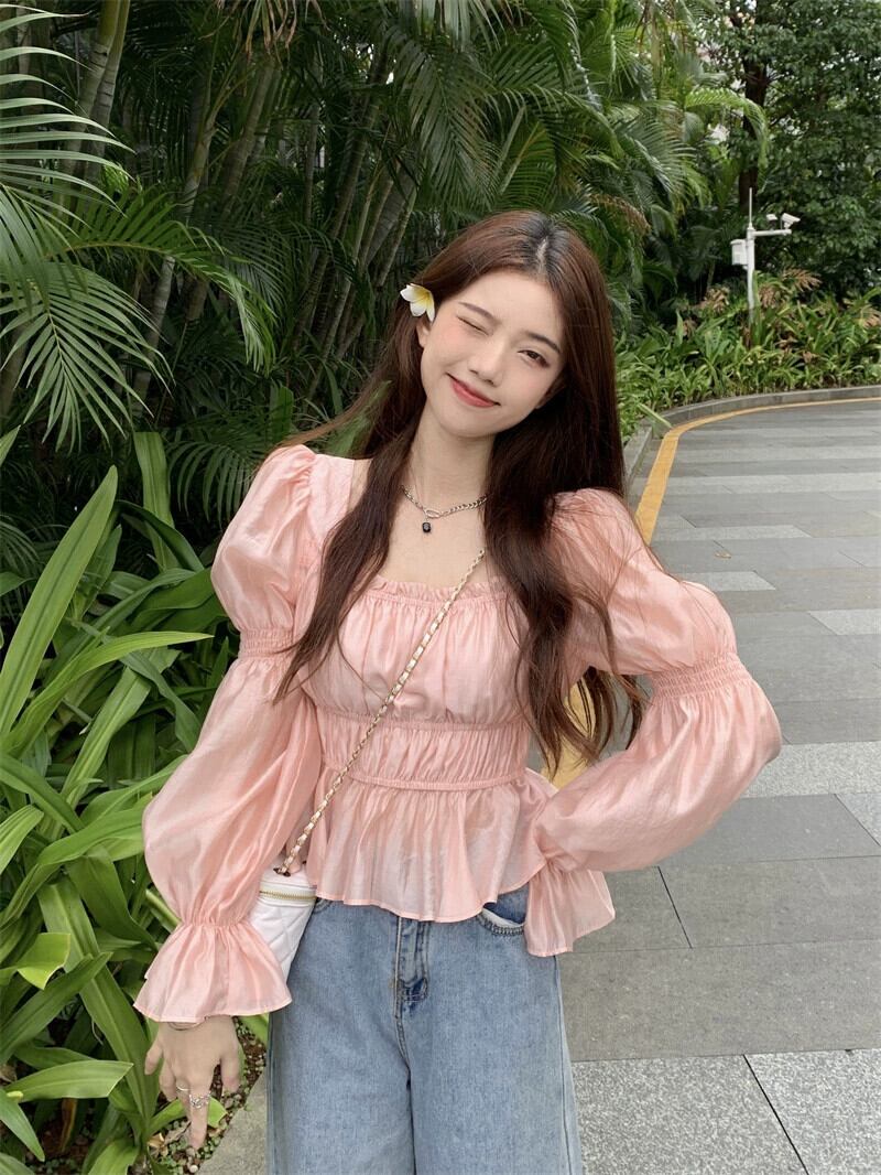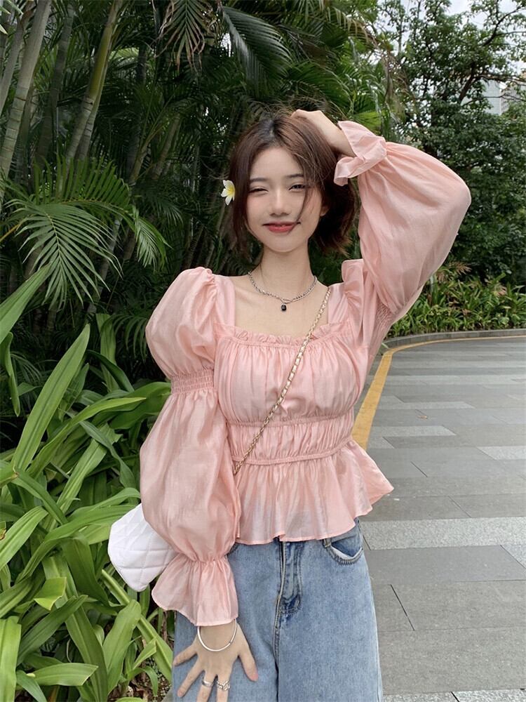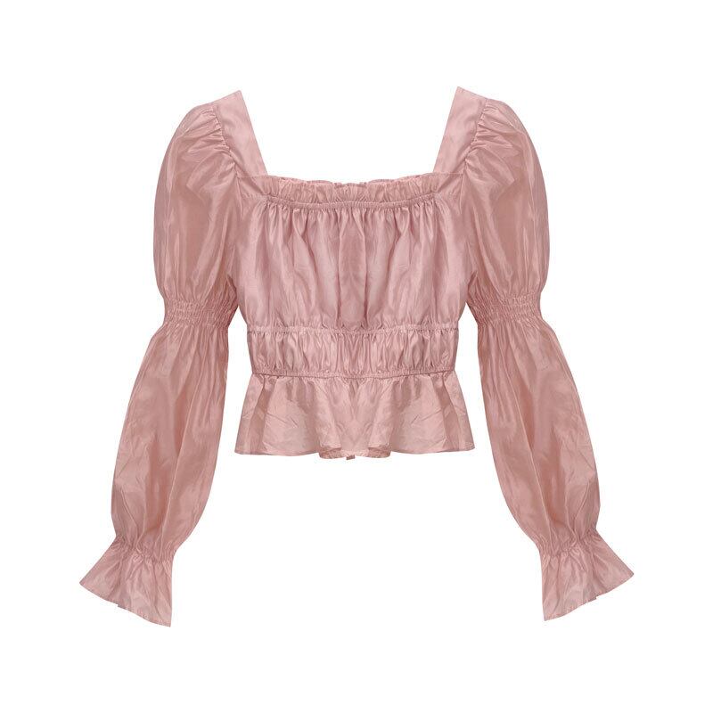 秋のデザインのパフスリーブスクエアネックトップ女性、ニッチフレンチスタイル、ユニークでシックで優しい、ピンクのシャツ オータム 秋物 スクウェア 8571633574305792