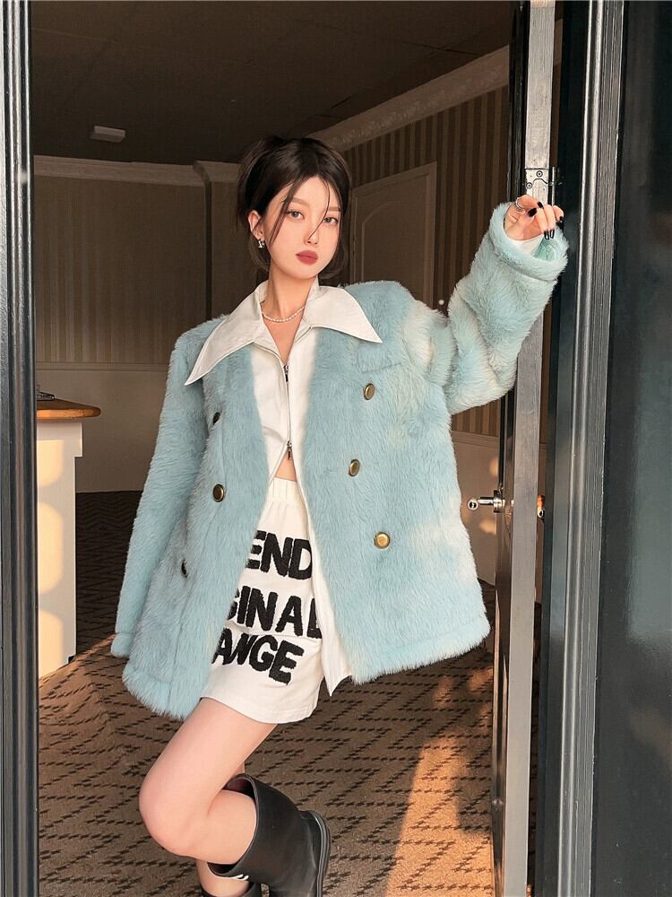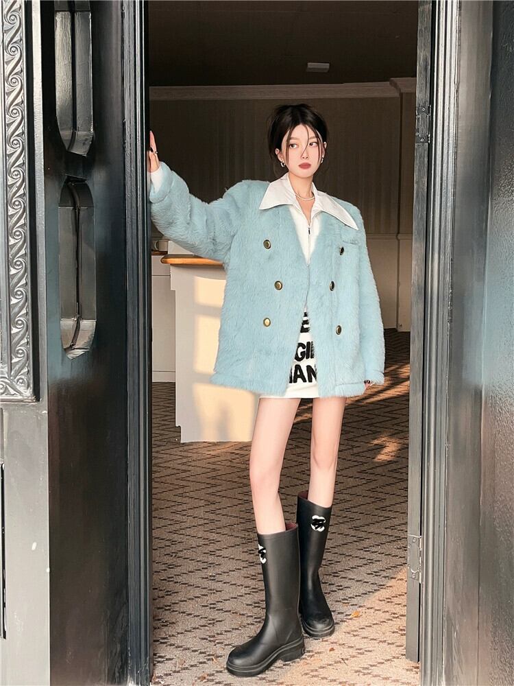 ブルーイミテーションミンクファーコートレディースハイエンドデザインニッチ2023秋冬新作プチトップ オータム 秋物 ウィンター 冬物 8571683205211400