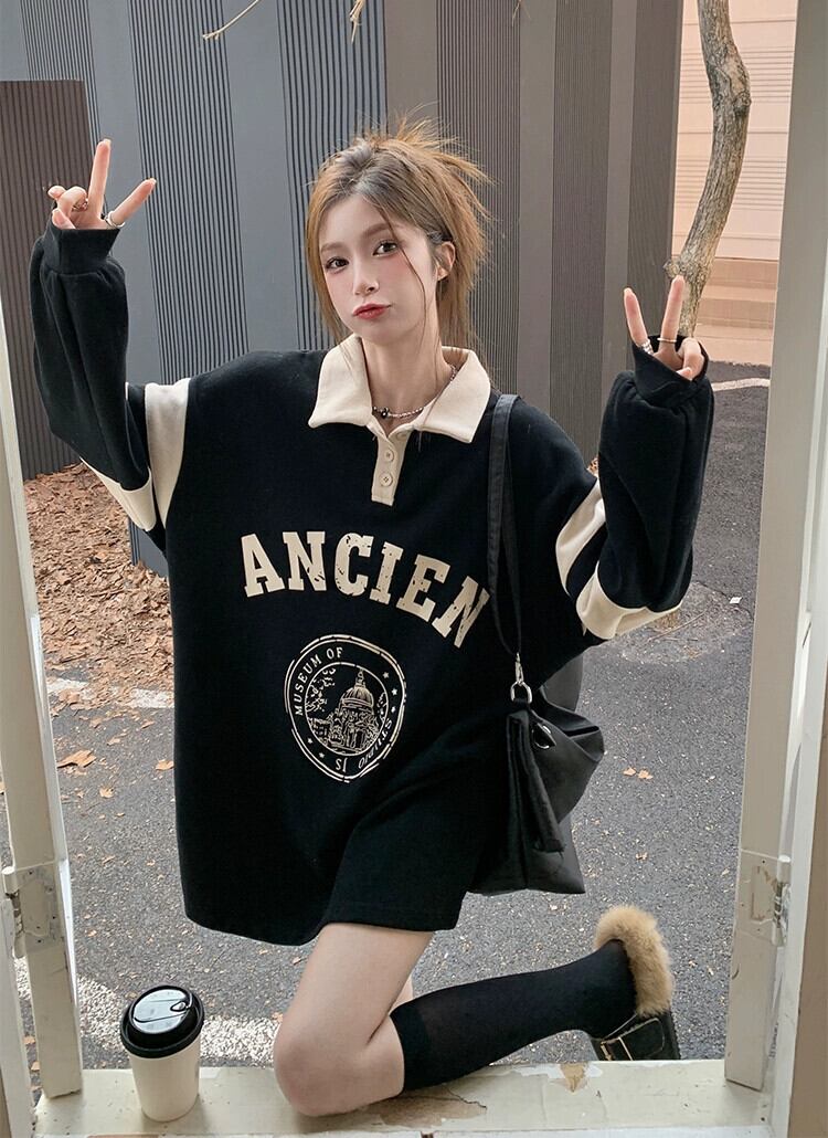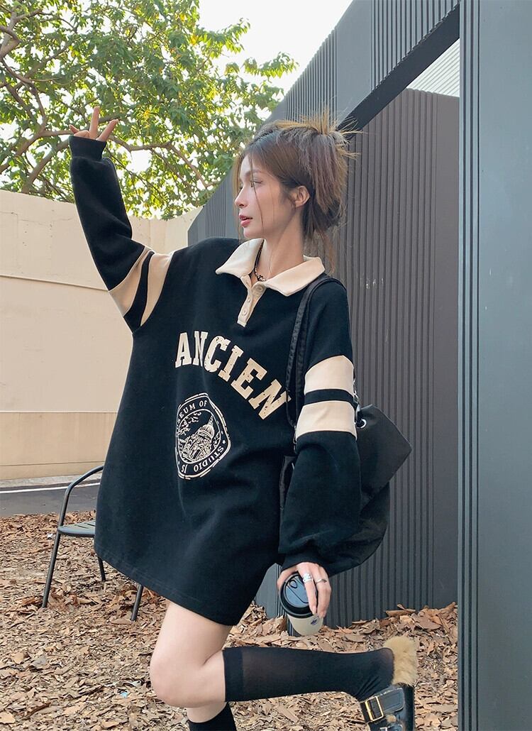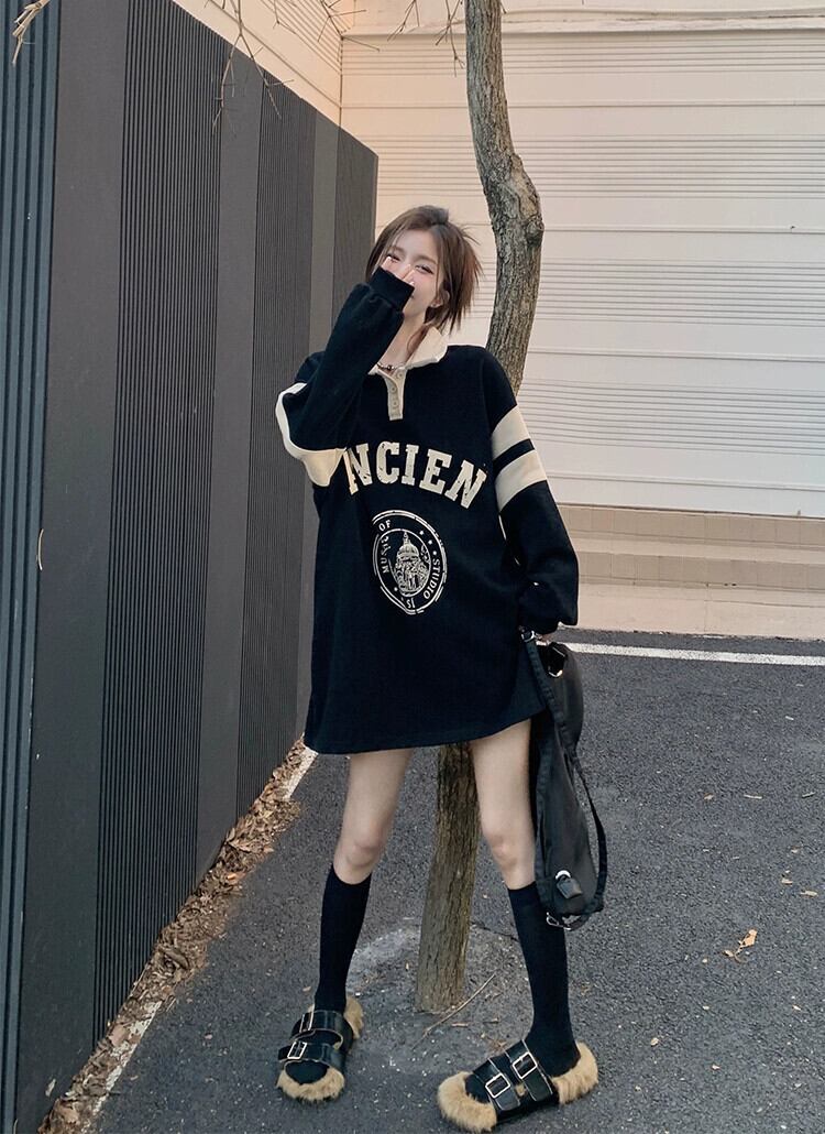 ポロカラースウェットシャツドレス女性の秋肥厚カレッジスタイルブラックデザイン小さなルーズショートスカート オータム 秋物 8571661232626730