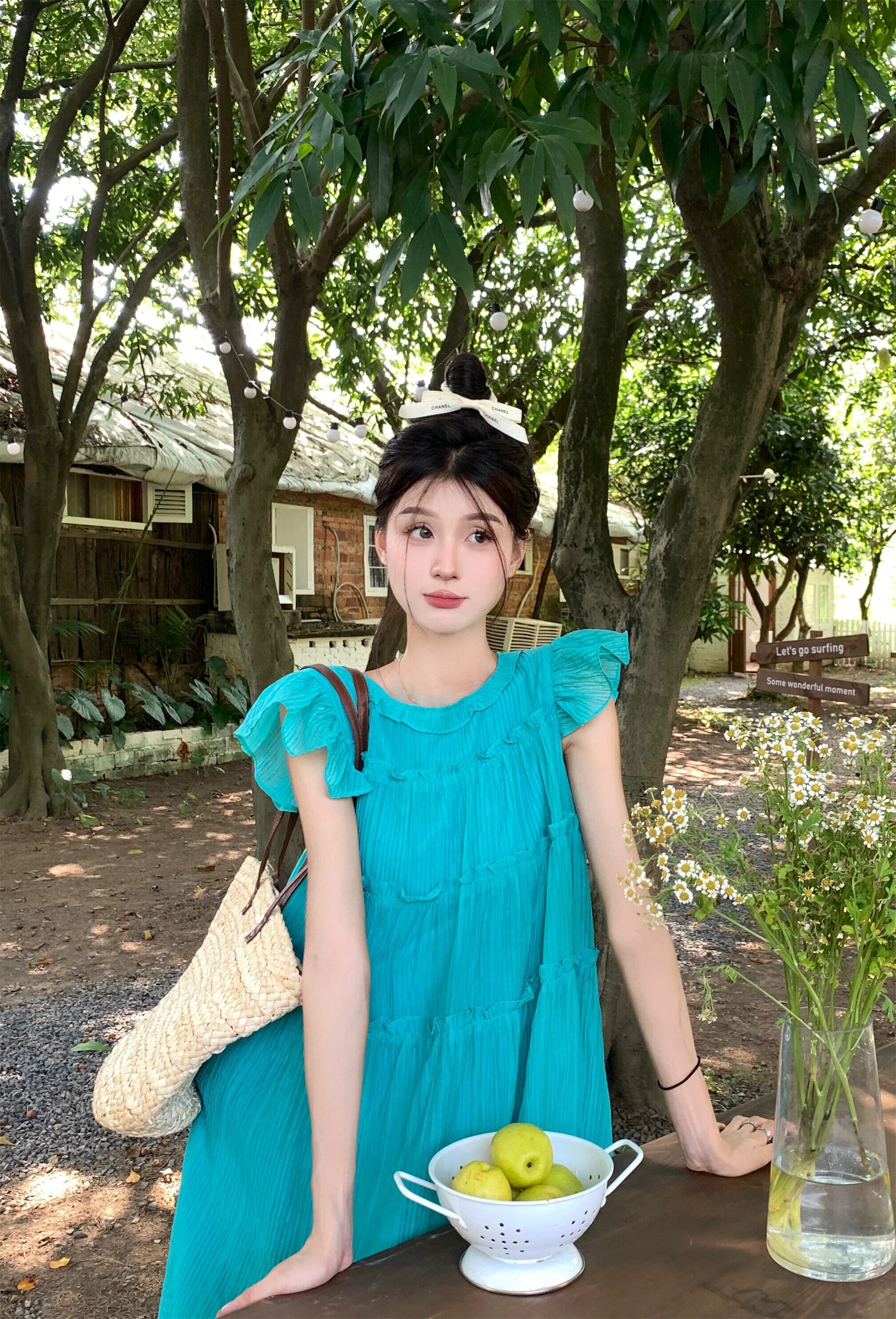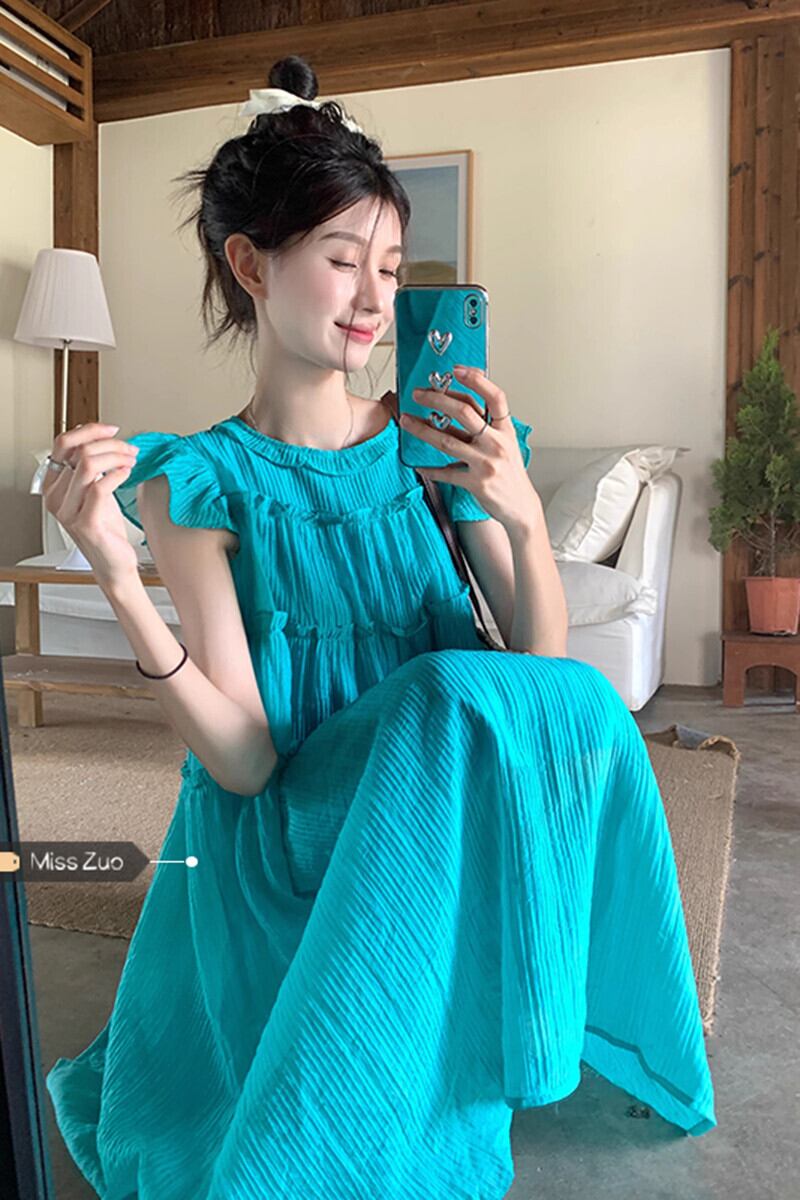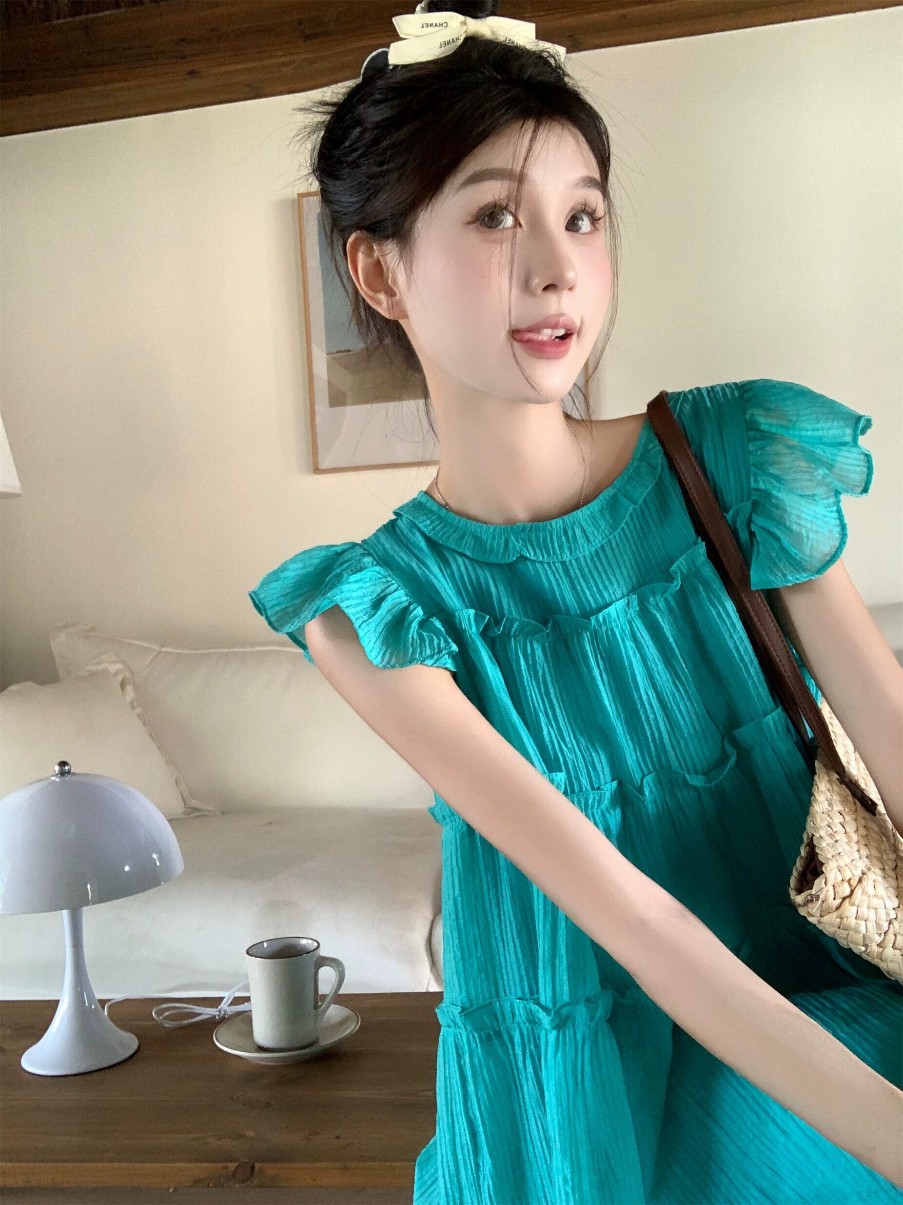 ブルー Feifei スリーブドレス レディース 夏 ドーパミン 甘くて優しい 海辺 リゾートスタイル ゆったり膝上ロングスカート 大人ガーリー スウィート キュート カジュアル サマー 夏物 8571616329656272