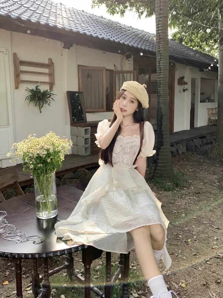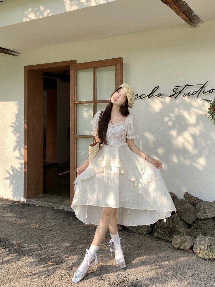 アプリコット スクエアネック パフ スリーブ ドレス レディース 夏 ニッチ フレンチ 初恋 不規則なフリル スカート サマー 夏物 スクウェア 8571620814799243