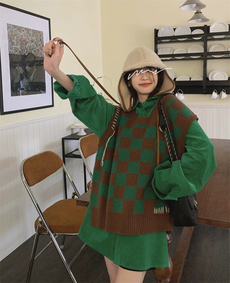 色:緑のシャツ,茶色のシャツ,茶色と青のベスト
