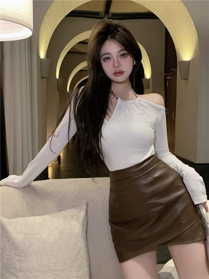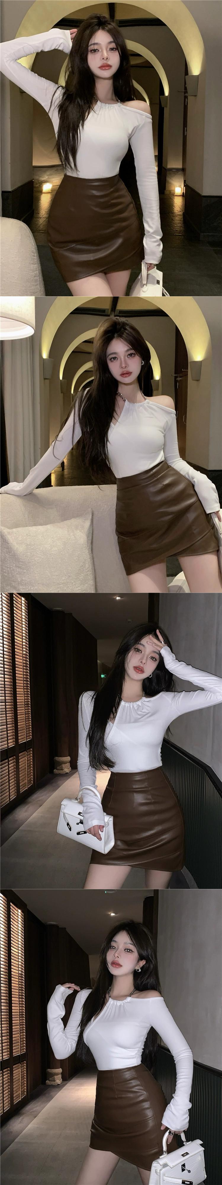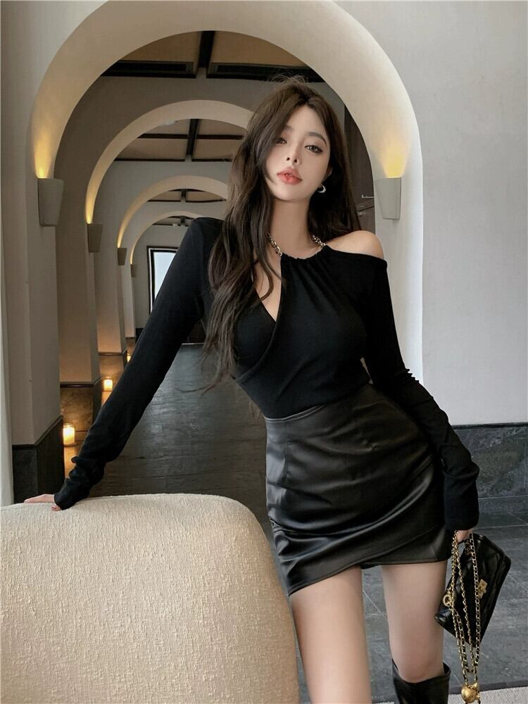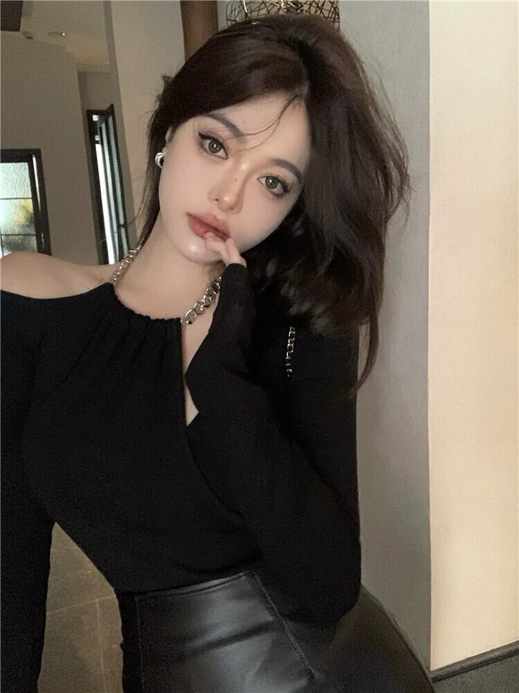 不規則なオフショルダートップ女性 2023 秋の新しい甘いスリムデザイン黒のシックな長袖 T シャツ ロング ブラック 大人ガーリー スウィート キュート カジュアル オータム 秋物 Tシャツ 8571675587872723