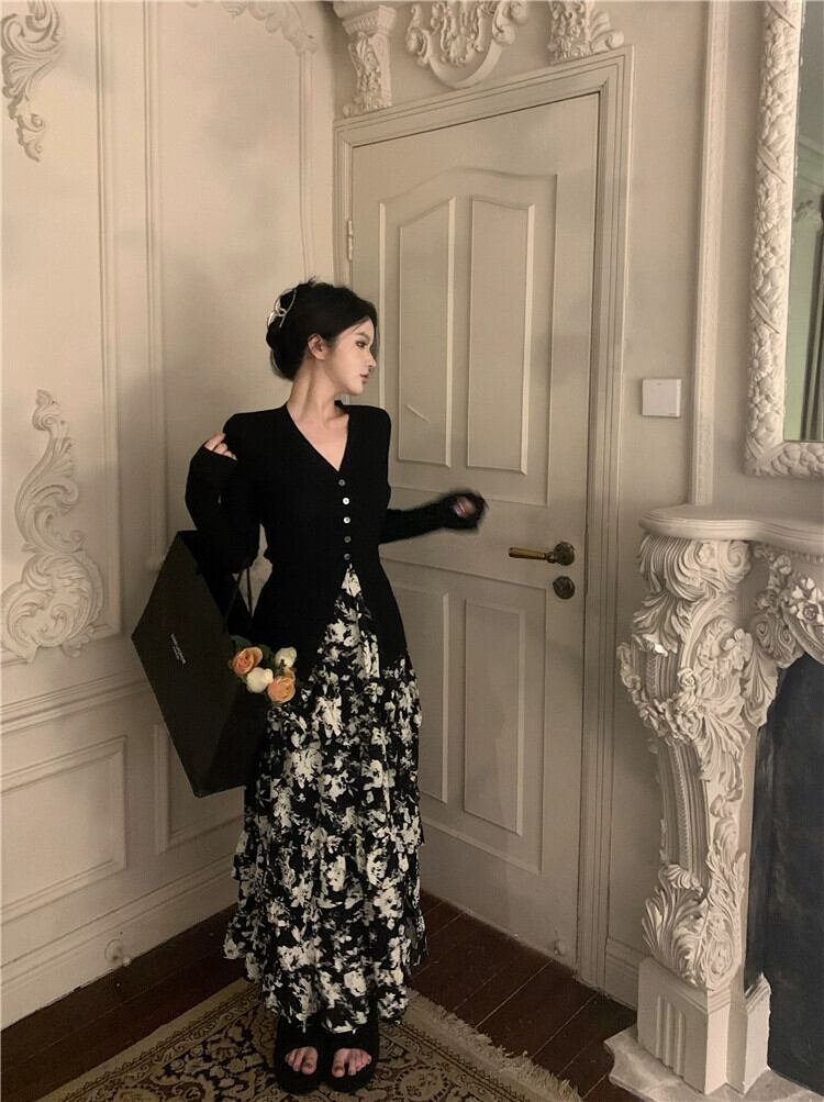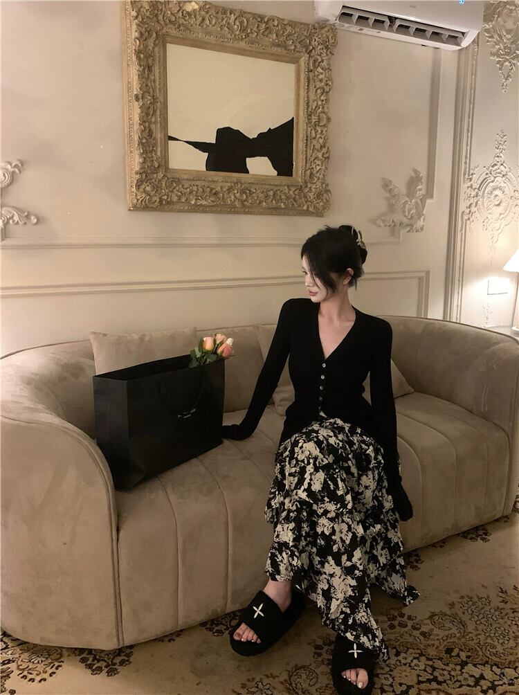 黒の V ネックセーターレディース 2023 春の新作人気スタイル優しいシックなハイエンドニッチトップ ブラック スプリング 春物 Vネック 8571646874165429