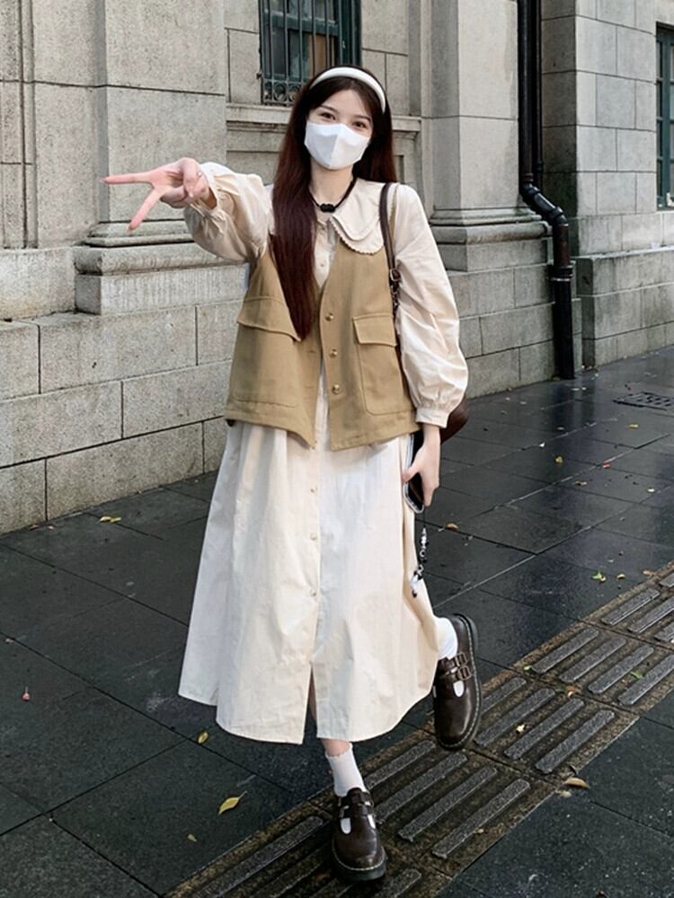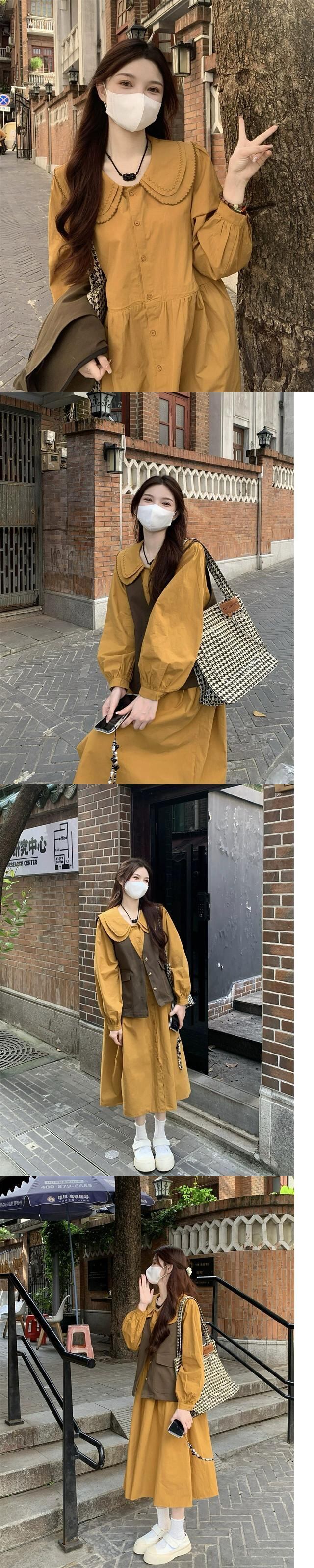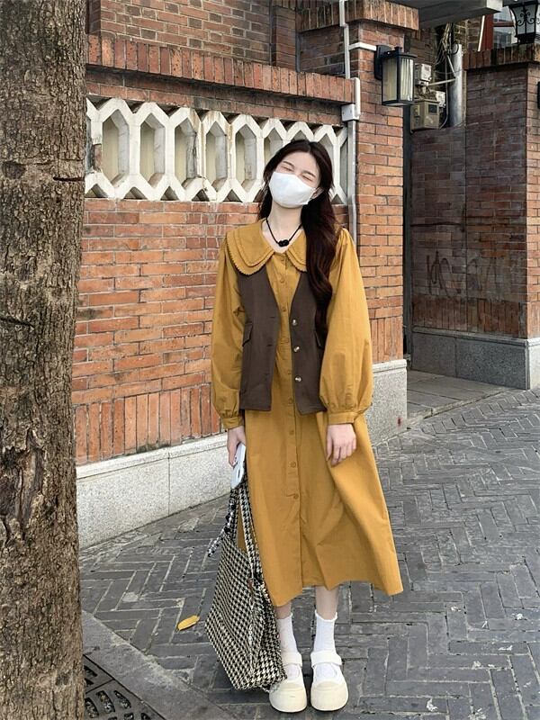 色:オレンジ色のドレス,コーヒーベスト,アプリコットドレス,カーキベスト