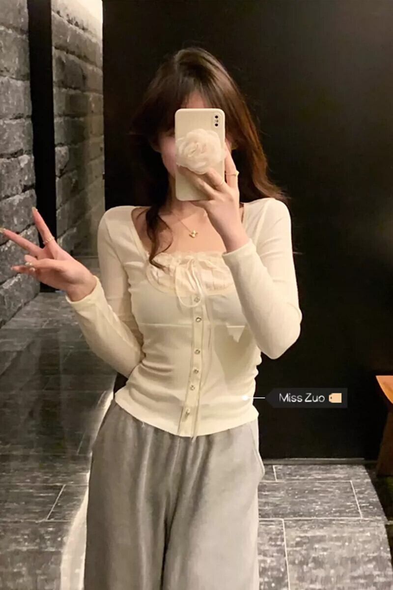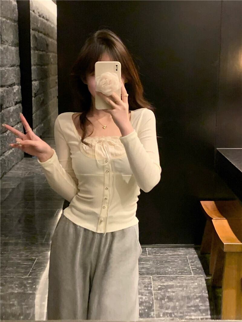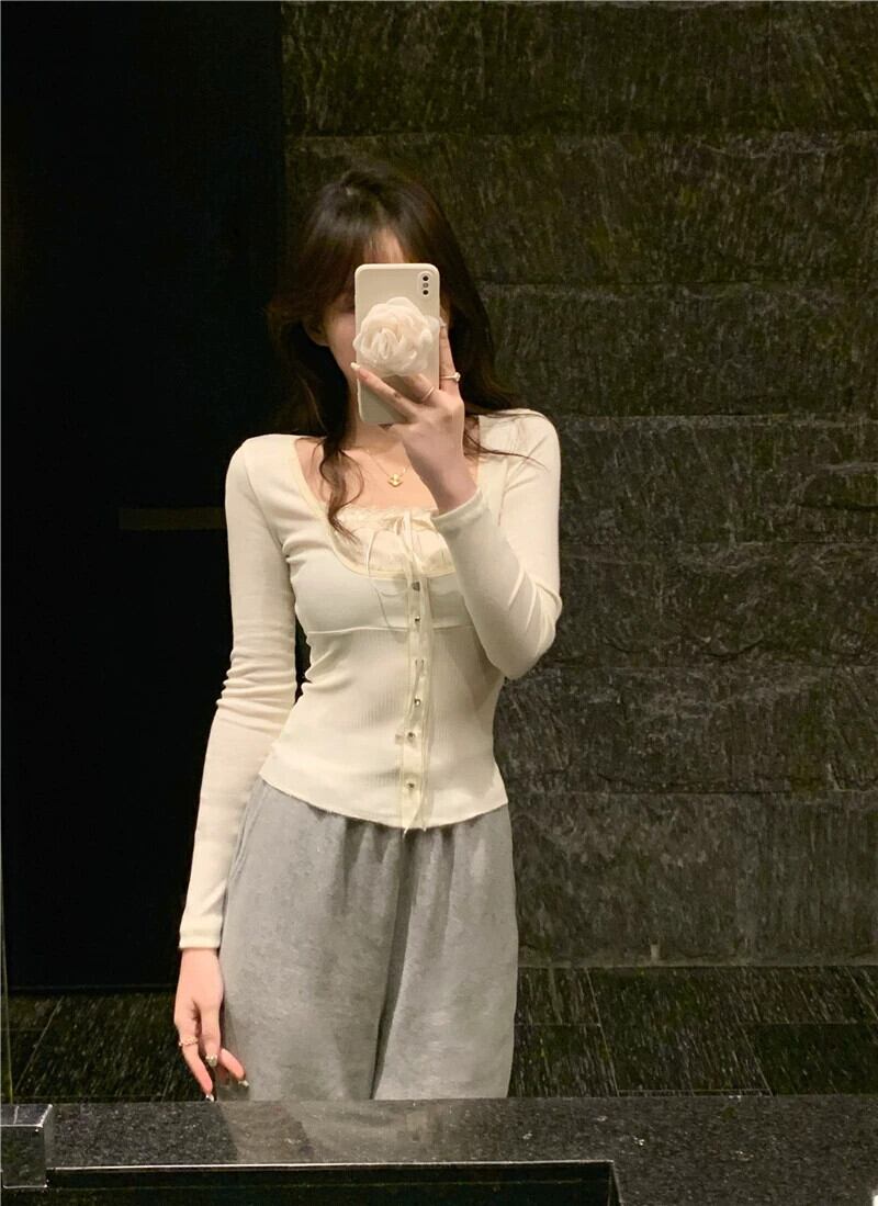 Sweet Hot Girl レース スクエアネック トップ レディース 秋と冬 スリムフィット ボトリング シャツ ユニークでユニークな長袖 Tシャツ付き ロング 大人ガーリー スウィート キュート カジュアル オータム 秋物 ウィンター 冬物 スクウェア 8571644237735500