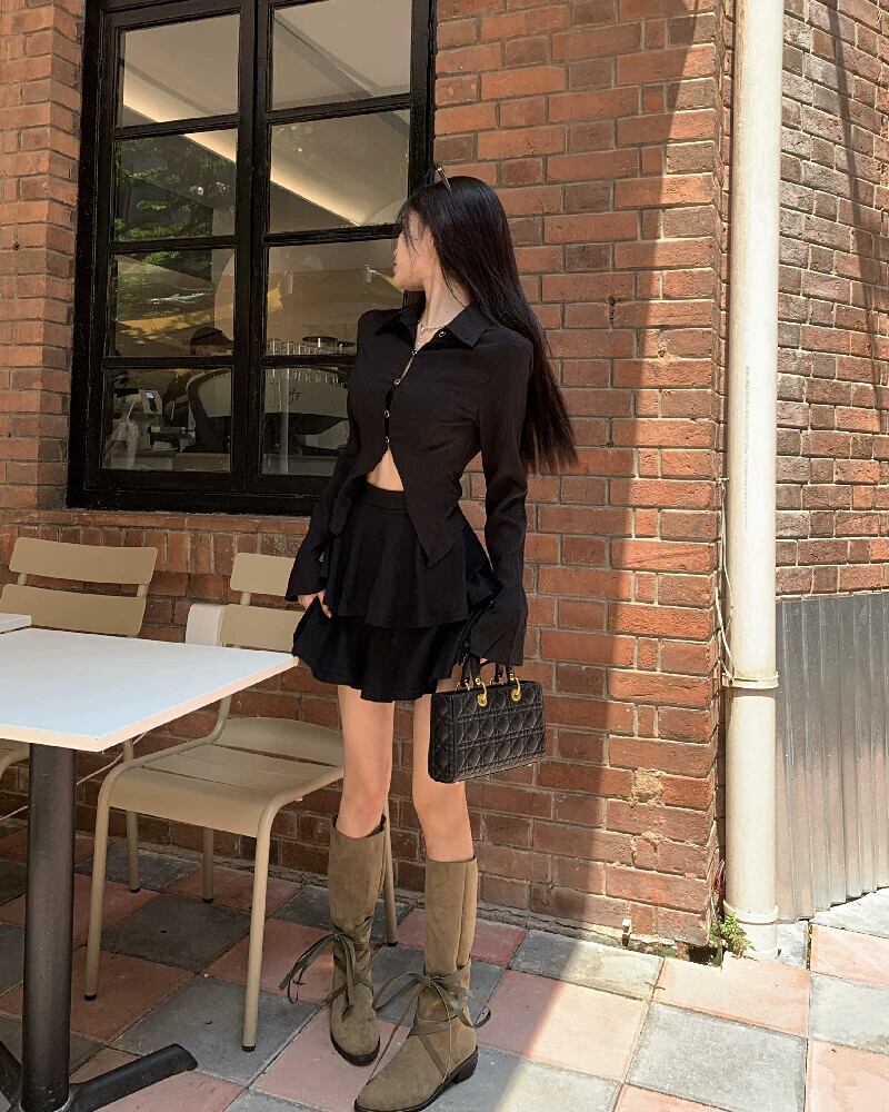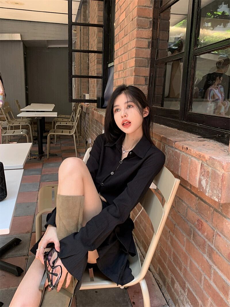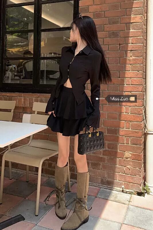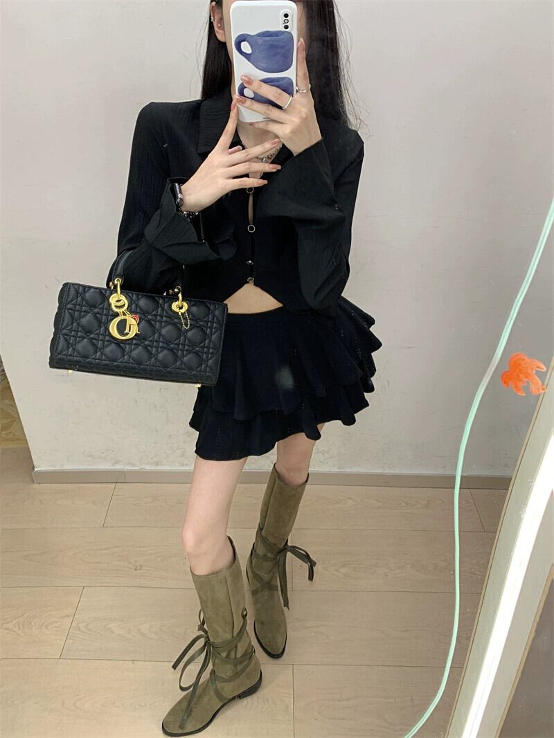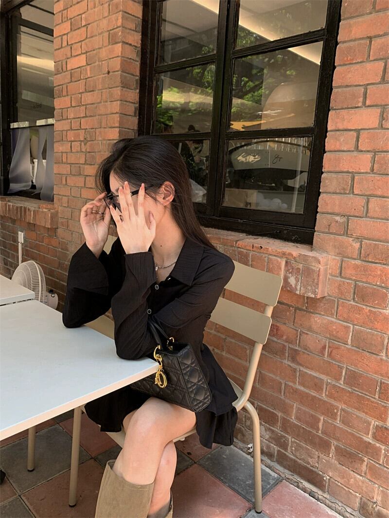 不規則なショートトップス女性ニッチデザイン2023初秋の新しい純粋な光沢のある甘いネクタイ黒長袖Tシャツ ロング ブラック 大人ガーリー スウィート キュート カジュアル オータム 秋物 ピュア 8571626839003994