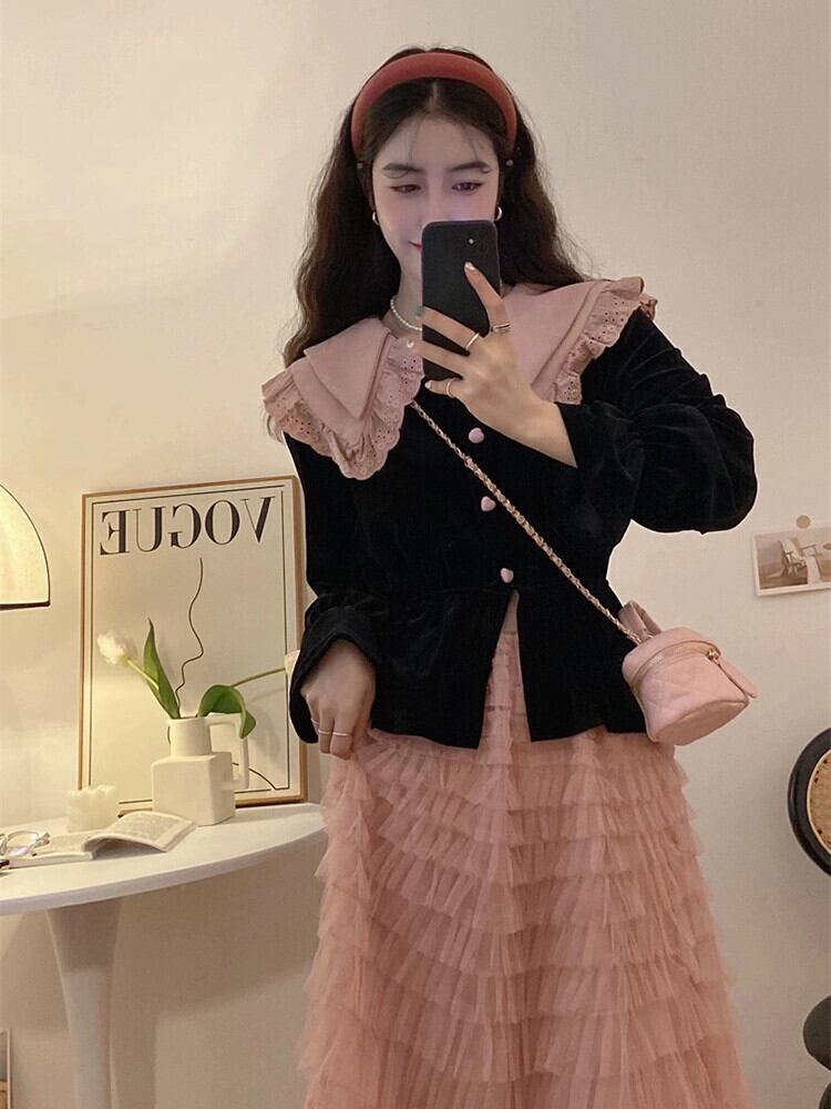 ブラックドールカラーシャツレディース、秋デザイン、ニッチフレンチスタイル、ユニーク、シック、ハイエンド、気質のあるベルベットトップ オータム 秋物 8571672959197044