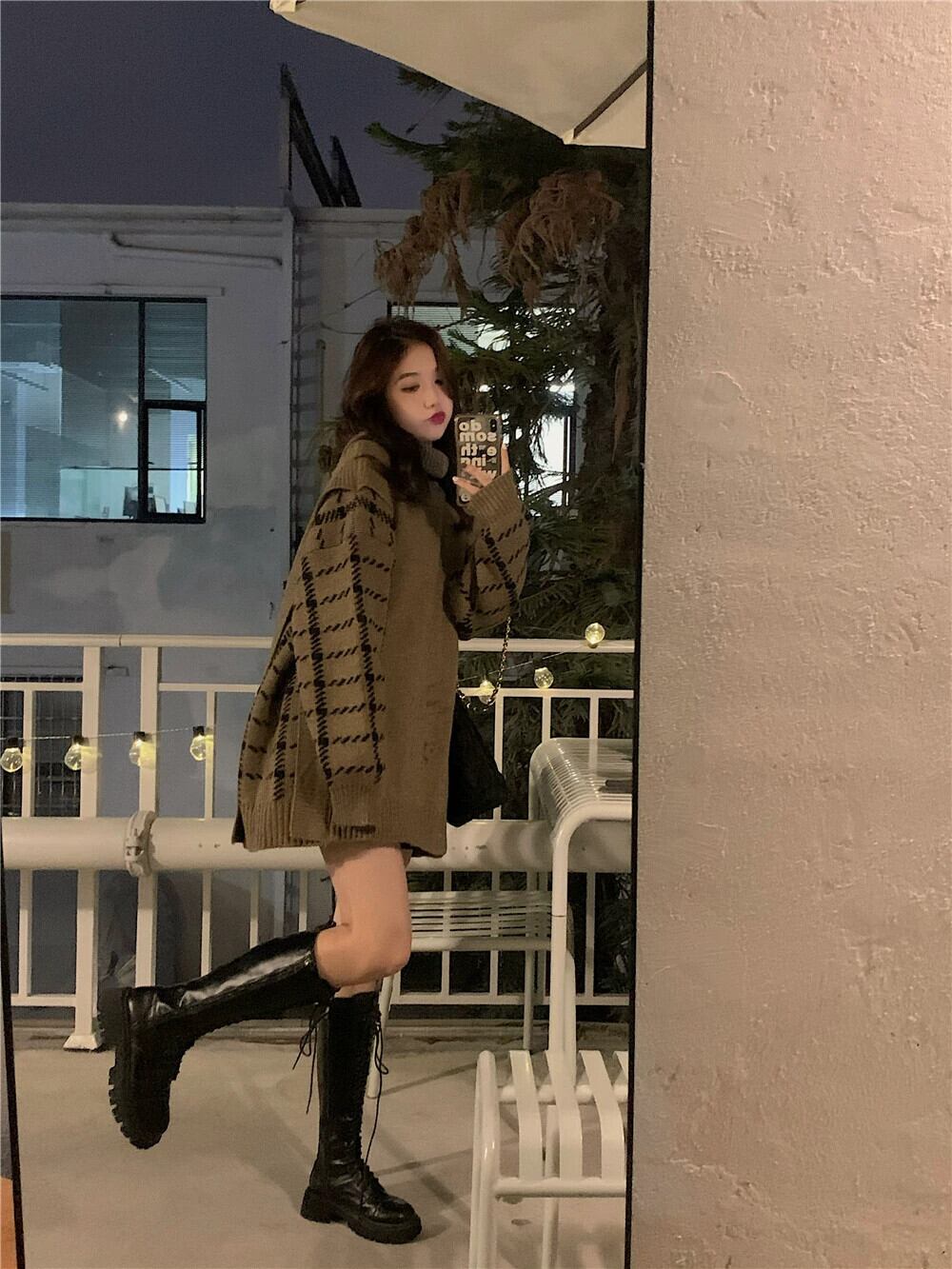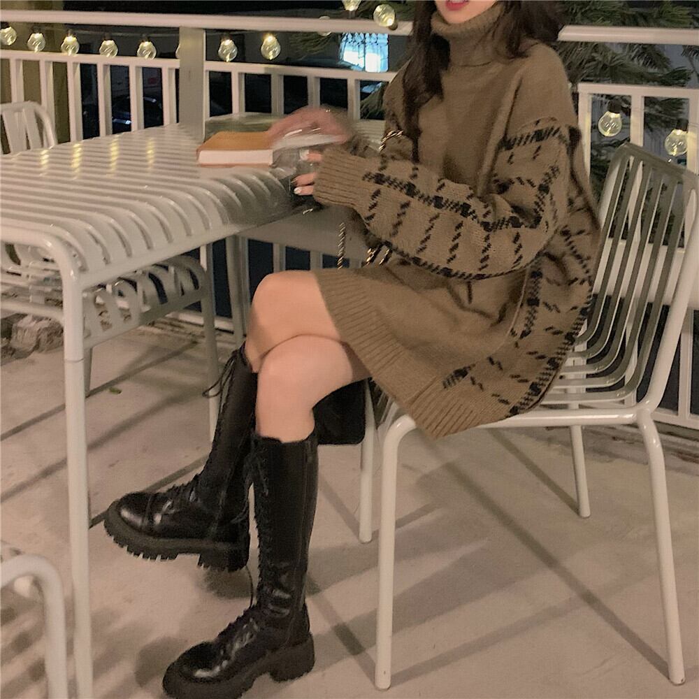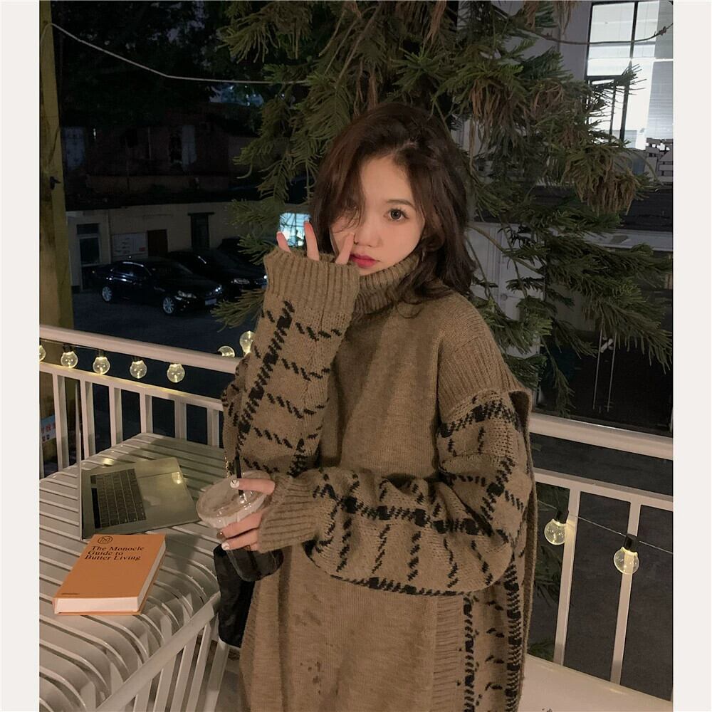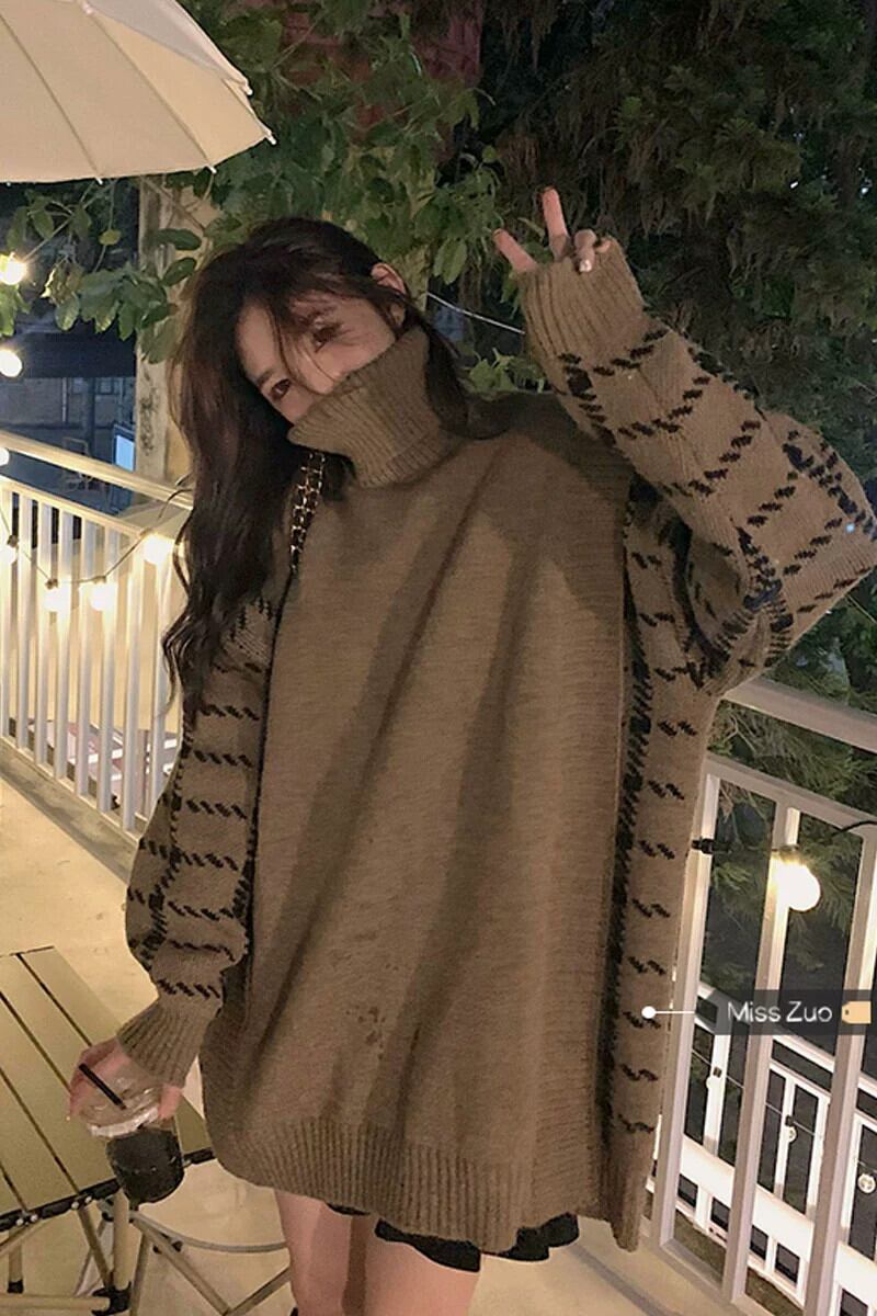 カーキ タートルネック セーター レディース 2023 秋冬 ルーズ レイジー ニッチ ミドル丈 トップ オータム 秋物 ウィンター 冬物 8571625923845193