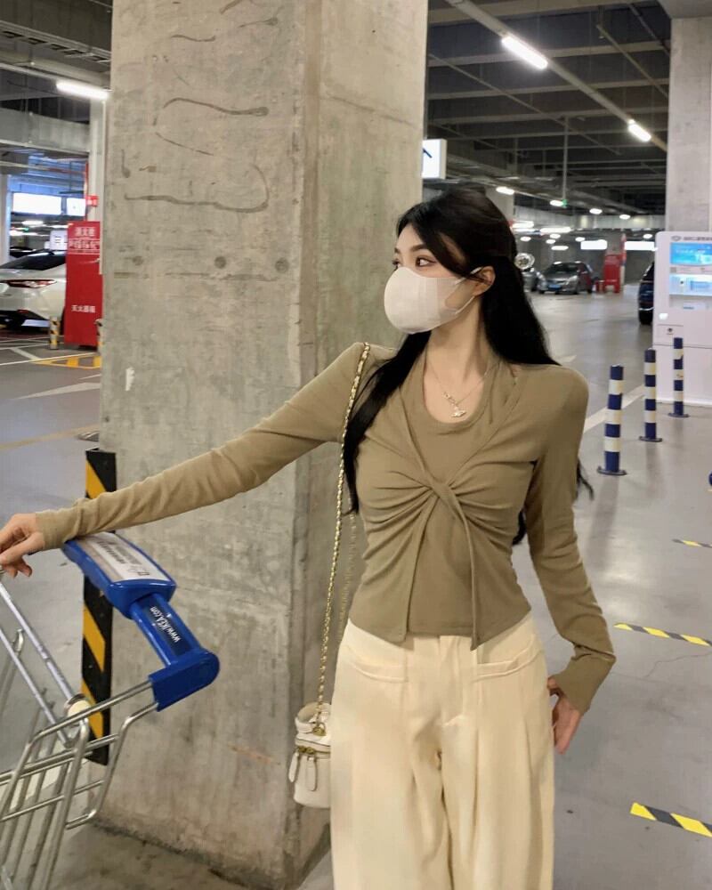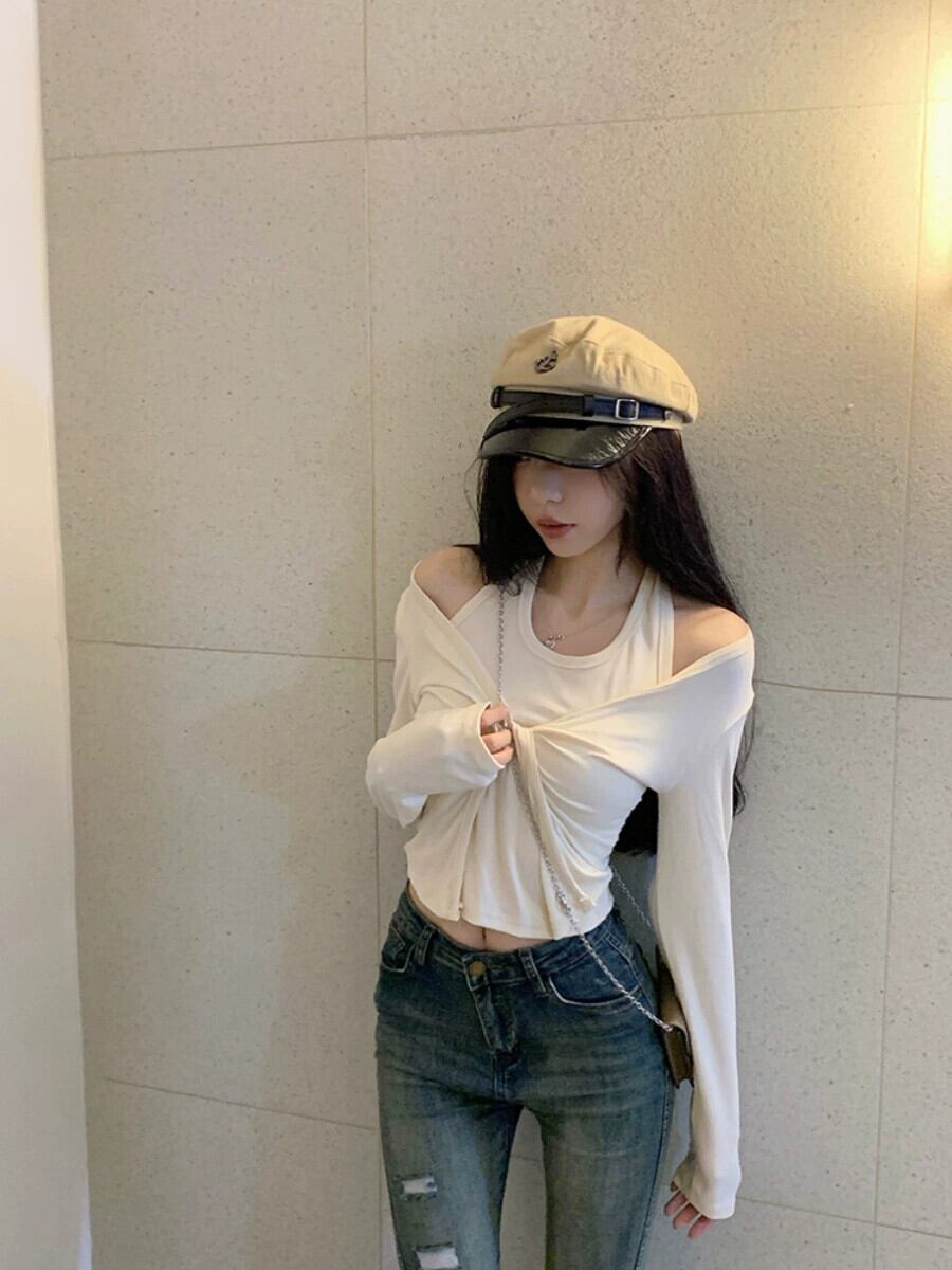 偽ツーピースホルターネックショートトップ女性の秋の2023新しい純粋な欲望甘くてスパイシーなボトムシャツ白長袖Tシャツ ロング ホワイト 大人ガーリー スウィート キュート カジュアル オータム 秋物 ピュア 8571697174886202